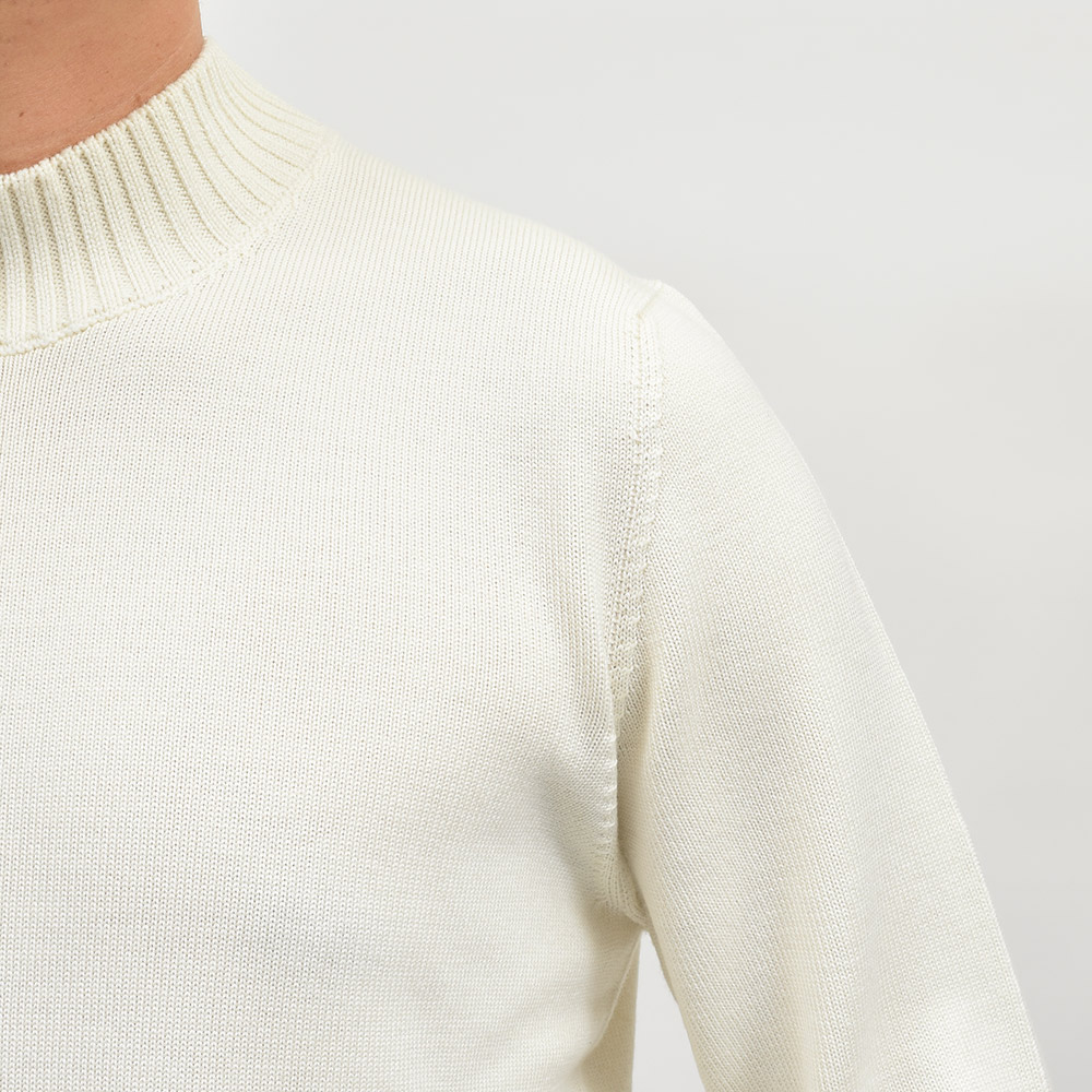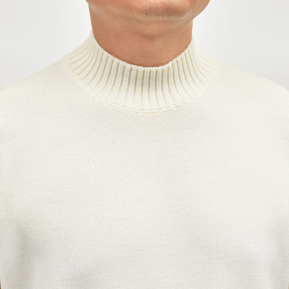 サイズ50でジャストサイズです。スッキリとしたシルエットで程よくゆとりがあります。定番8Gニットを使用したモックネックです!