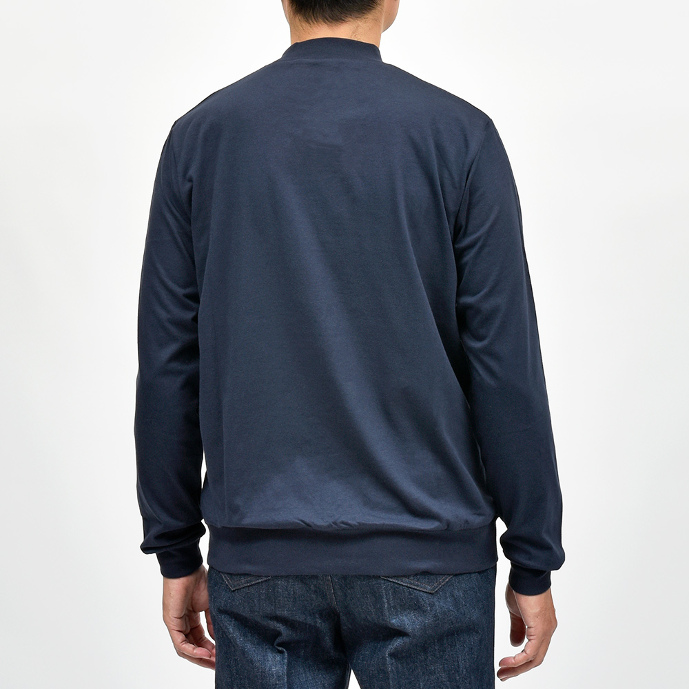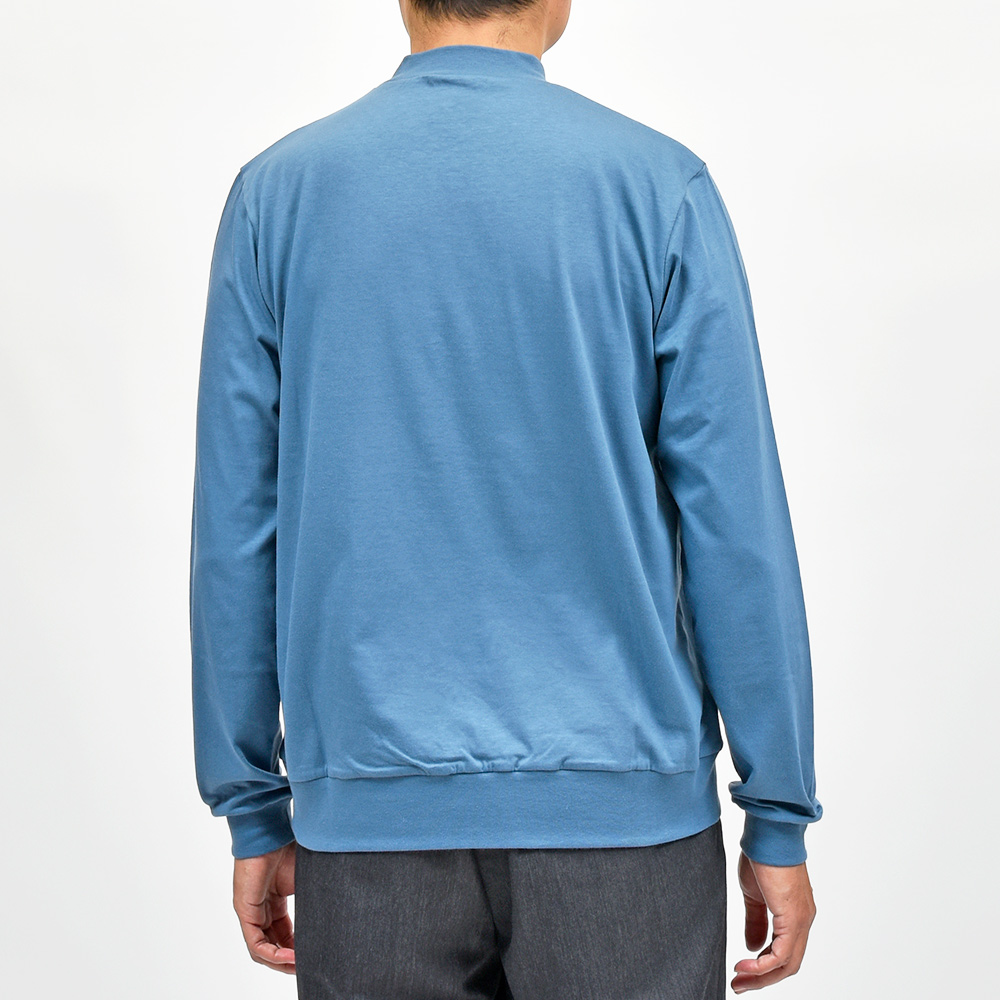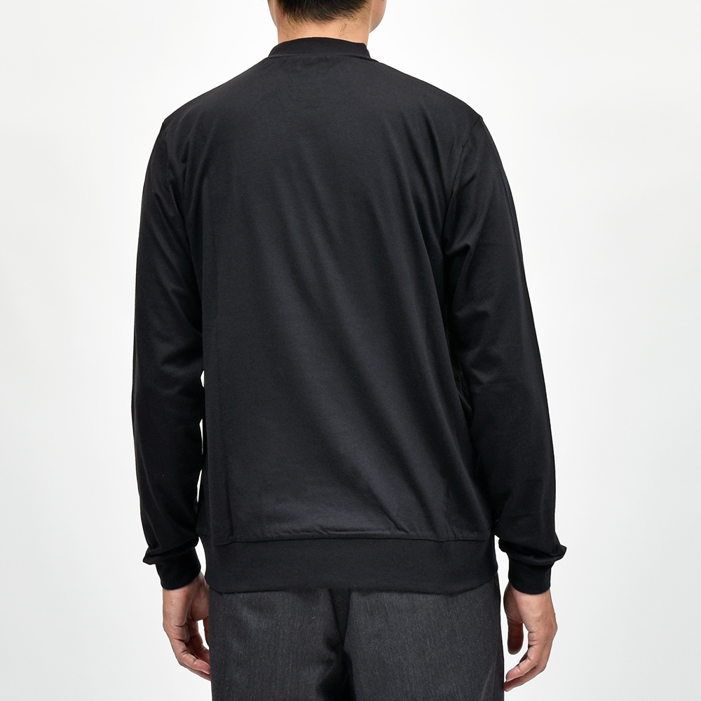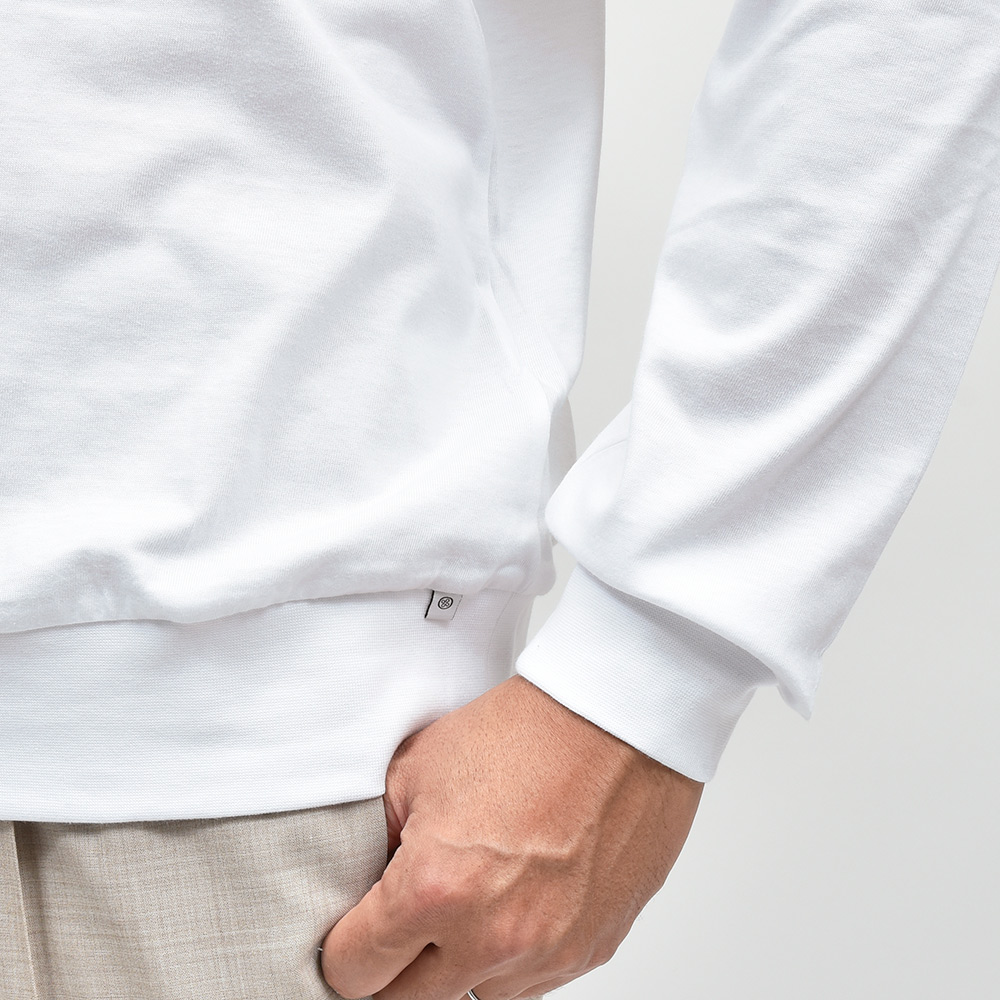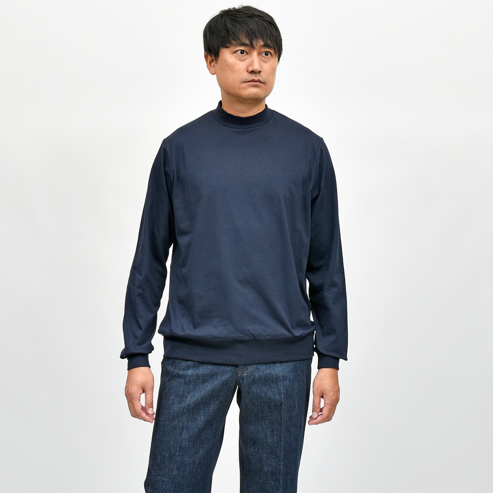あまり透け感の出ない適度な厚みのスムースコットンを使用したこちらは、袖口と裾をキックバックに優れたリブ仕様にすることで、スウェットやニットライクな雰囲気を醸し出してくれます。肩はややドロップしており、身幅にはゆったりとした余裕があるため、リラックス感のあるパンツとの相性はバツグン。ディレクターの中新井淳平氏が得意とする、上品なカジュアルスタイルを完成させてくれる一枚となっています。また、防縮加工を施しており洗濯後の縮みが出にくくなっています。