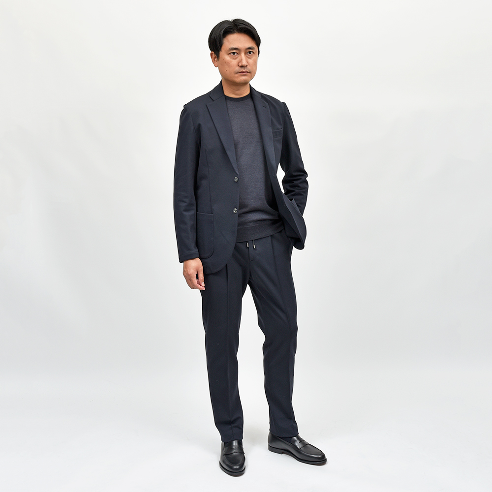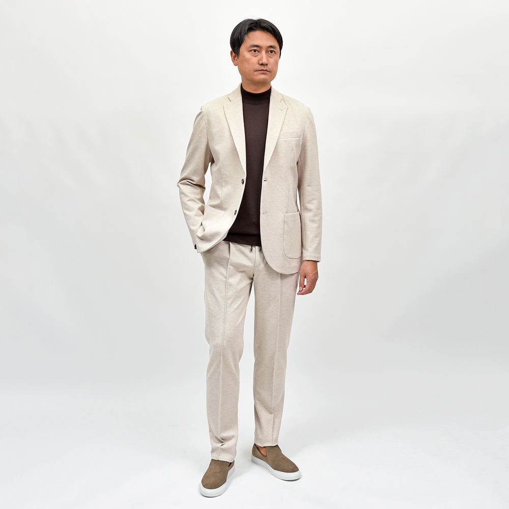 今の時代、常識となったジャージーのセットアップですが、やはりココンチが醸し出す色気は注目に値する一着です。