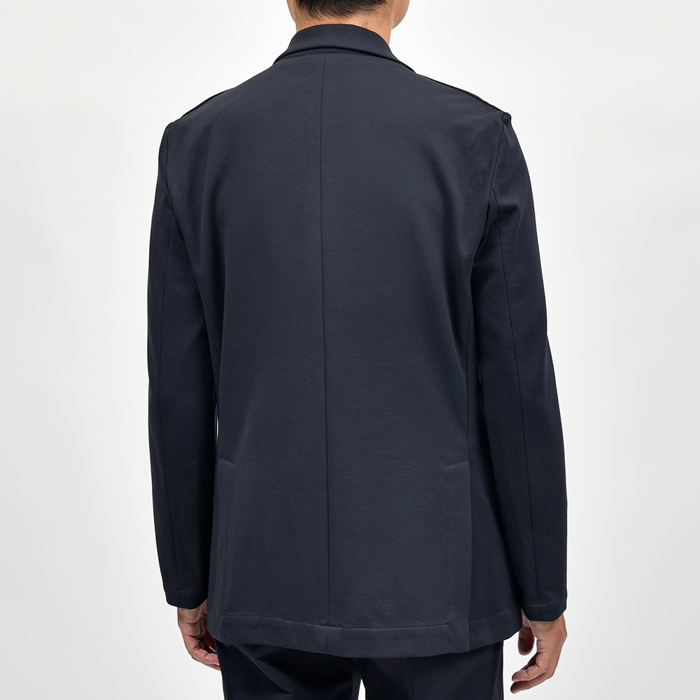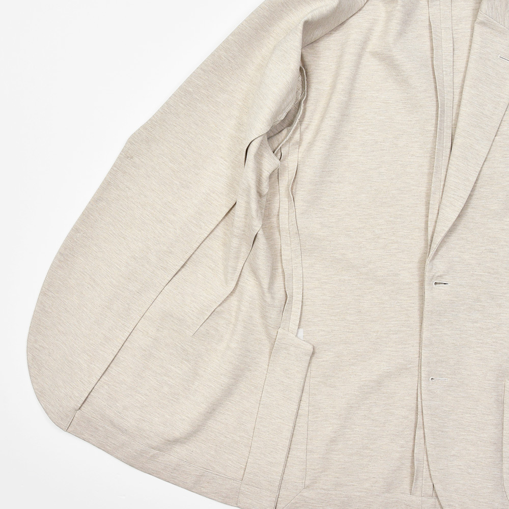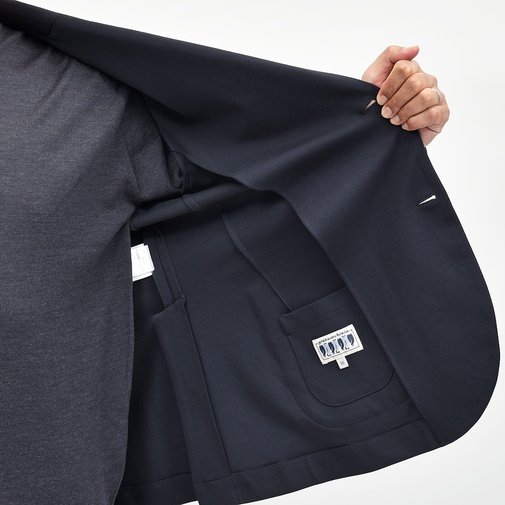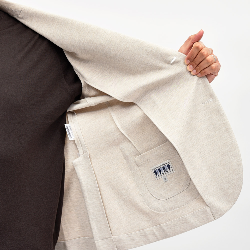 giabsarchivioのジャケットラインのモデル“STROZZI(ストロッツィ)”。イージーなパンツを得意とするブランドですので、ドレスライクなジャケットではなく、アンコンで裏地もない筒袖仕上げで、あくまでも気軽に羽織れる仕上がりとなっています。しかしながら、現代の実情を見ているとこのくらいのジャケットで十分というシーンはよくある事ですので、デザイナーの中新井氏らしい痒い所に手が届く一品です。