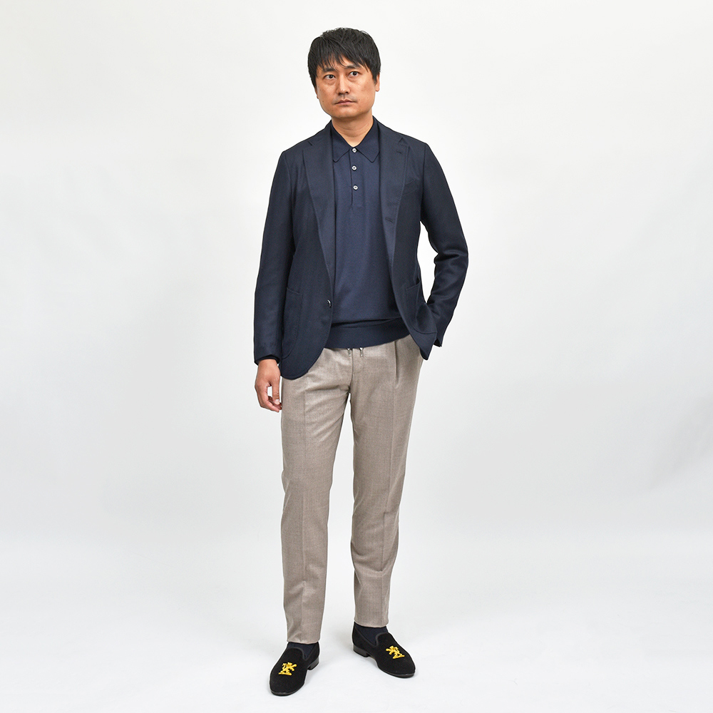 目付け240gとやや軽い生地感のサキソニーは、ヴァージンウールの滑らかな手触りに張りと光沢のある上品な質感。キレイめ見えする生地ですがストレッチが効いており穿き心地はストレスフリーです。また、大人のためのリラックスパンツを謳う“SOFT FIT”ですので、リラックスした雰囲気を高めてくれるドローコード仕様は好相性。上品なウール主体の素材ですので、ラフなジャケットと合わせてもすんなりと馴染んでくれます。