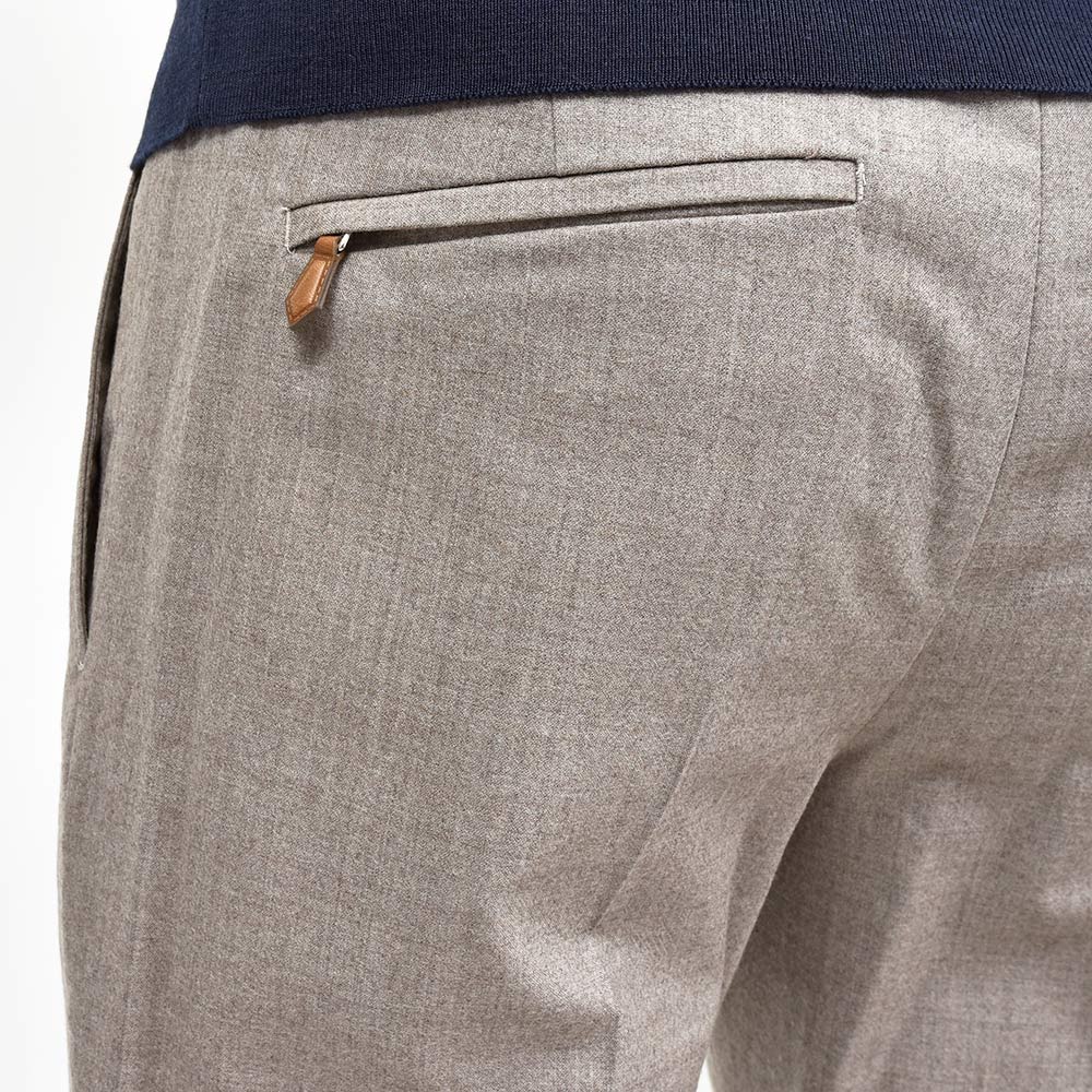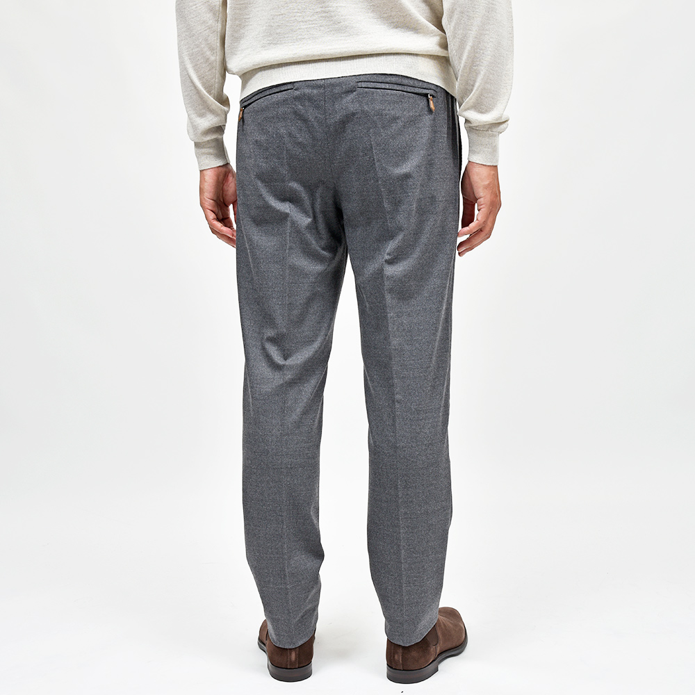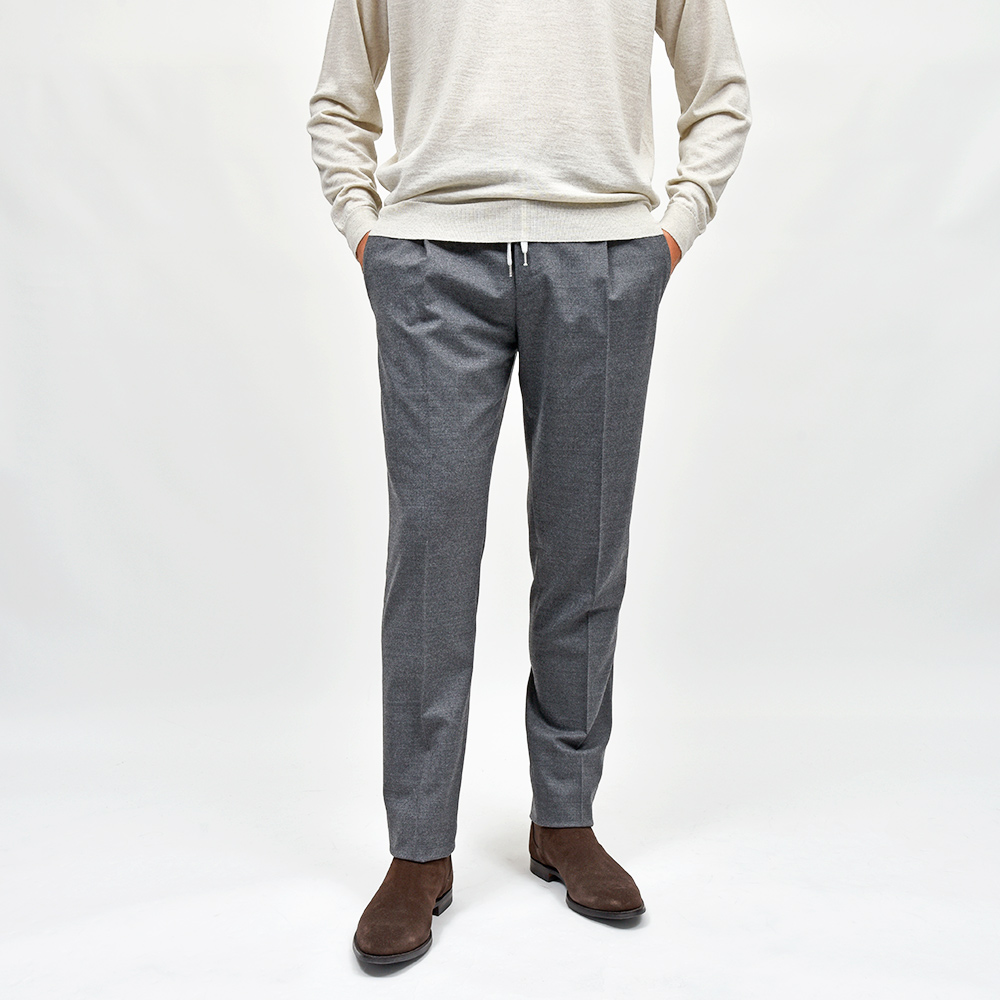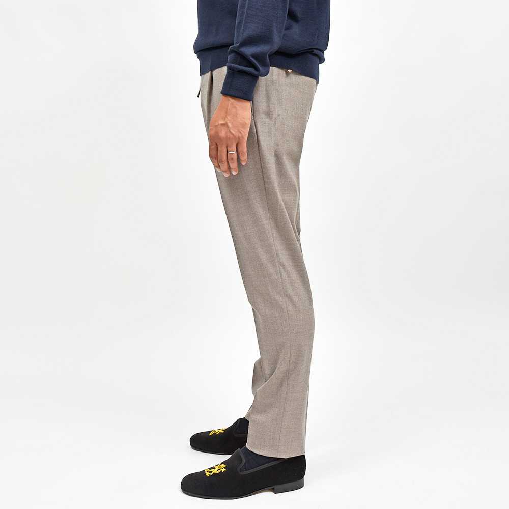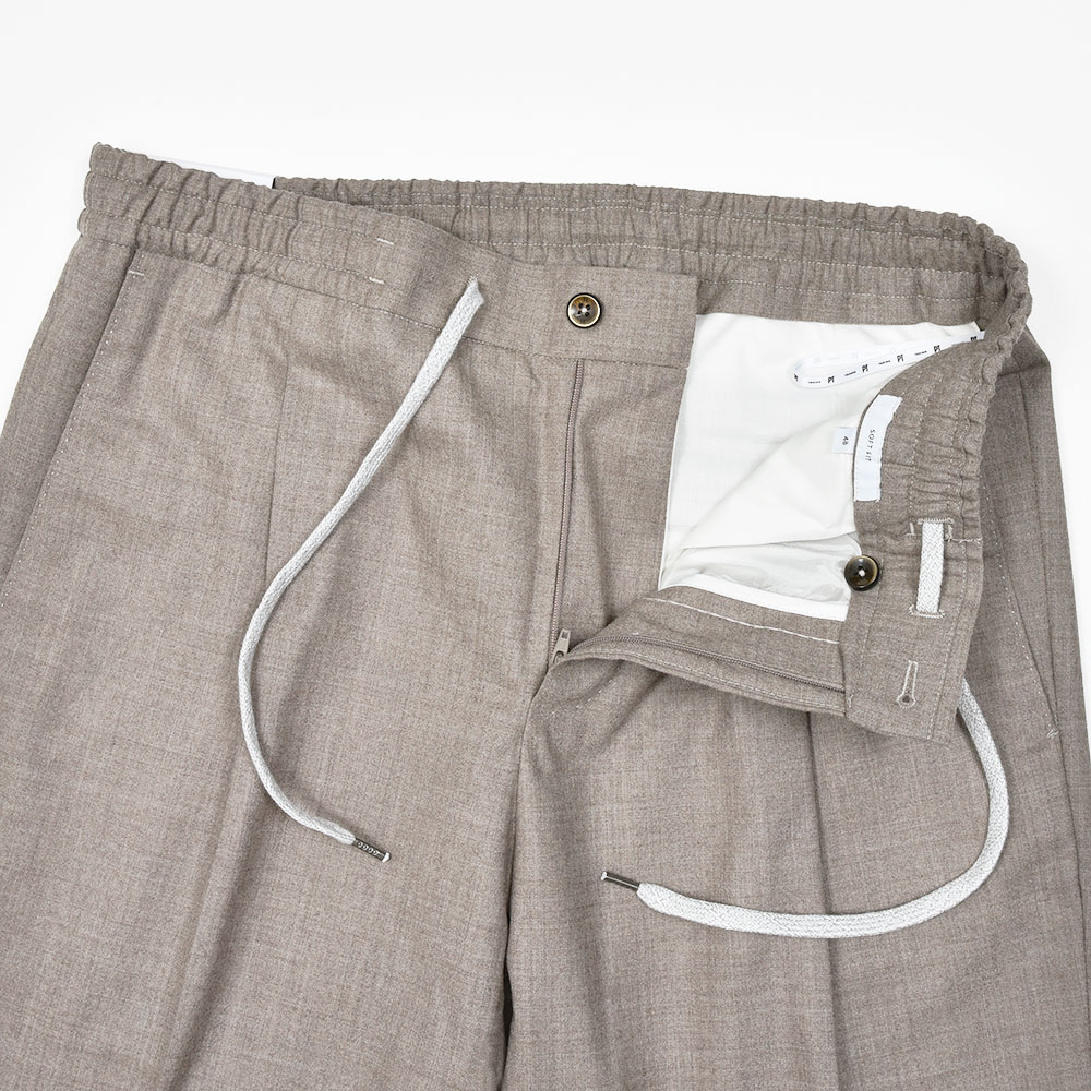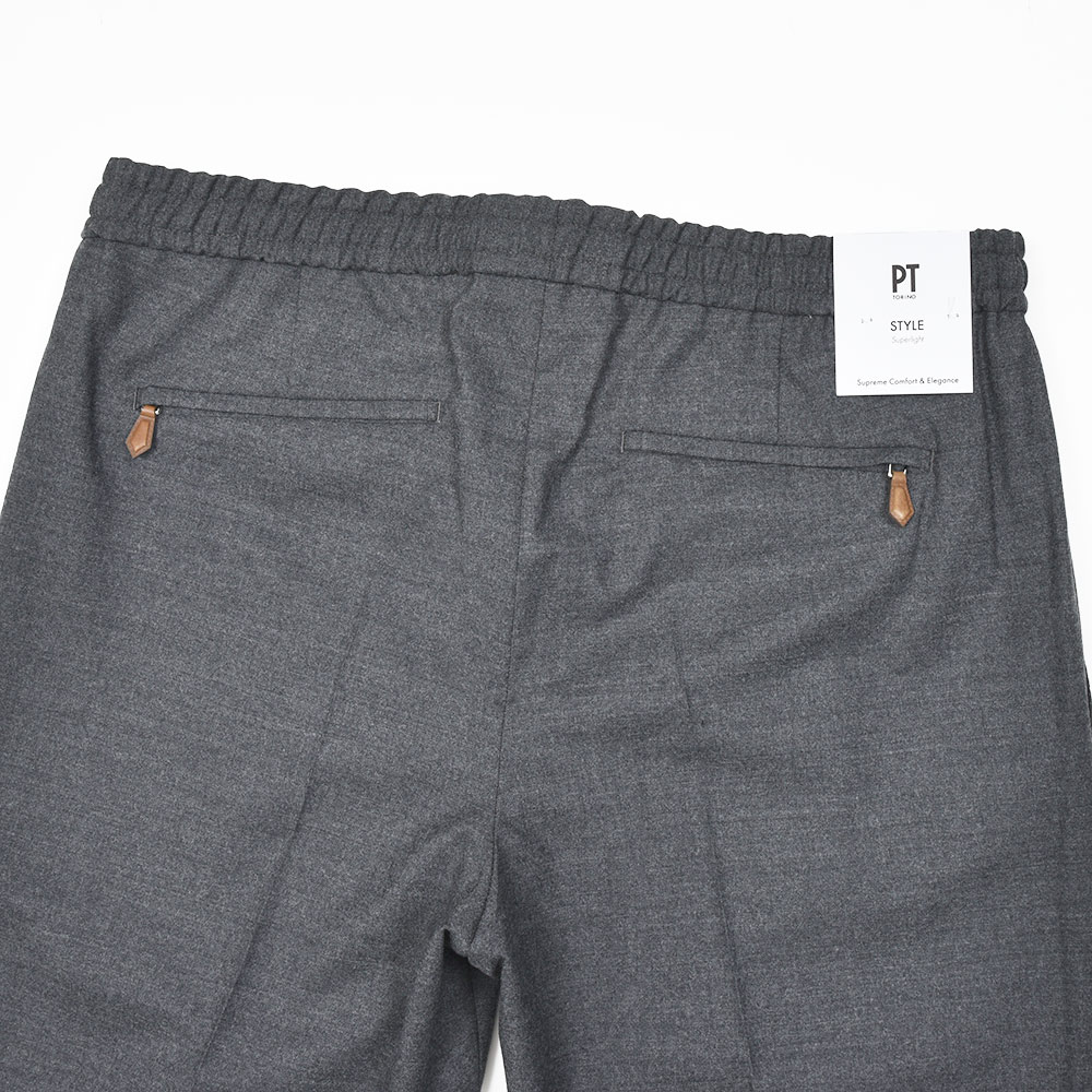 ウエスト部分がドローコード&シャーリング仕様の、程よいリラックス感あるシルエットが魅力の“SOFT FIT”。やや深めの股上に1プリーツ仕様が、程よい腰回りのゆとりを表現しています。しかしながら、テーパードを効かせることでスッキリとしたPT TORINOらしい上品なシルエット。また、バックポケットはジップ仕様となっており、レザーの持ち手が高級感をもたらせます。その為、他ではないワンランク上の雰囲気があるリラックスパンツとなっています。