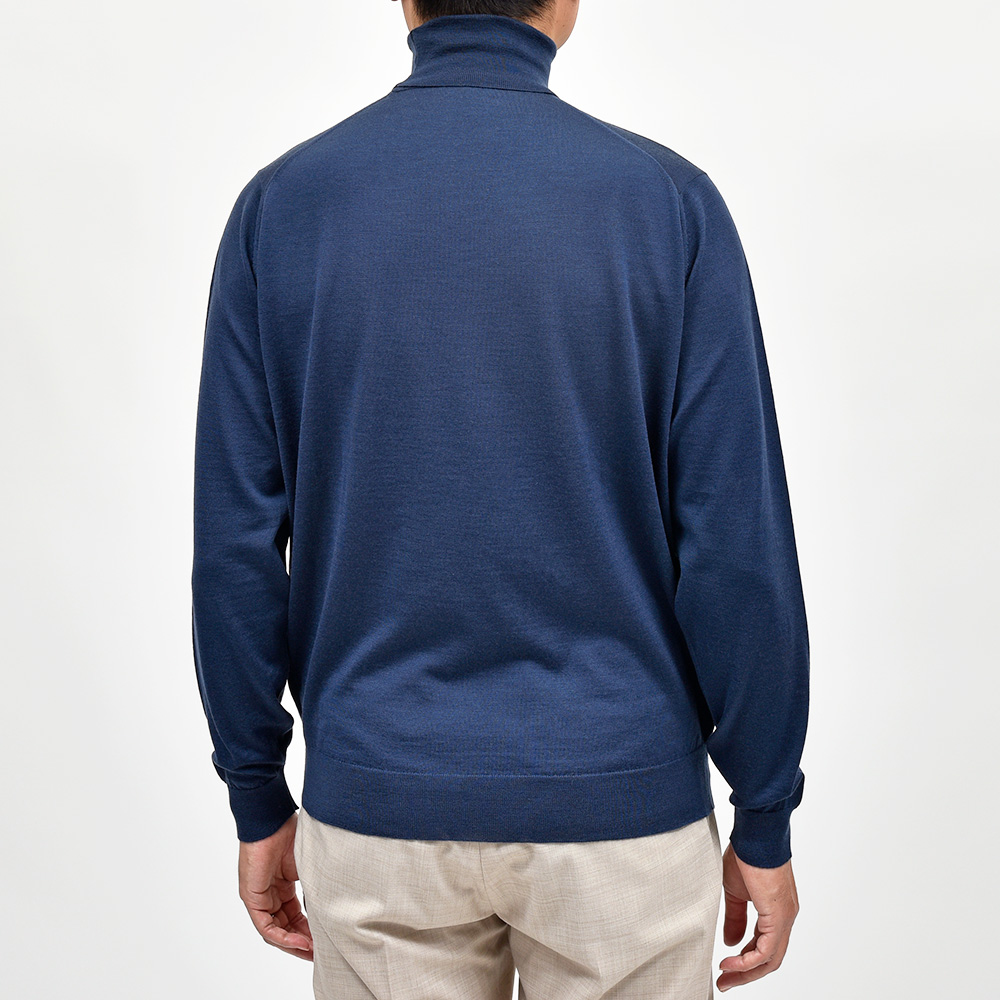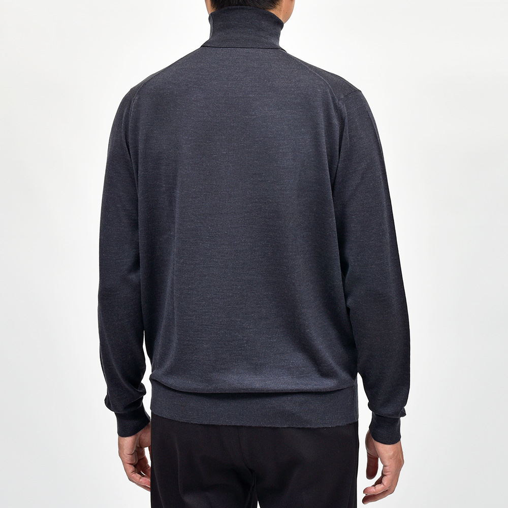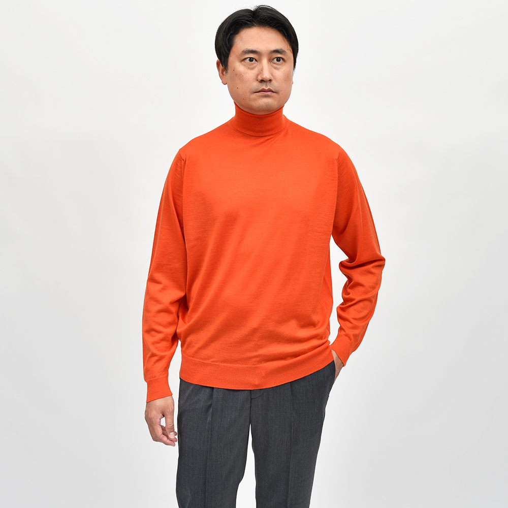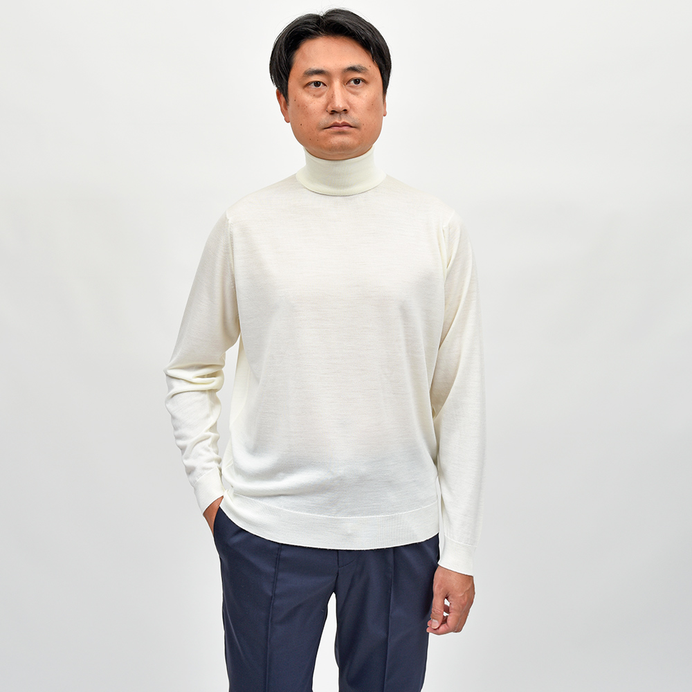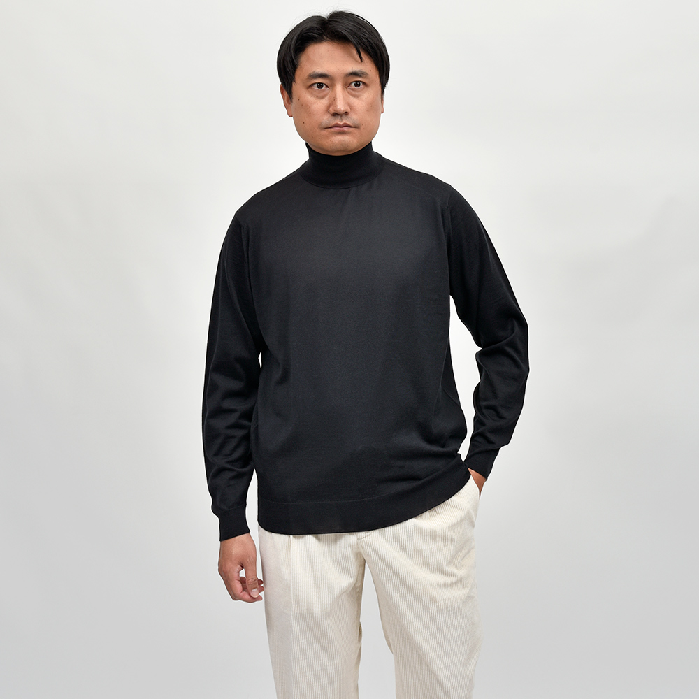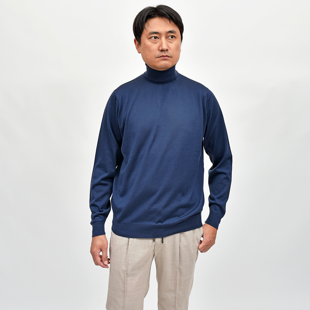 滑らかで仄かな光沢感を放ち、非常に手触りの良いエクストラファインメリノウールを使用した、定番ハイゲージの30ゲージシリーズ。やや透け感のあるハイゲージは、ジャケットなどのインナー使いは勿論のこと、サイズ感を少しゆったりめにすれば一枚で着用しても雰囲気のあるスタイルになります。JOHN SMEDLEYでは定番のタートルネックニットモデル“LEVINE”は、ネックが高過ぎず低過ぎない日本人にも合いやすい設定となった汎用性の高い一品です。