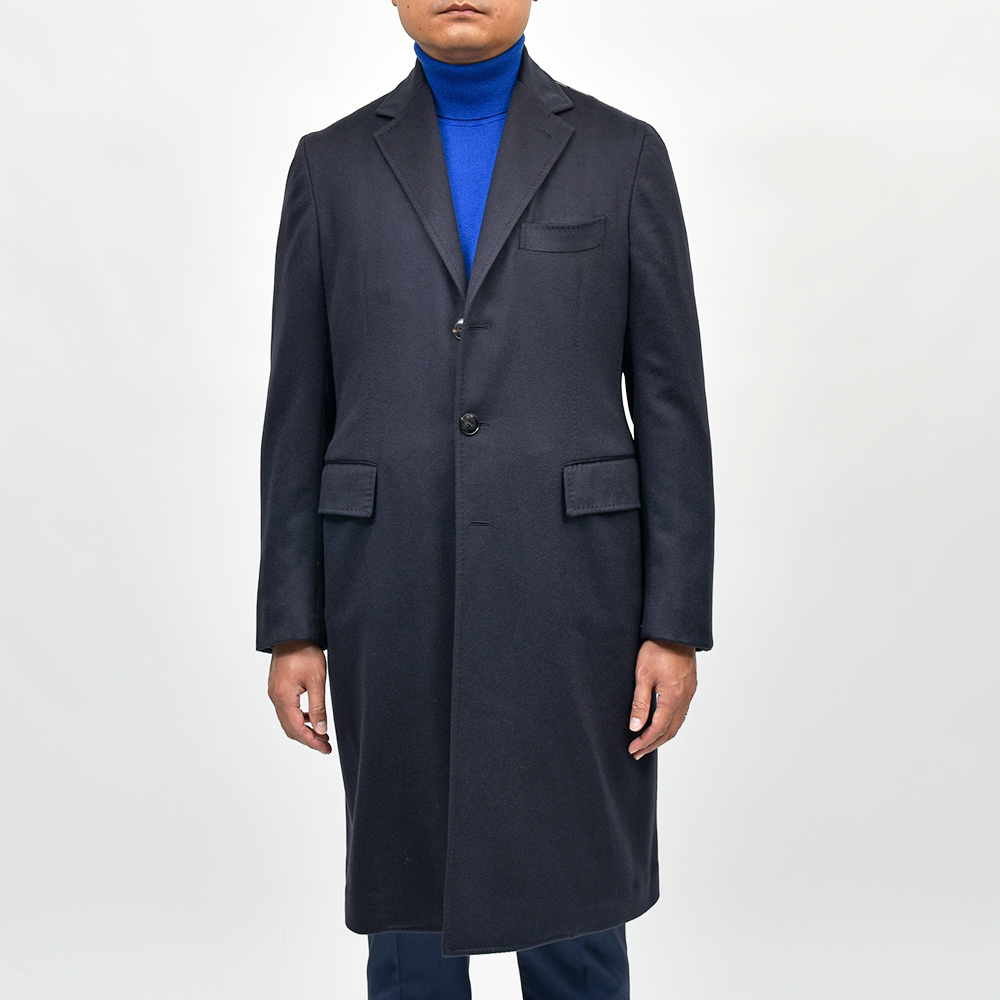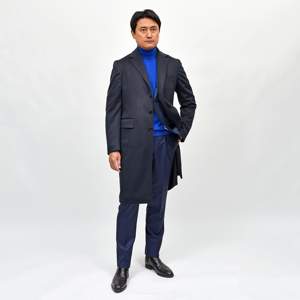 サイズ48がジャストサイズです。全体的に緩めのフィッティングですが、今の気分にぴったりな雰囲気です。見た目はスッキリとしたシルエットです。定番のシングルチェスターを贅沢なカシミヤご用意しました!