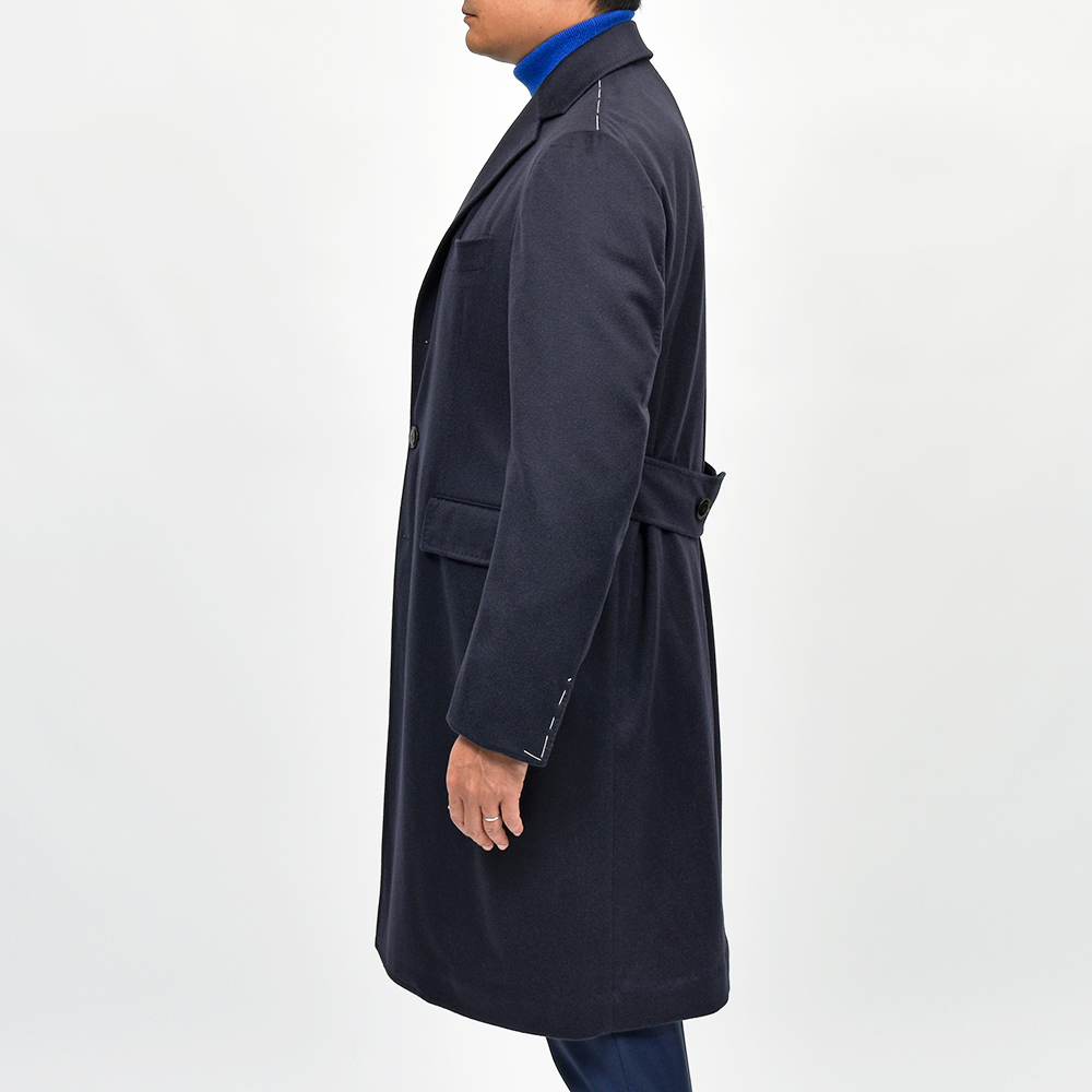 モデル“EOLO”は、3ボタン段返りというドレス感のあるシンプルなチェスターコート。バックに取り付けられたベルトが脚長効果をもたらしつつも、エレガントな表情を作り上げています。また、長い付き合いになる事が多いSTILE LATINOのコートであれば、普遍的なディティールである“EOLO”は非常にオススメの一着になります。
