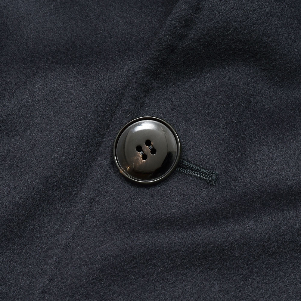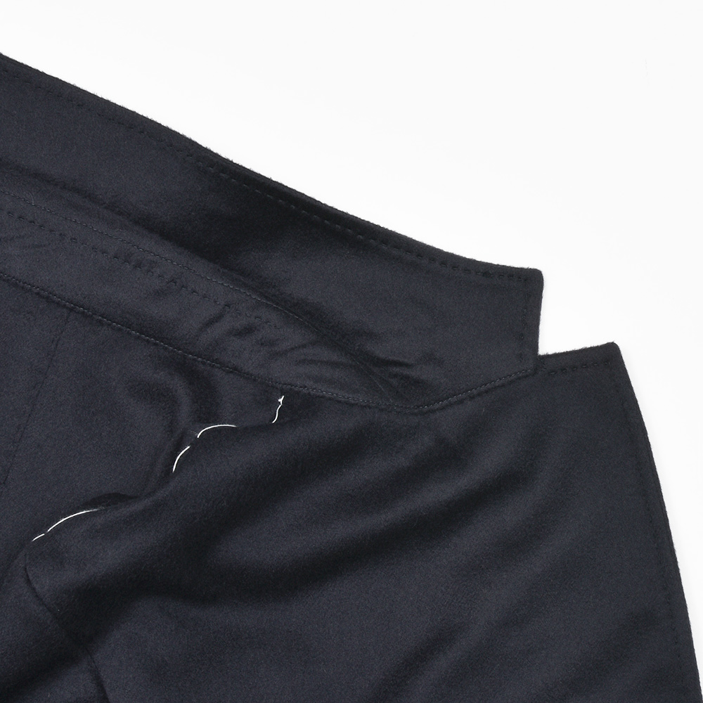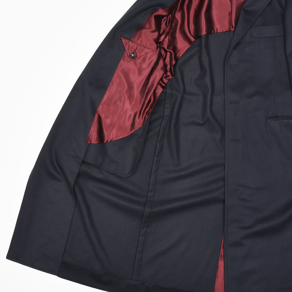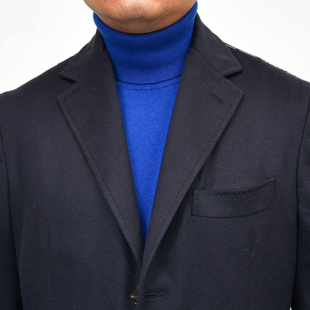 目付け380gと秋冬素材ではやや軽いウエイトのカシミヤ素材。カシミヤらしいふんわりとして柔らかな質感に、上品な艶がクラス感のある佇まい。こちらは目付けが軽いため、昨今の気候が加味された一着となっています。ファブリックはイタリアの超高級生地メーカー“QUAREGNA(クアレーニャ)”のカシミヤ100%生地になります。