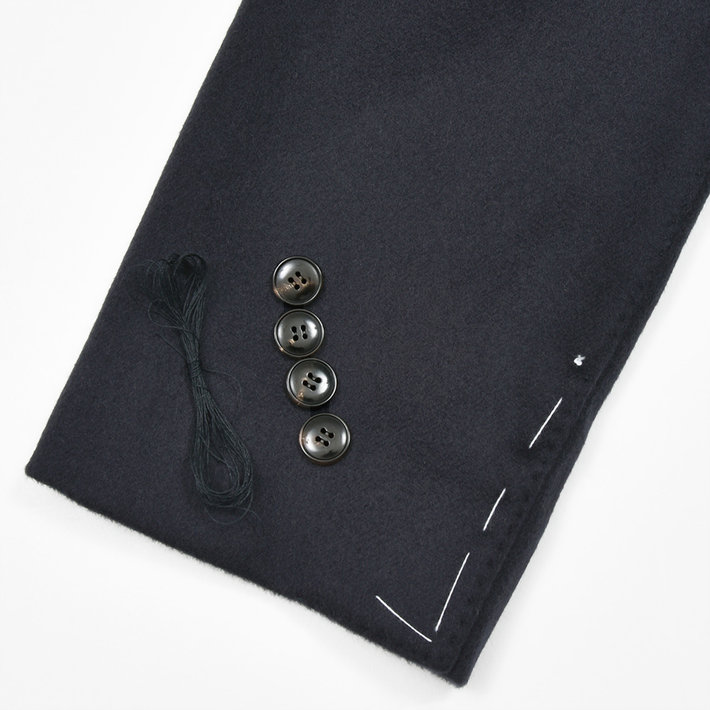 2玉縁ポケット、センターベンツ、ラペル幅10cm、袖アンフィニッシュド(本切羽・開き見せなどの釦付け修理が必要)です。