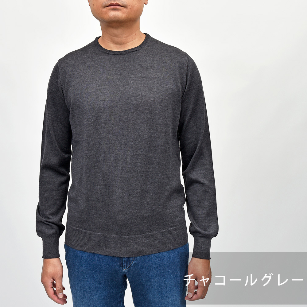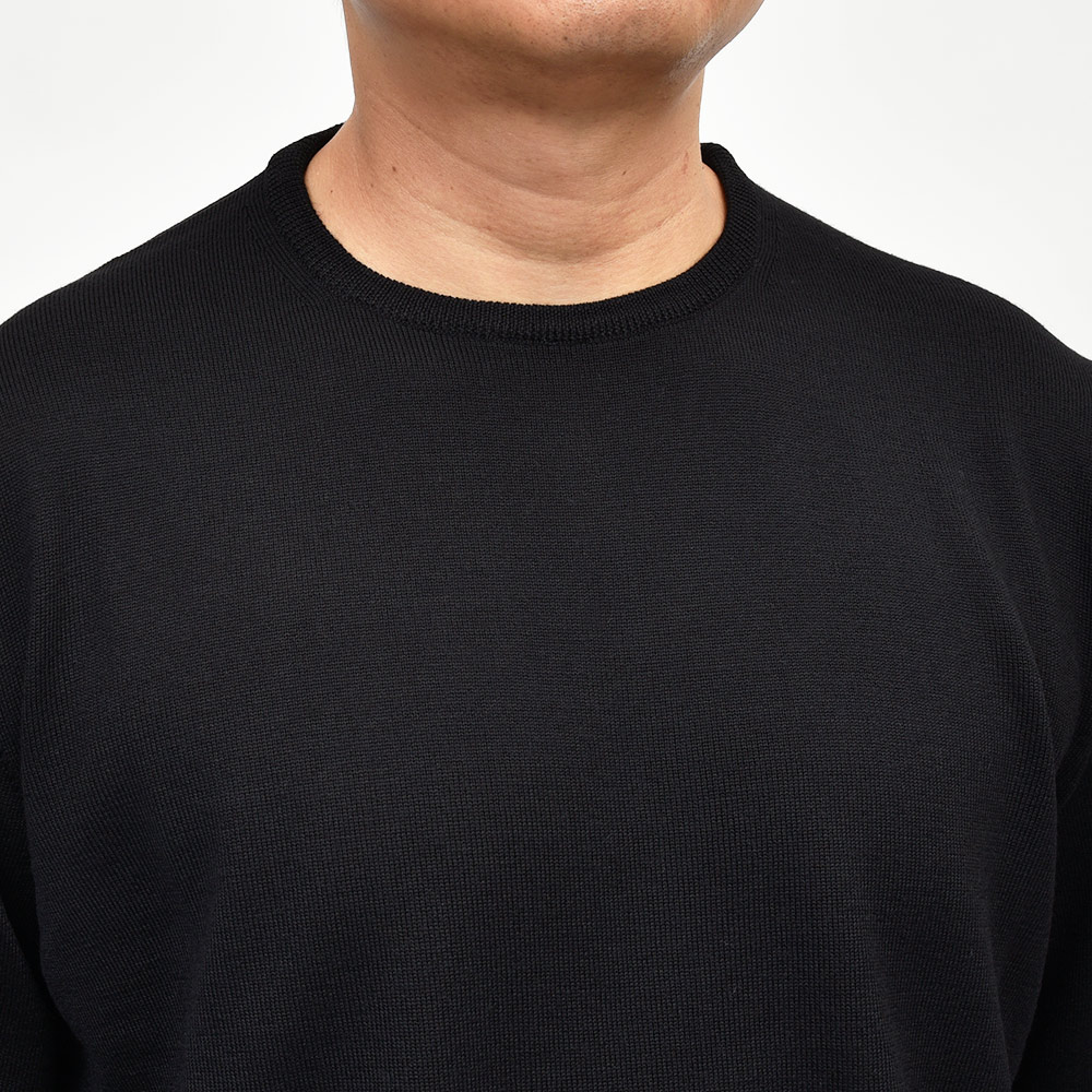 美しい艶感と非常に滑らかなタッチが特徴のエクストラファインメリノウールを使用したハイゲージニット。やや肉感のあるハイゲージですので、インナーは勿論サイズアップして少しゆとりを持って一枚で着ても映える一着となっています。
