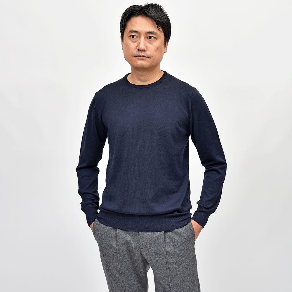 カジュアルな印象のあるクルーネックですが、この質感であれば品のあるスタイルが完成します。
