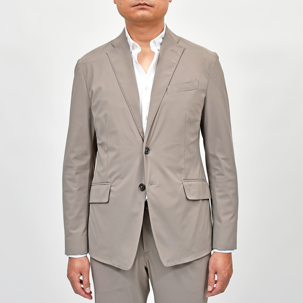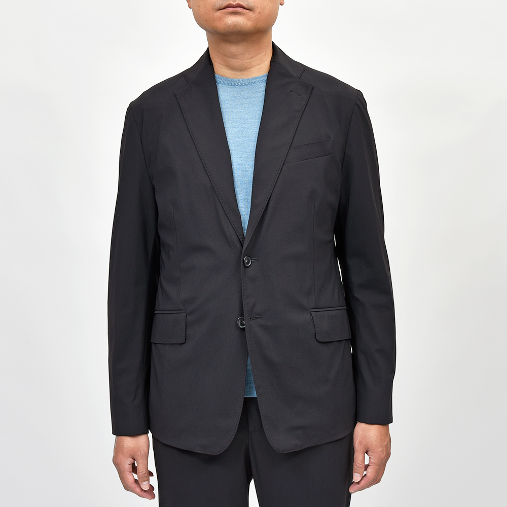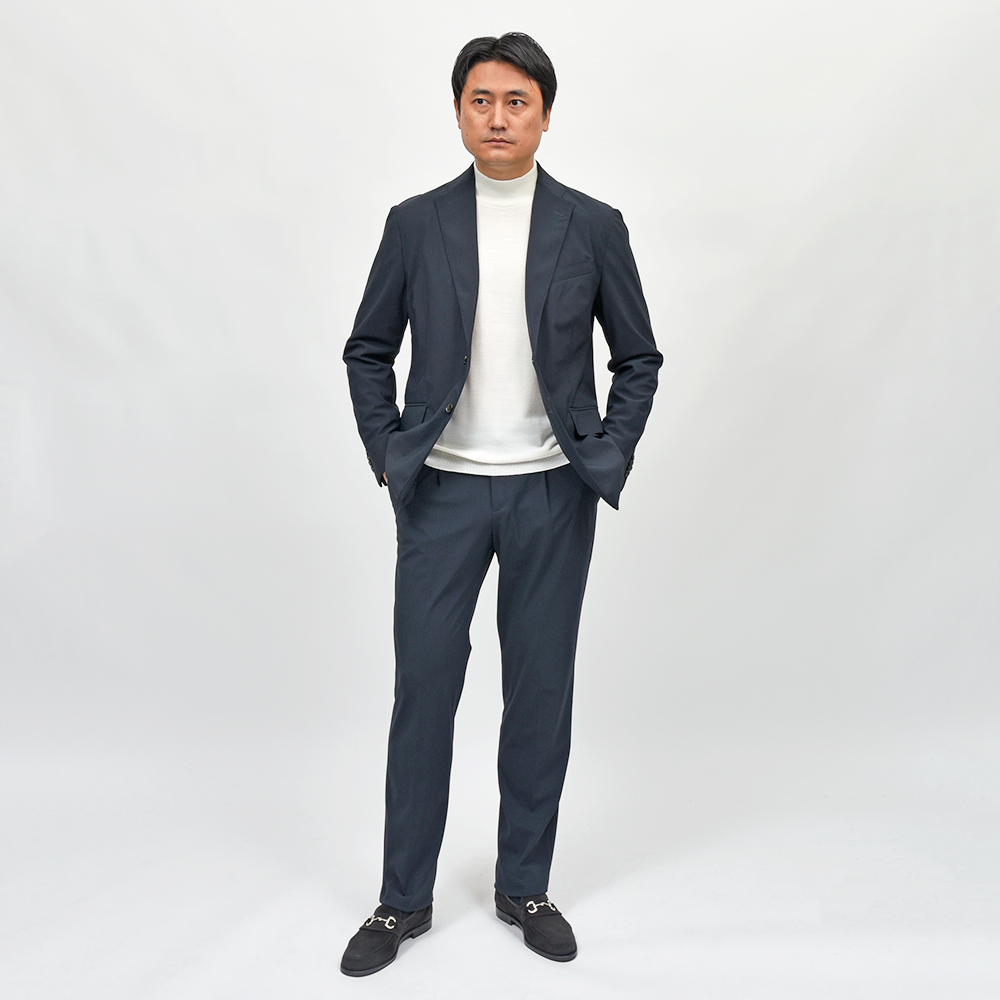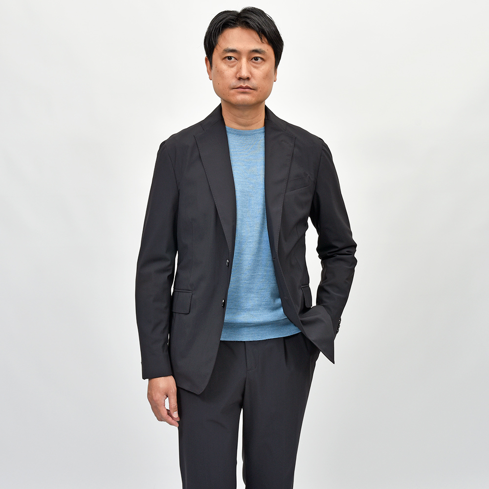 モデルは2つボタンにシングルジャケット。広すぎないモダンな印象のラペル幅に、フラップポケットと袖の本切羽仕上げは本格的なジャケットの仕立てです。