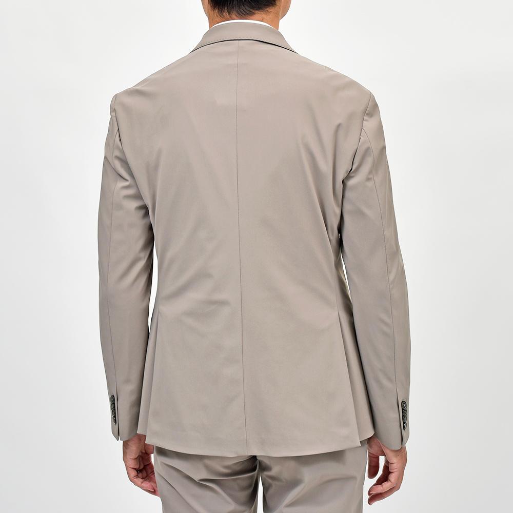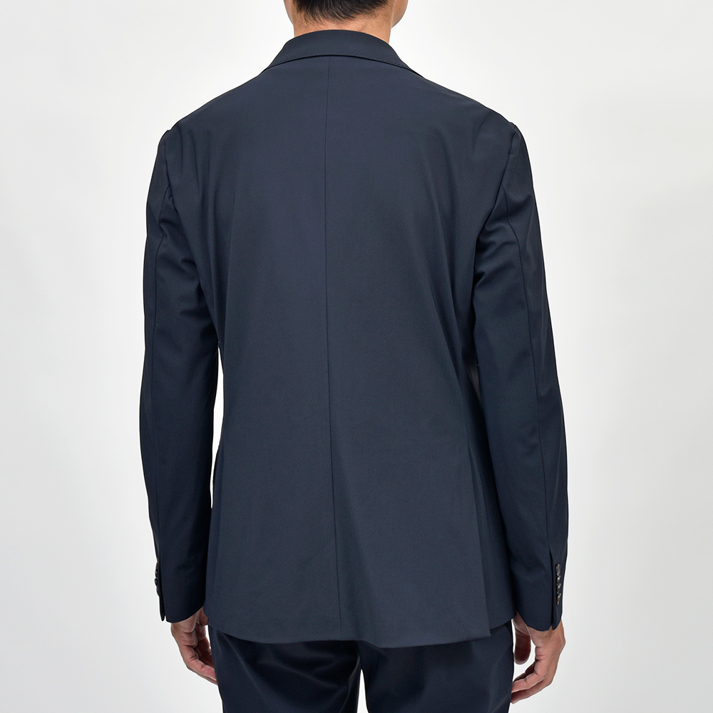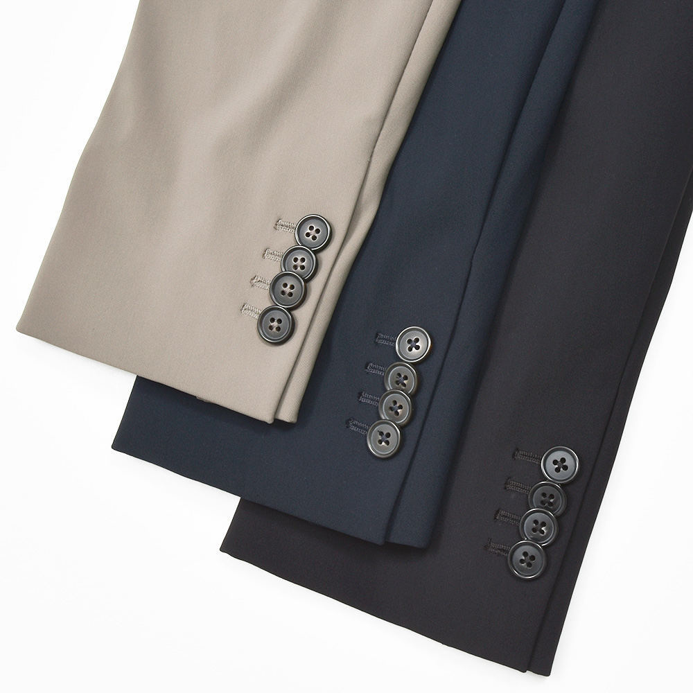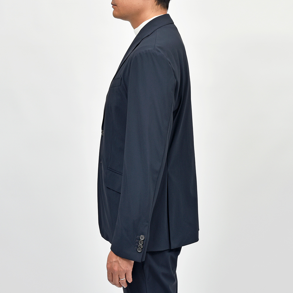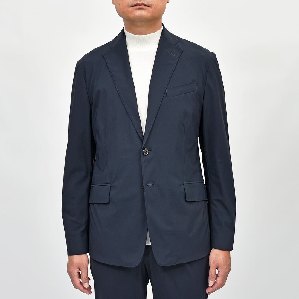 モデルは2つボタンにシングルジャケット。広すぎないモダンな印象のラペル幅に、フラップポケットと袖の本切羽仕上げは本格的なジャケットの仕立てです。