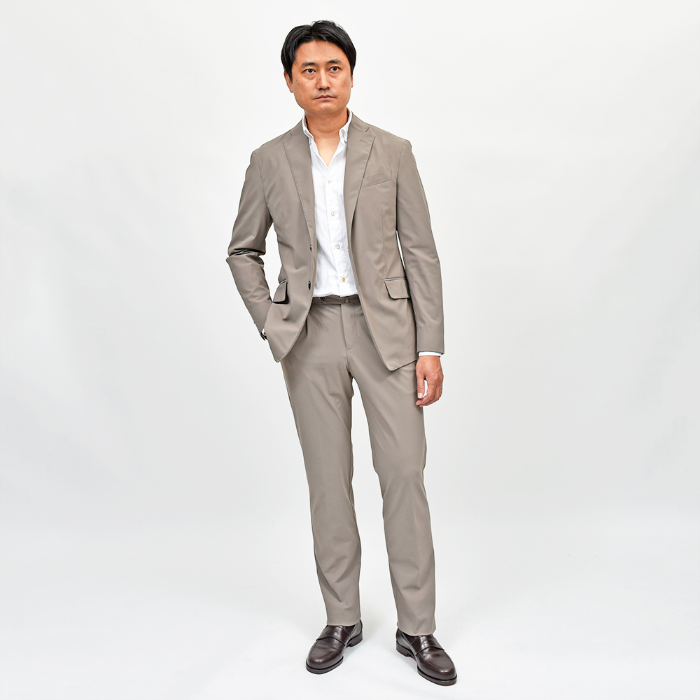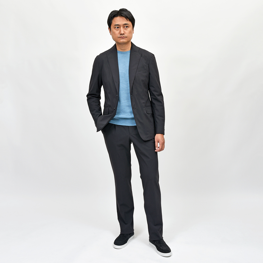 (画像のスタッフは182cm、76kgでダークネイビー・ブラックはサイズ50を、グレーベージュはサイズ48を着用しています。)