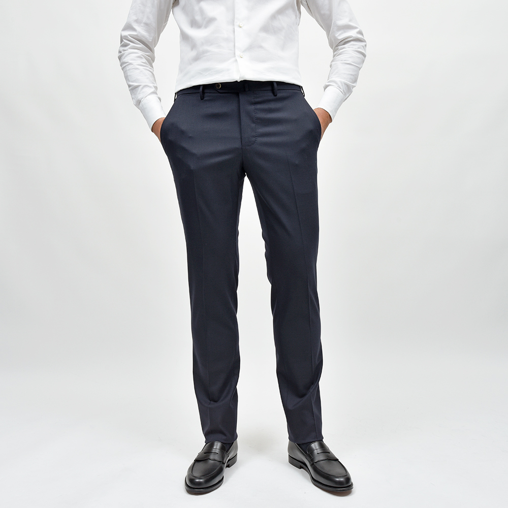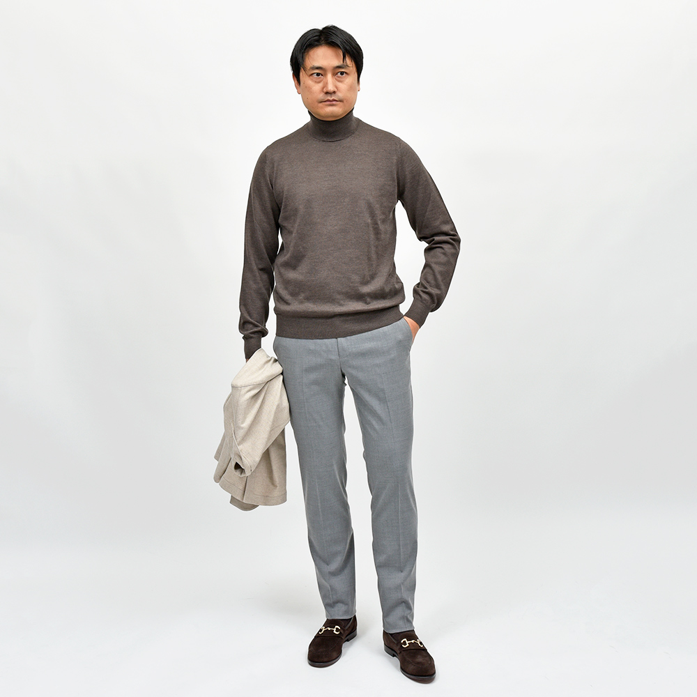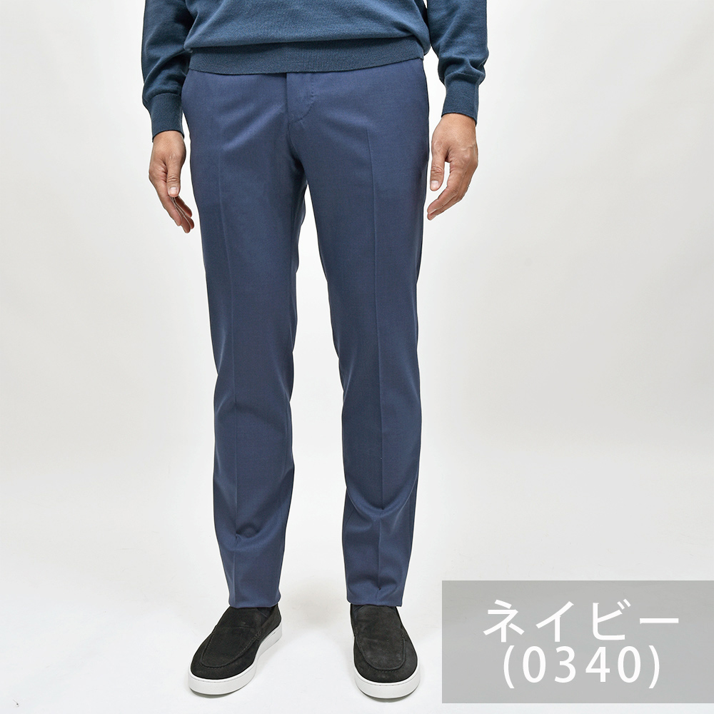 とりあえず一本ワードローブに必要なサージ生地のスラックスは、誰の目から見ても美しいシルエットを誇るこの名品であれば安心安全です。