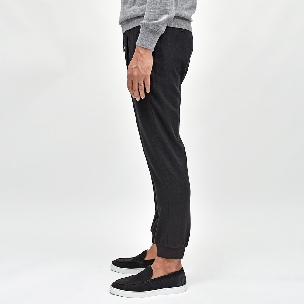 サイズ44でジャストサイズです。全体的なシルエットはスリムな印象で膝下はしっかりテーパードしていますが、ヒップやワタリは程良いゆとりがあるフィット感なので脚のラインが自然で綺麗に見えます。裾リブの締め付けはゆるめになっています。