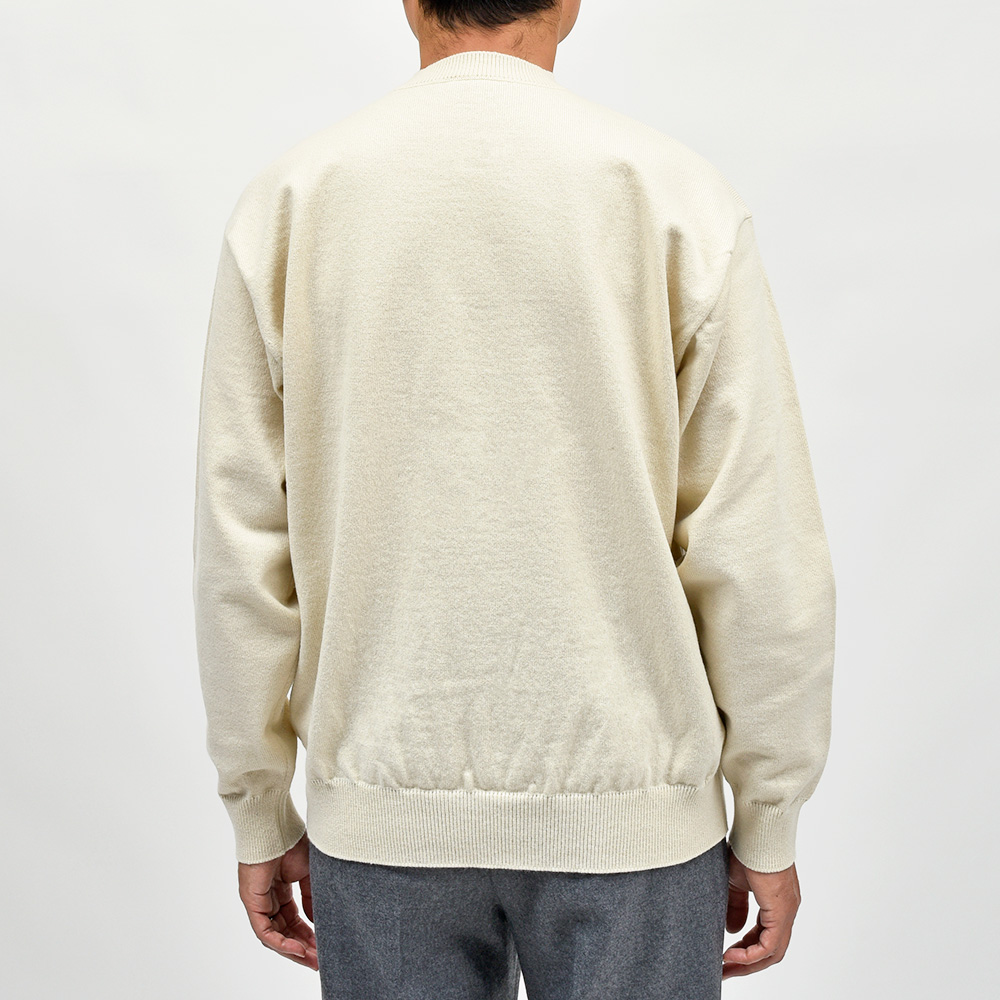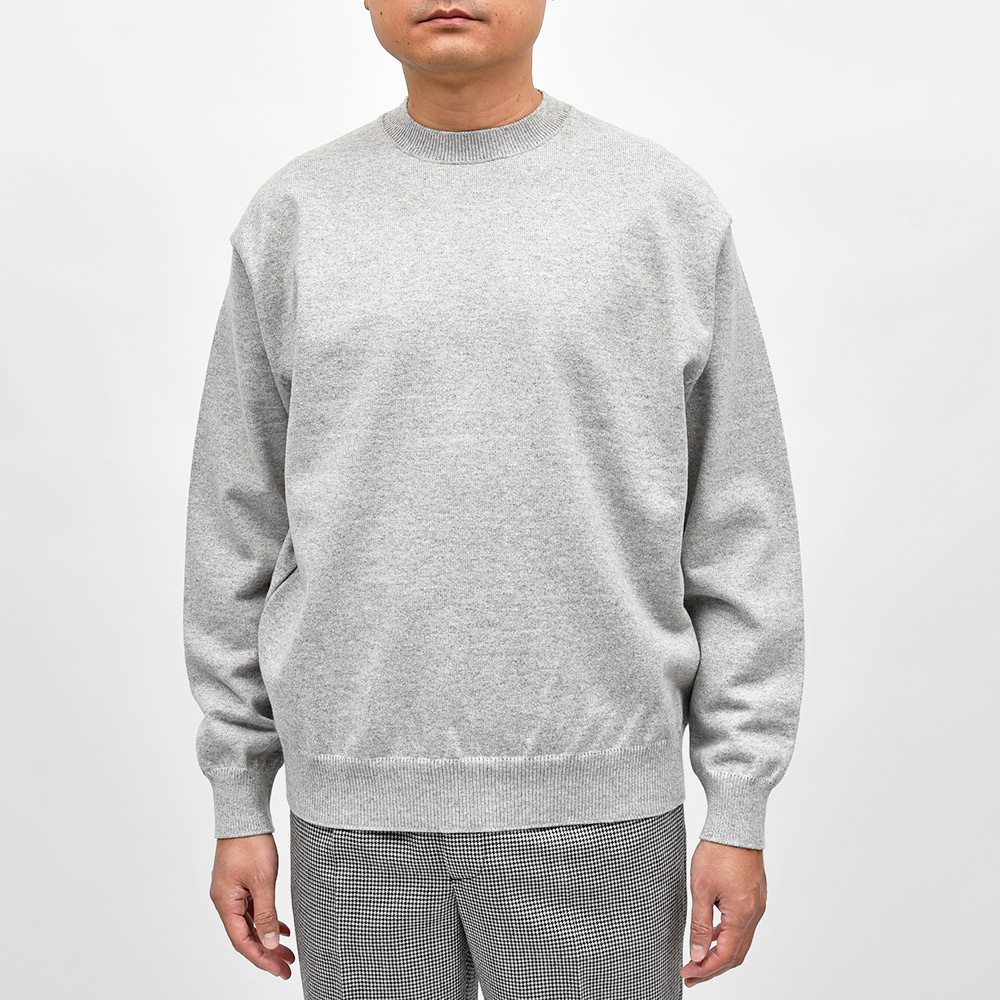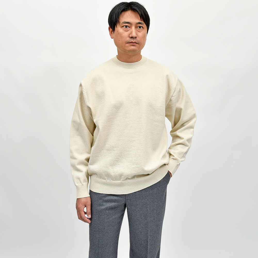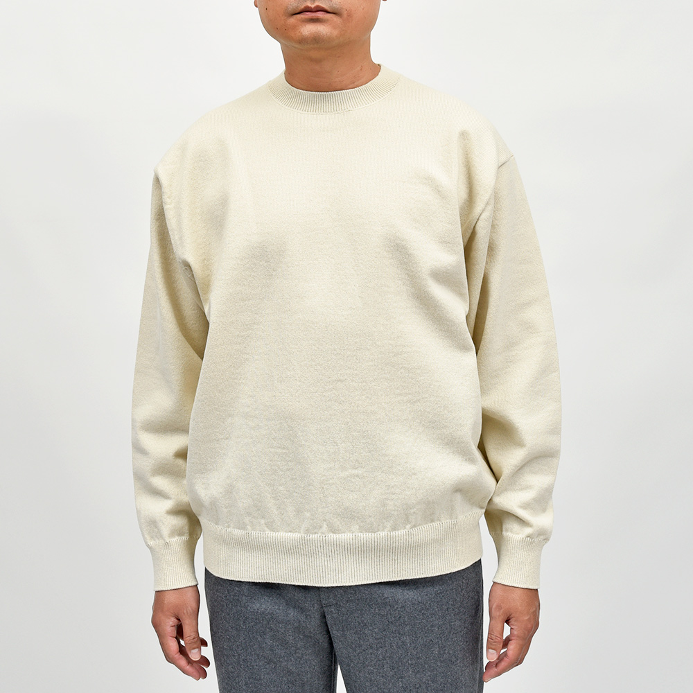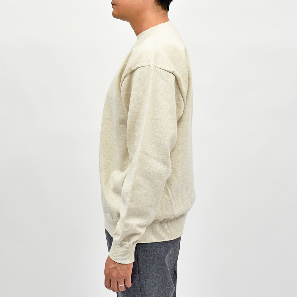 その後も経年変化を楽しめるよう、ニット製品には欠かせない洗いの製品加工を一切施さず、リジッドの状態で製品化。ワークウエアを思わせる紡績油特有の匂いも魅力の一つです。硬さが残った状態から、着込むごとにカシミヤらしい柔らかな風合いに育っていきます。