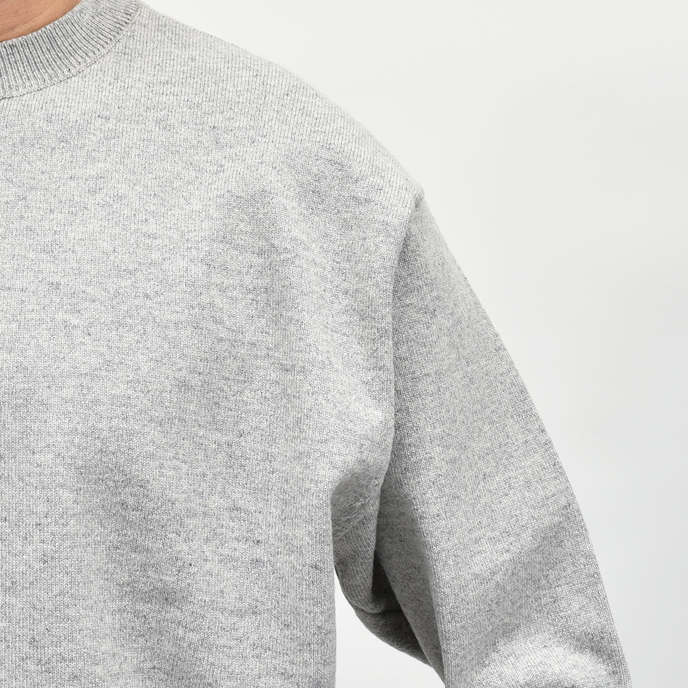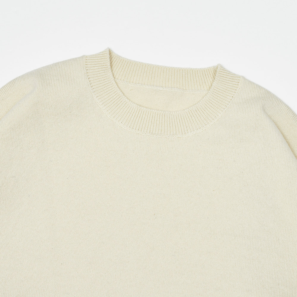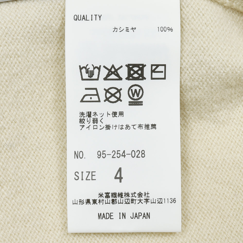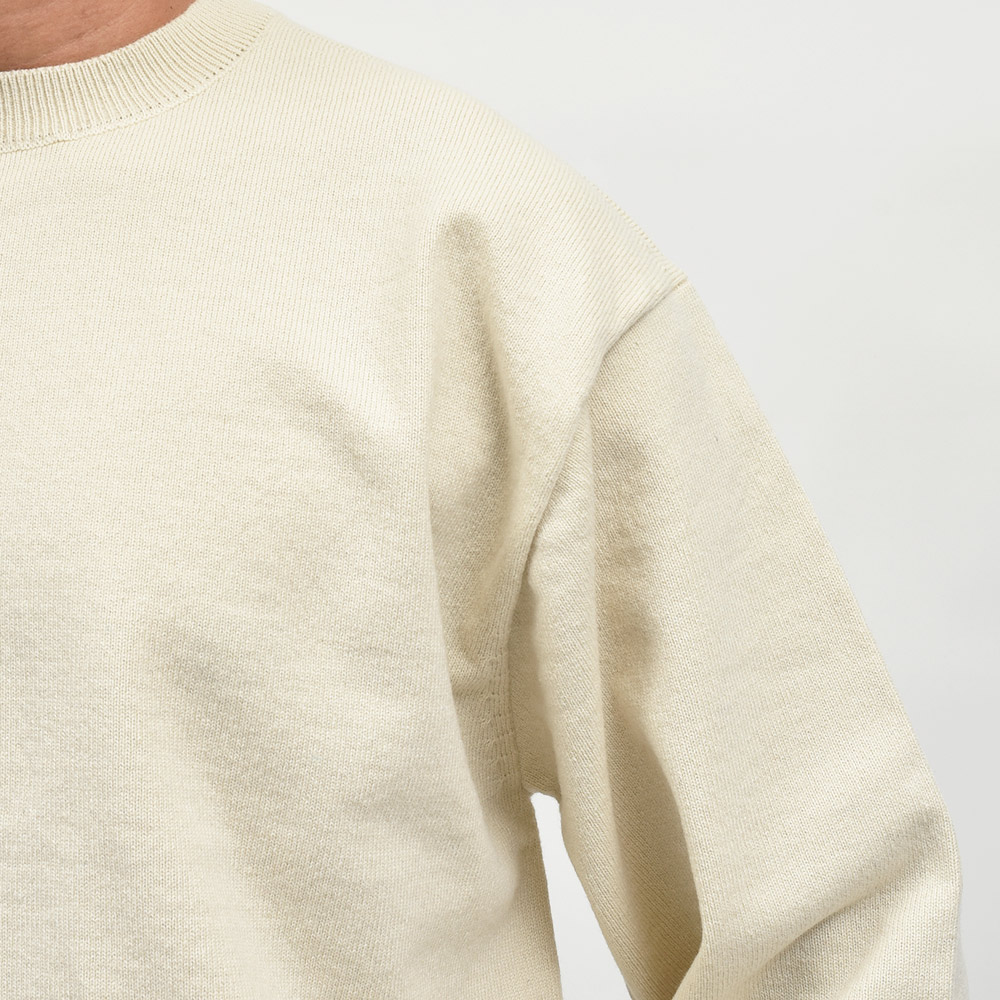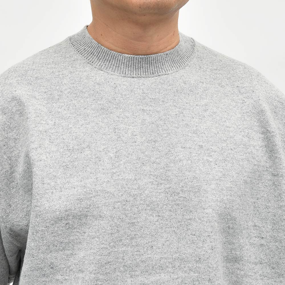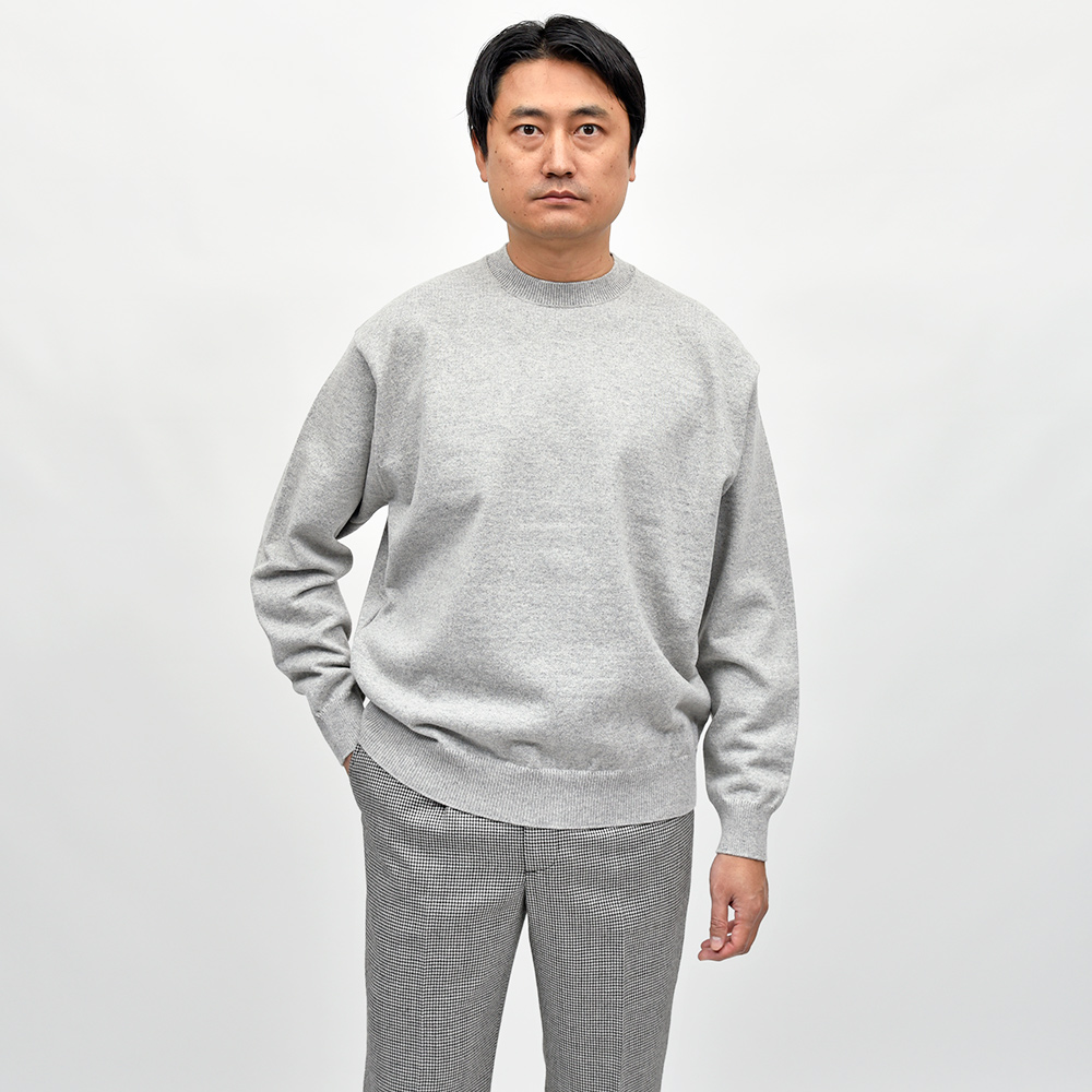 通常は甘く撚ることで空気を含ませてふんわりと柔らかな風合いを持たせるカシミヤ糸。こちらは繊維が切れる限界まで撚りをかけた強捻のカシミヤ糸を別注で開発し、さらに度詰めにして贅沢に編み立てることで、カシミヤニットのイメージを覆す硬く丈夫な風合いを実現しています。