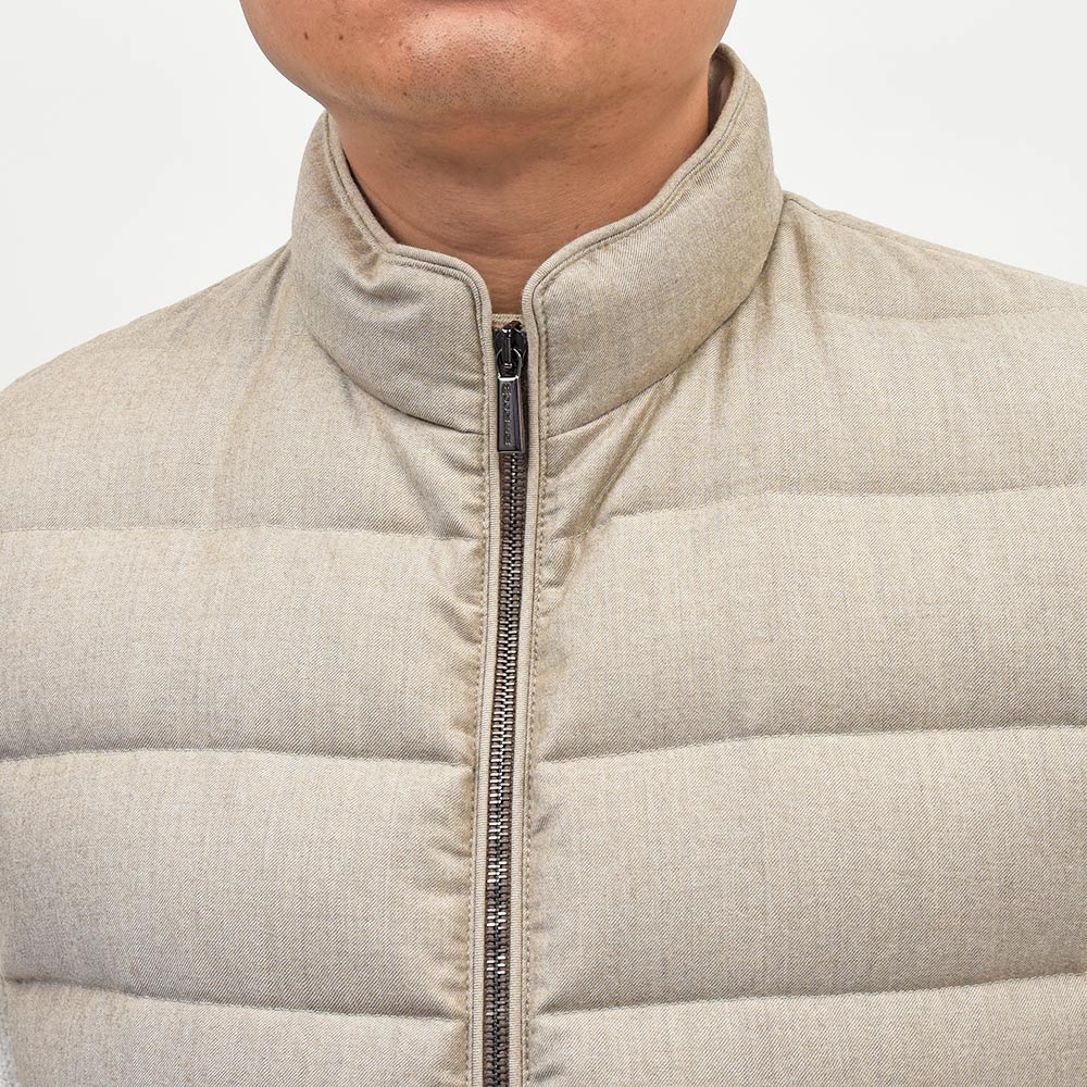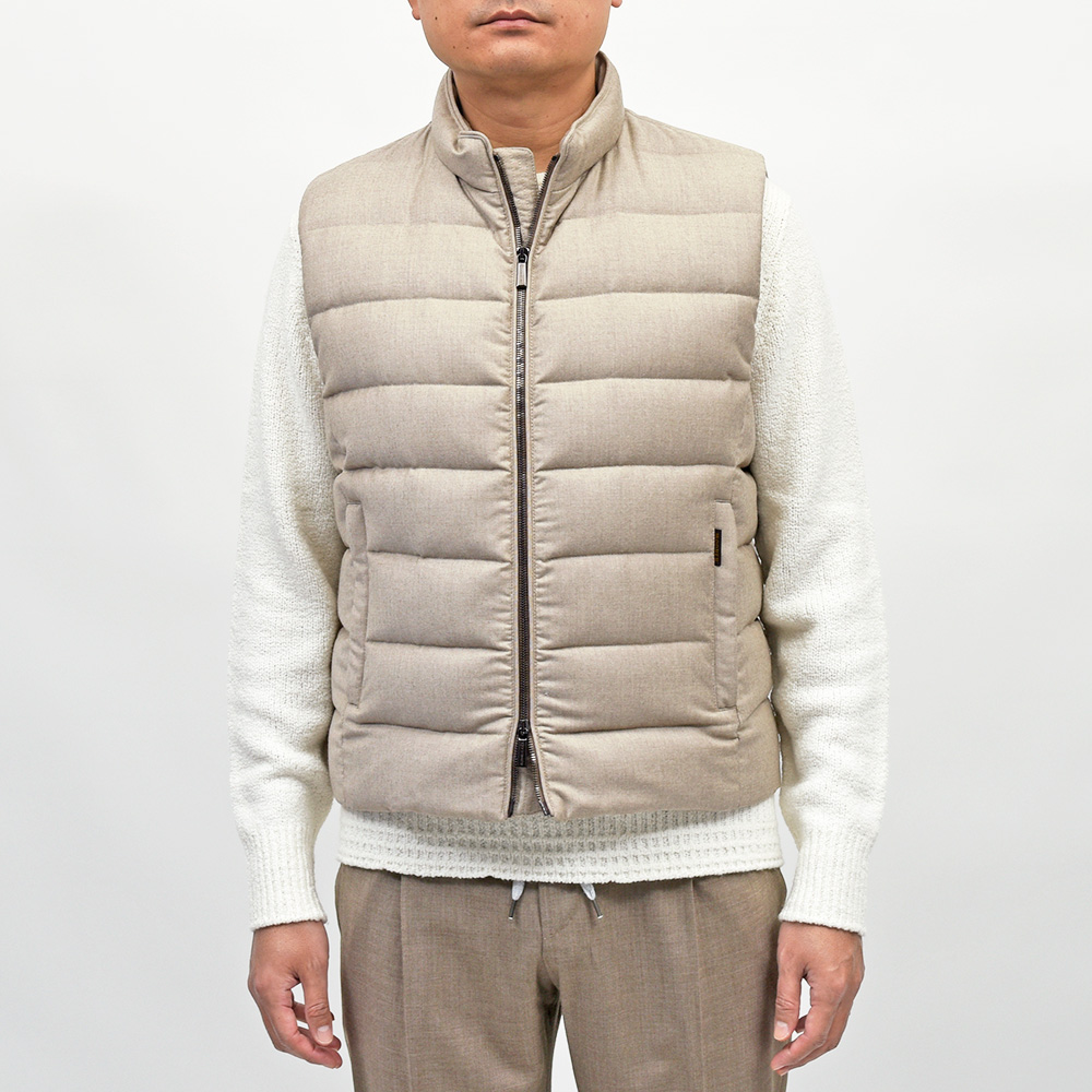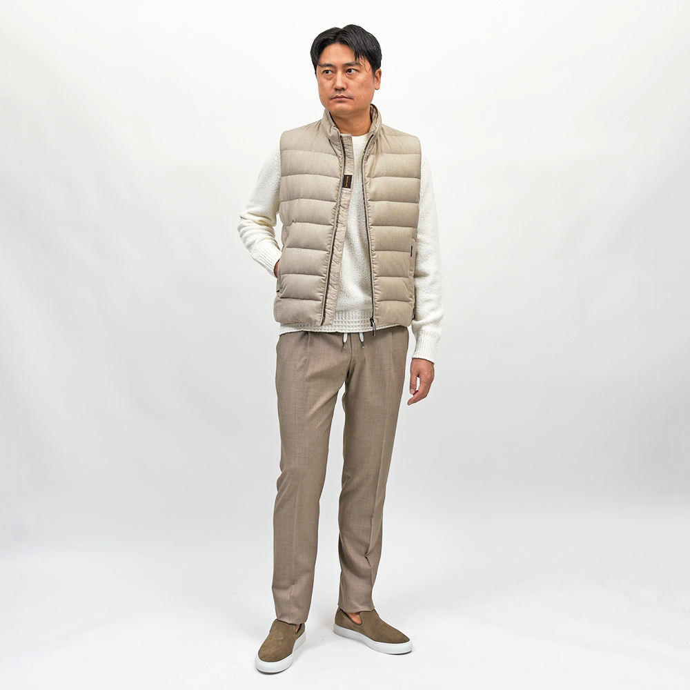 カジュアルなアイテムであるはずのダウンベストを品の良い佇まいに仕上げた、MooRER×LoroPianaであればこの結果にも納得です。