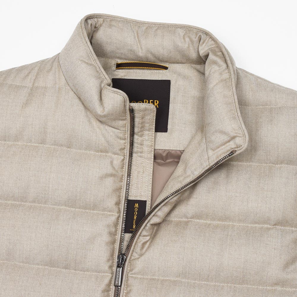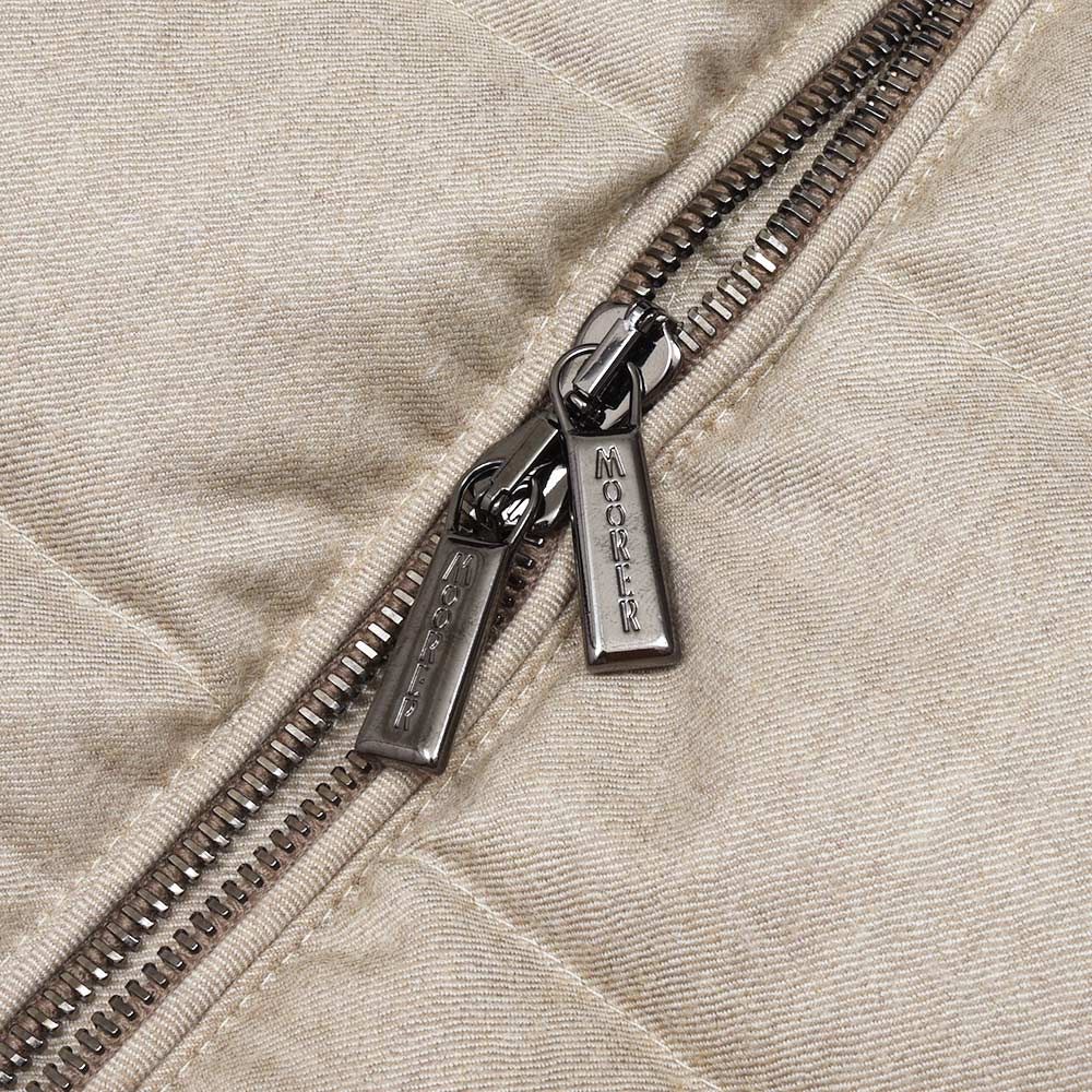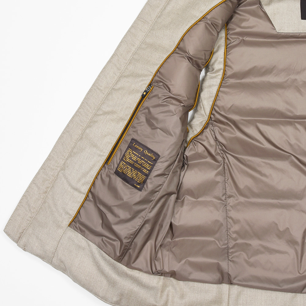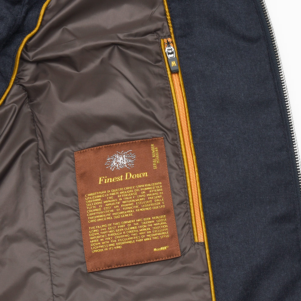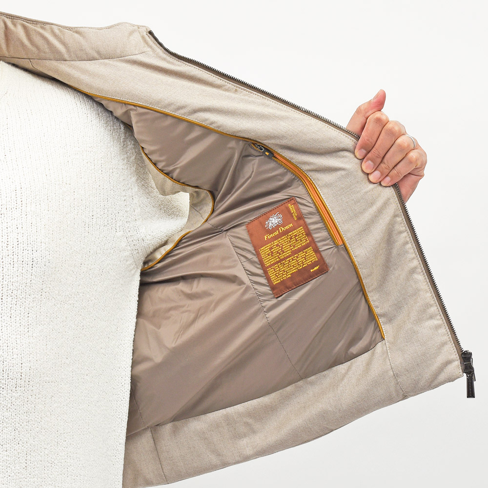 MooRERは最高のフィルパワーを誇るシベリア産の最高級ホワイトグースダウンを贅沢に使用。特注のファスナーに、裏地のナイロン素材の美しさ加えてパイピング処理を施した丁寧な仕上げ、またダウンにとって必要不可欠な防寒性に隙はなく、かといって着膨れしないシルエットは秀逸としか言いようがありません。