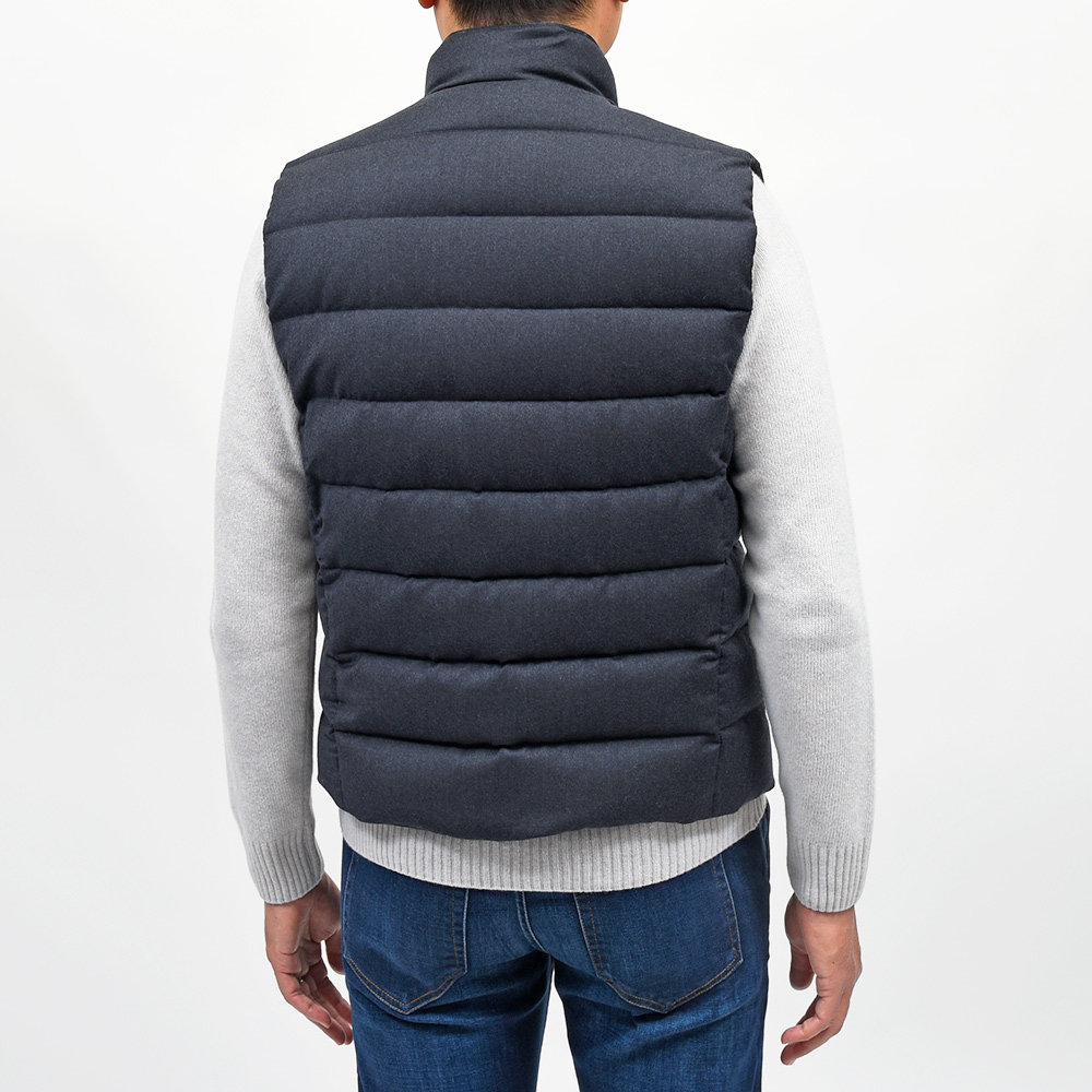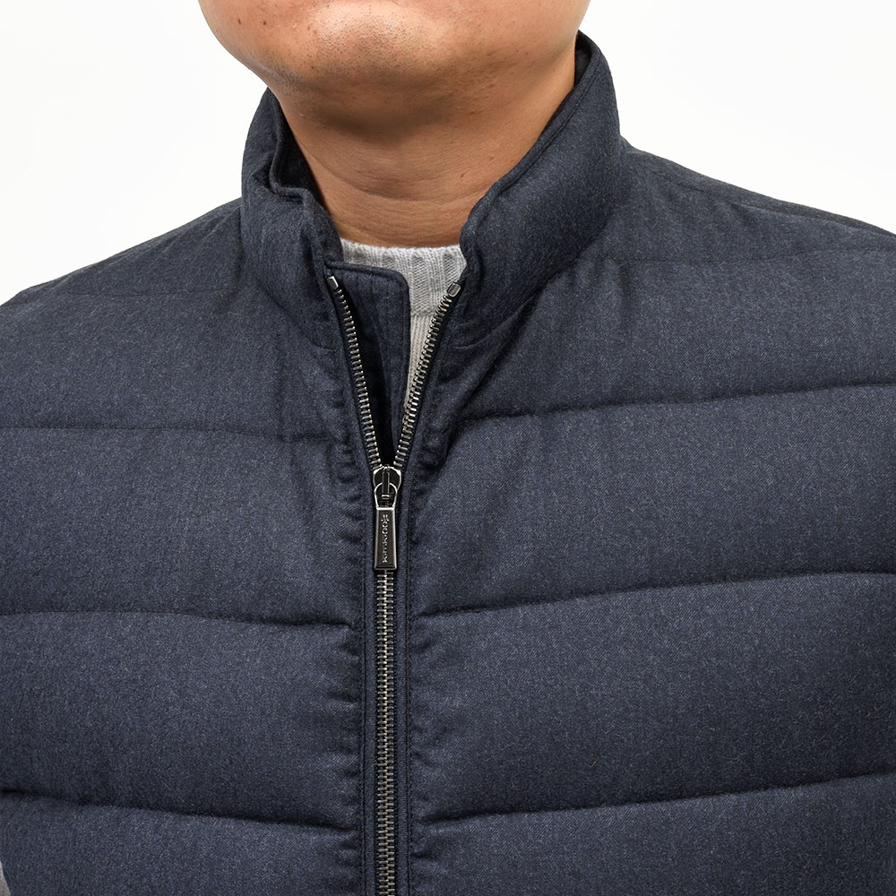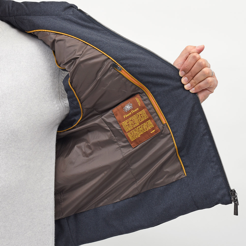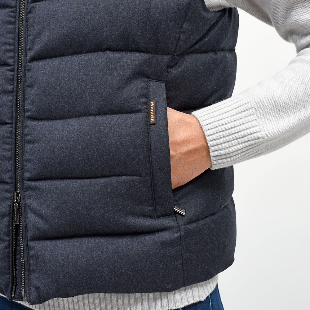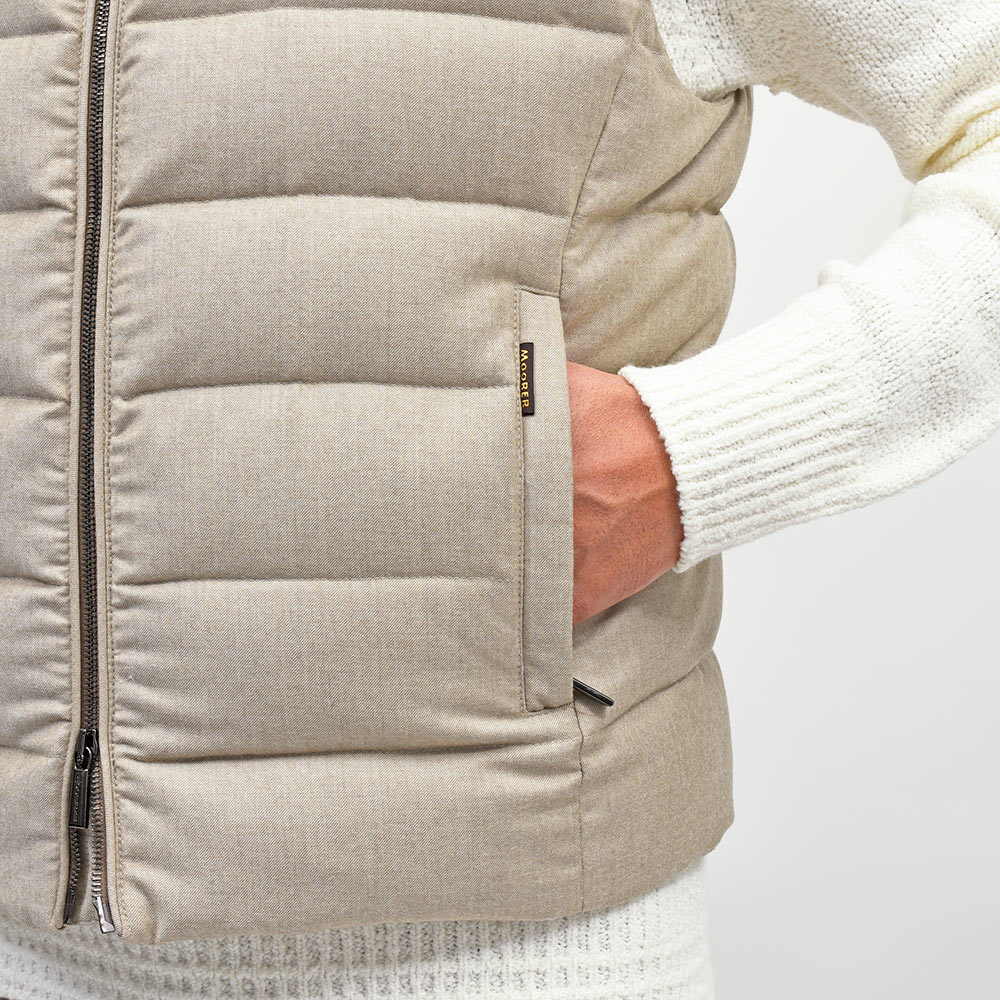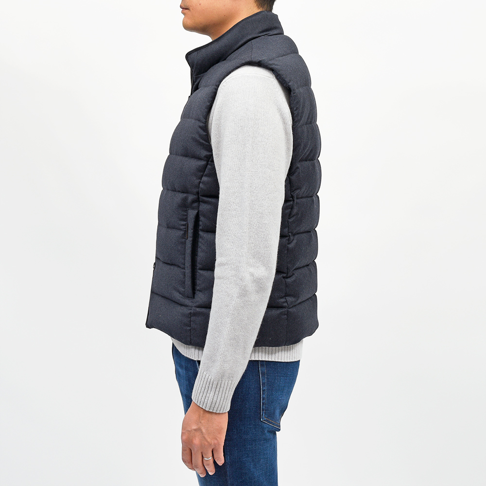 MooRERのダウンベストでは定番のモデル“OLIVER(オリバー)”。シンプルなデザインに端正な顔立ちは、合わせるスタイリングや着るシーンをあまり選ぶことなく着回せる一品です。中綿のダウンのボリュームを抑えることで、車移動が多い方などは着たままでも運転することができ、着たり脱いだりと言う手間が軽減されます。また、表地に使用されているウール×カシミヤは、言わずと知れた“LoroPiana”謹製ファブリック。美しいメランジの色味に、上品さを醸し出す素材の風合い、正に非の打ち所がない逸品と言えます。