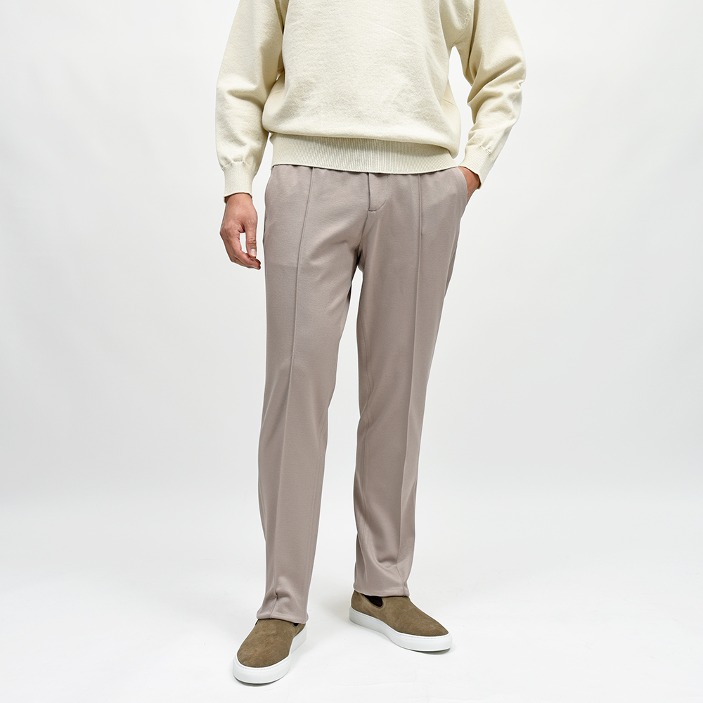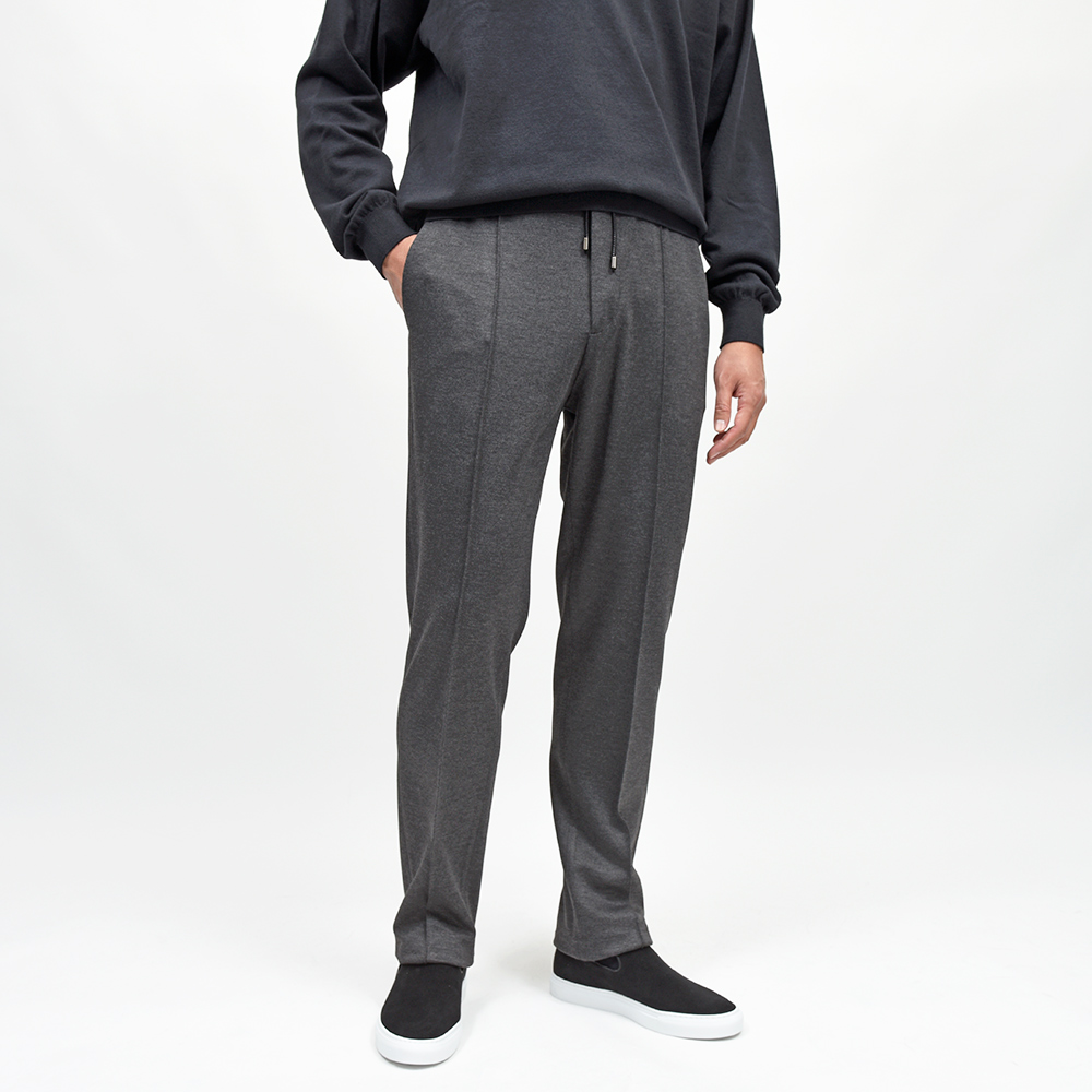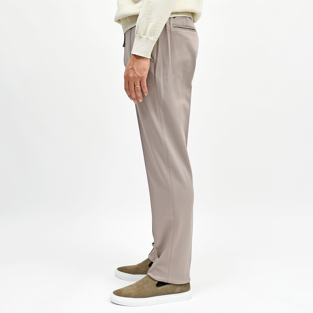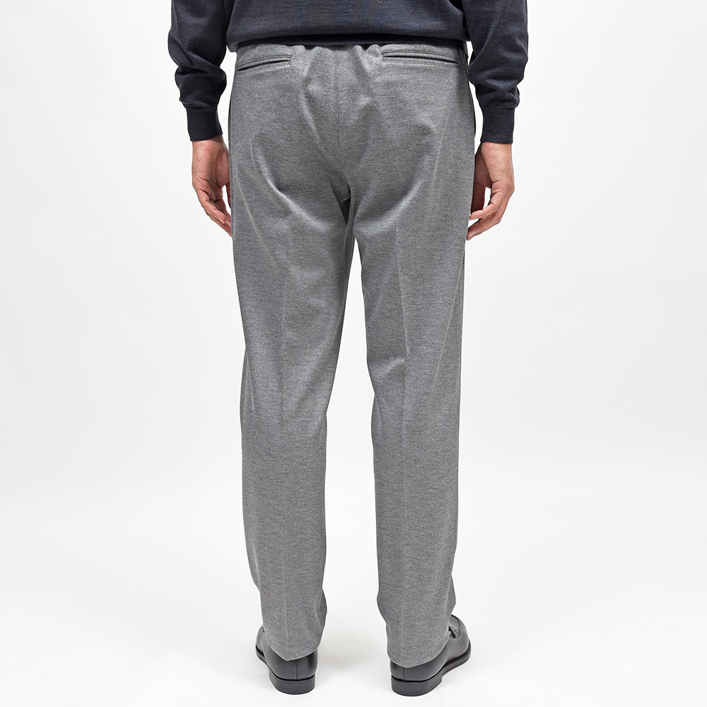 目付け520gのジャージー生地は、昨年に新登場した“カルゼジャージー”になります。ツイル織りよりも畝の感覚が広く表情が作りやすいカルゼ織りのようなジャージーは、言わずもがなのジャージーらしい穿き心地はそのままに、スポーティーさを抑えた見え方になります。また、自宅で水洗いできるため、デイリーユースには打って付けの機能を兼ね備えています。