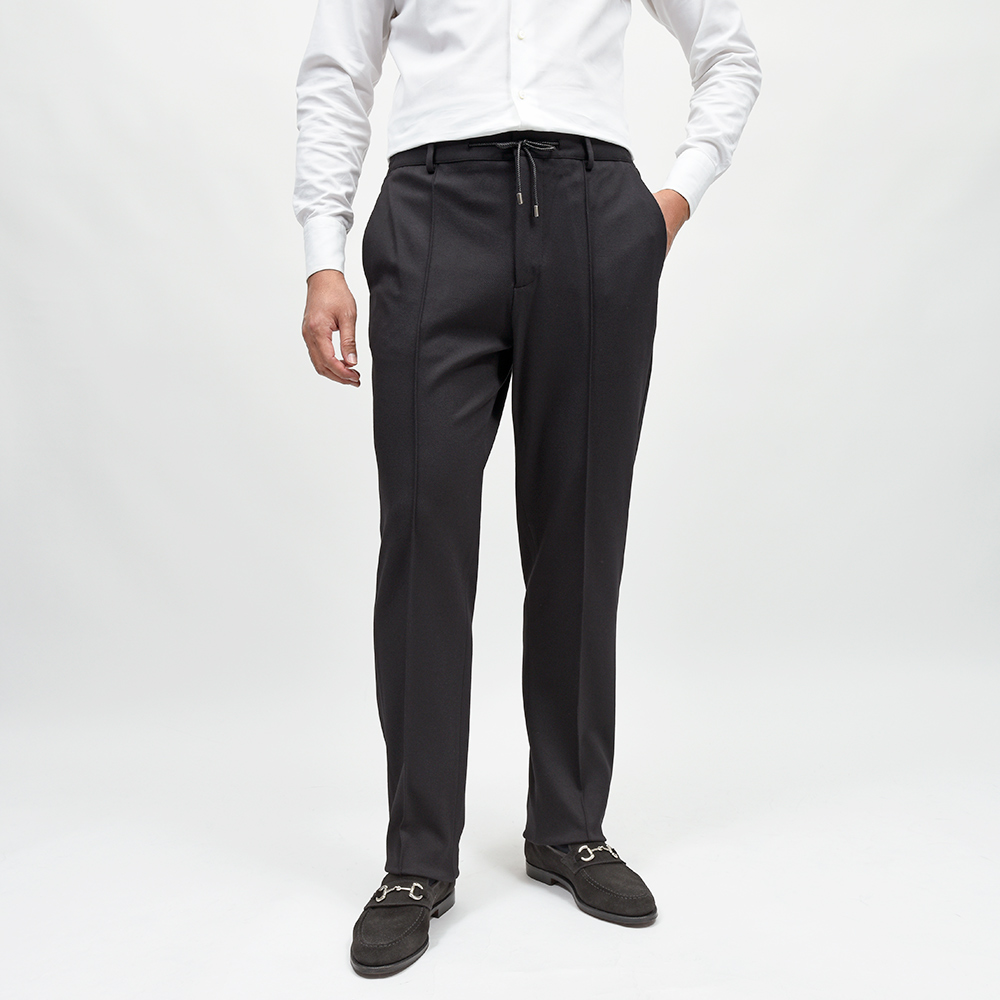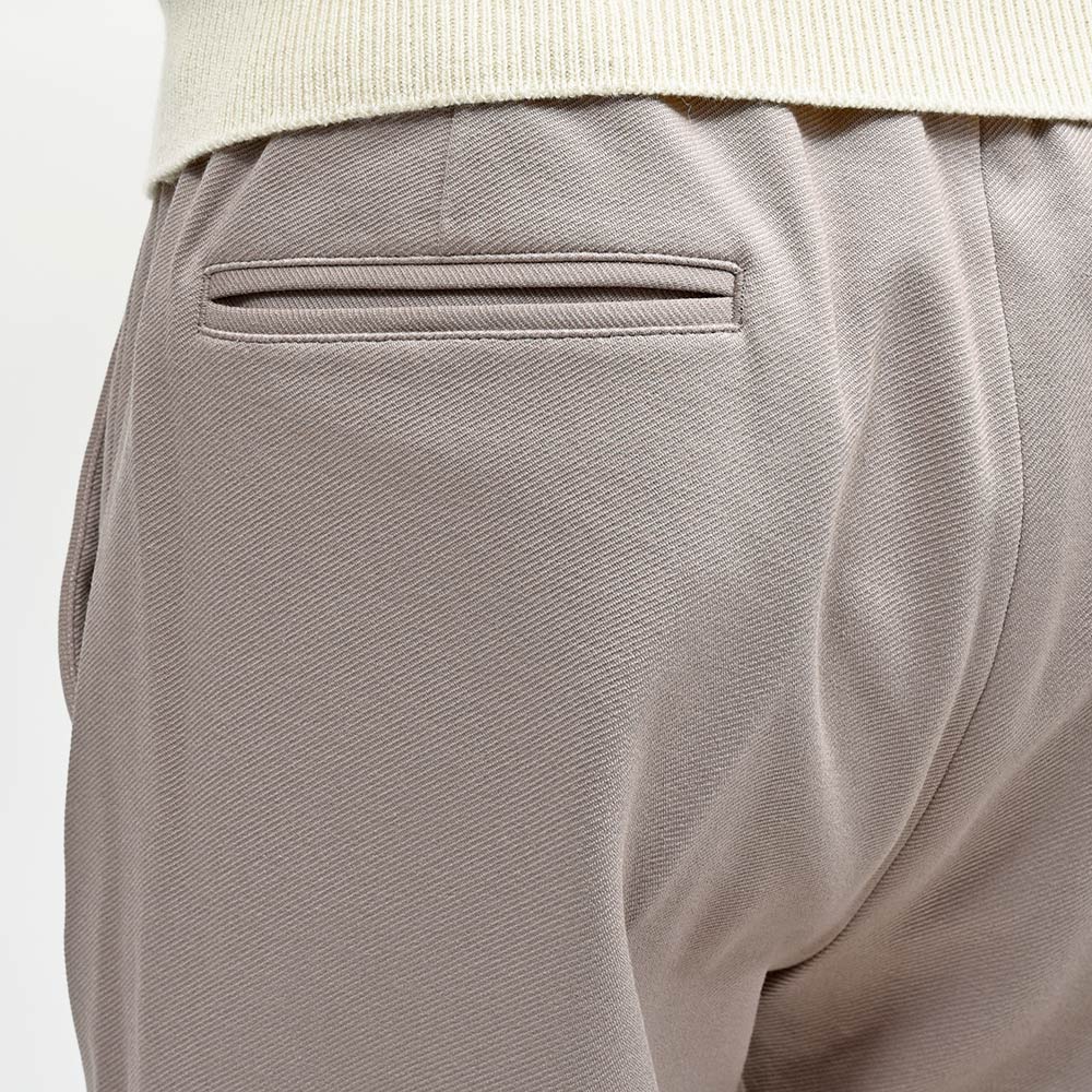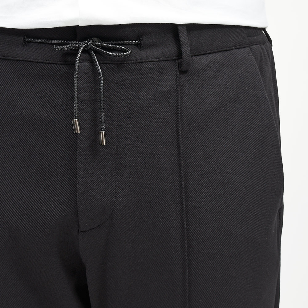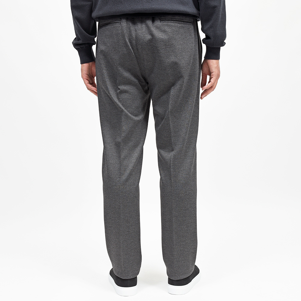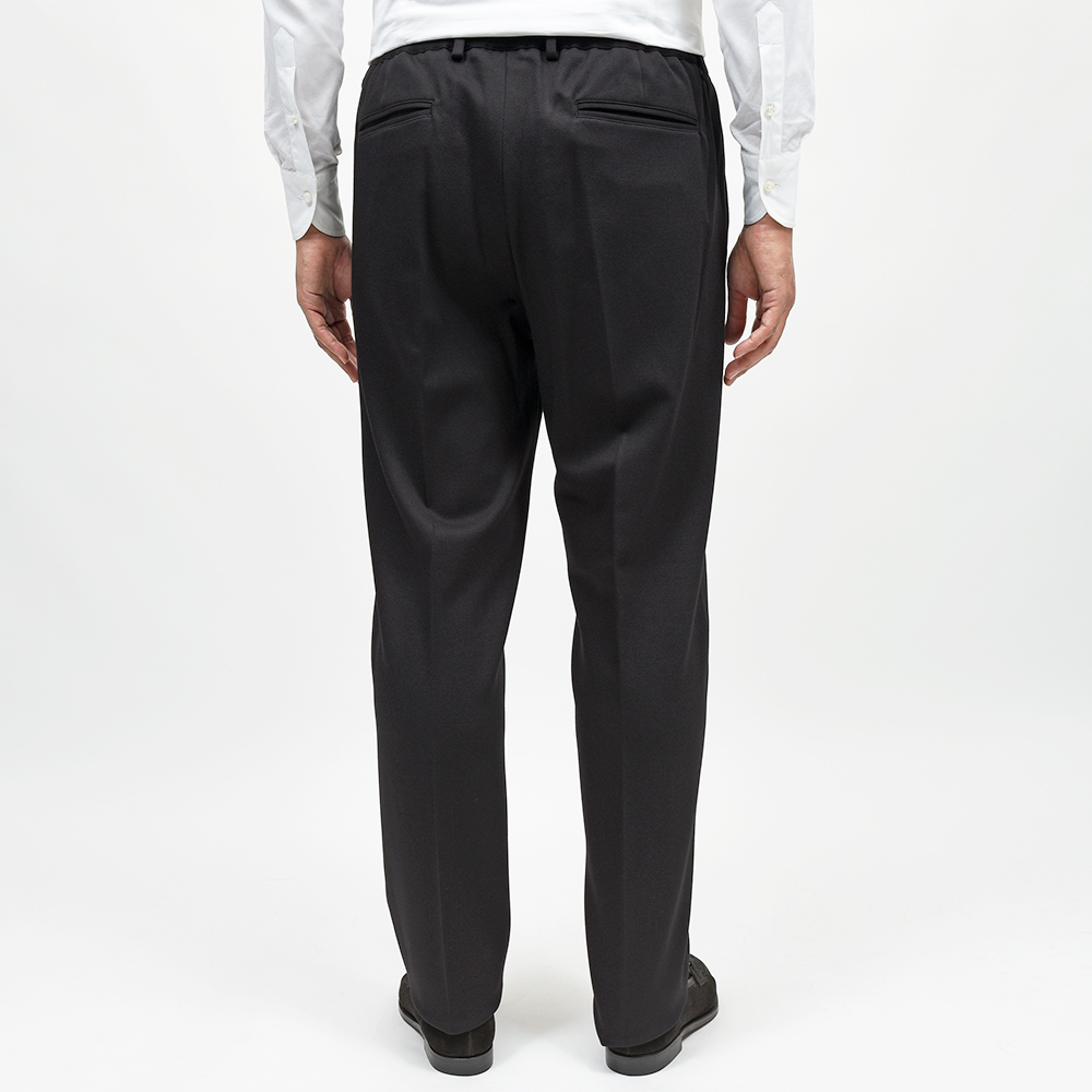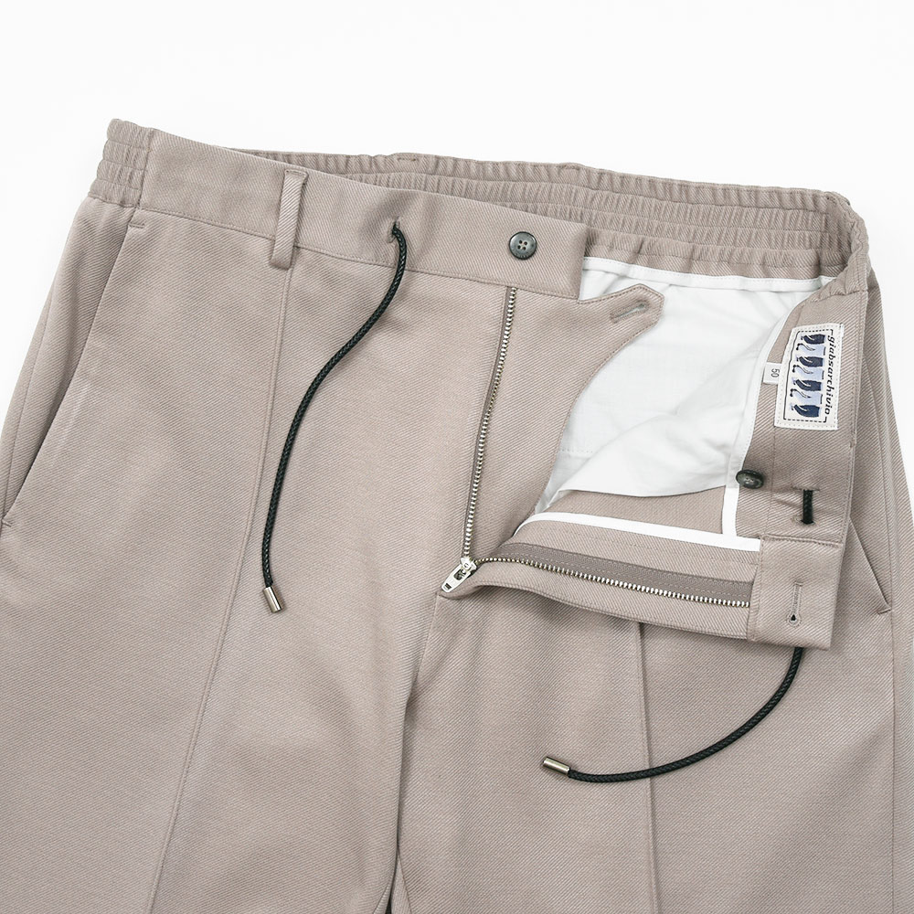 MASACCIO/3GはMASACCIOの特徴である永久クリースや、内側に隠せるドローコードなどのディティールを継承しつつも、現代的なフィッティングに再解釈したモデルになります。こちらの別注モデルでは、通常ウエストのサイドのみに施されたゴムを、後半身がシャーリング仕様となりより高い伸縮性を持たせています。