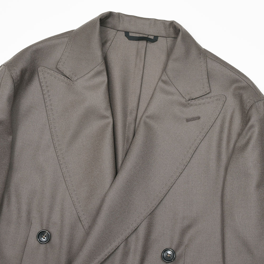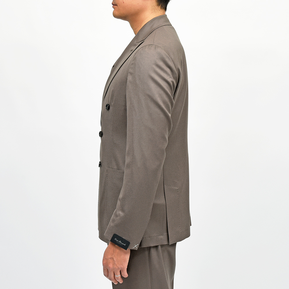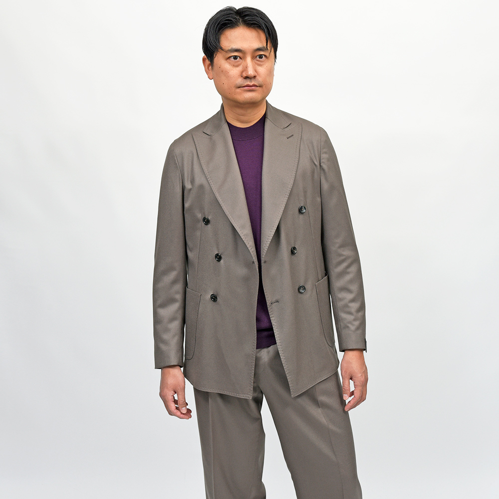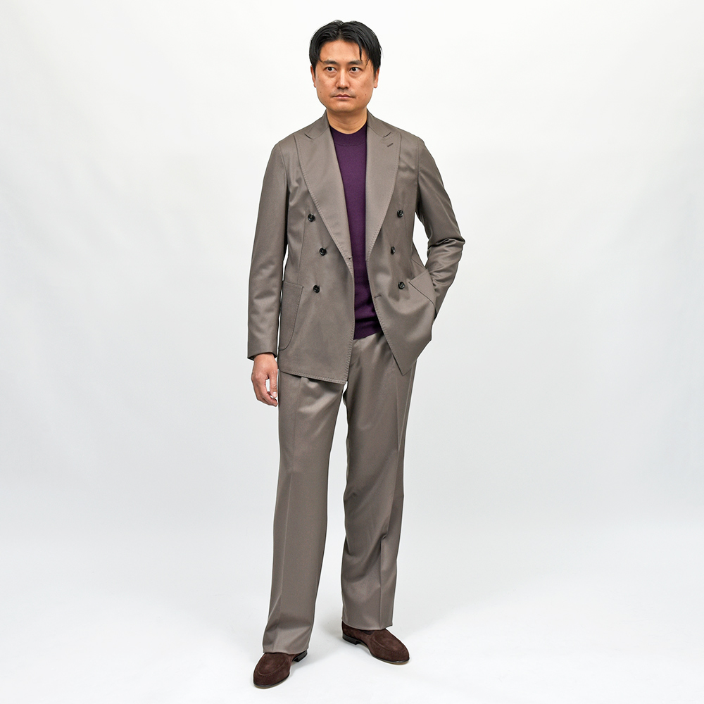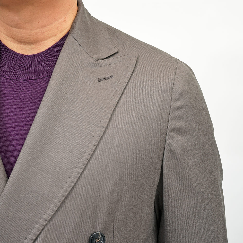スタンダードなフィッティングが魅力のダブルブレストモデル“MARCO DP”。太過ぎず細過ぎないモダンな表情のラペル幅に、ドロップ7のクラシカルなスリムシルエットになります。一部接着芯を使用したアンコン仕立ての軽やかな着心地でありながらも、程よくドレスライクに見える仕立ての良さを感じることができます。