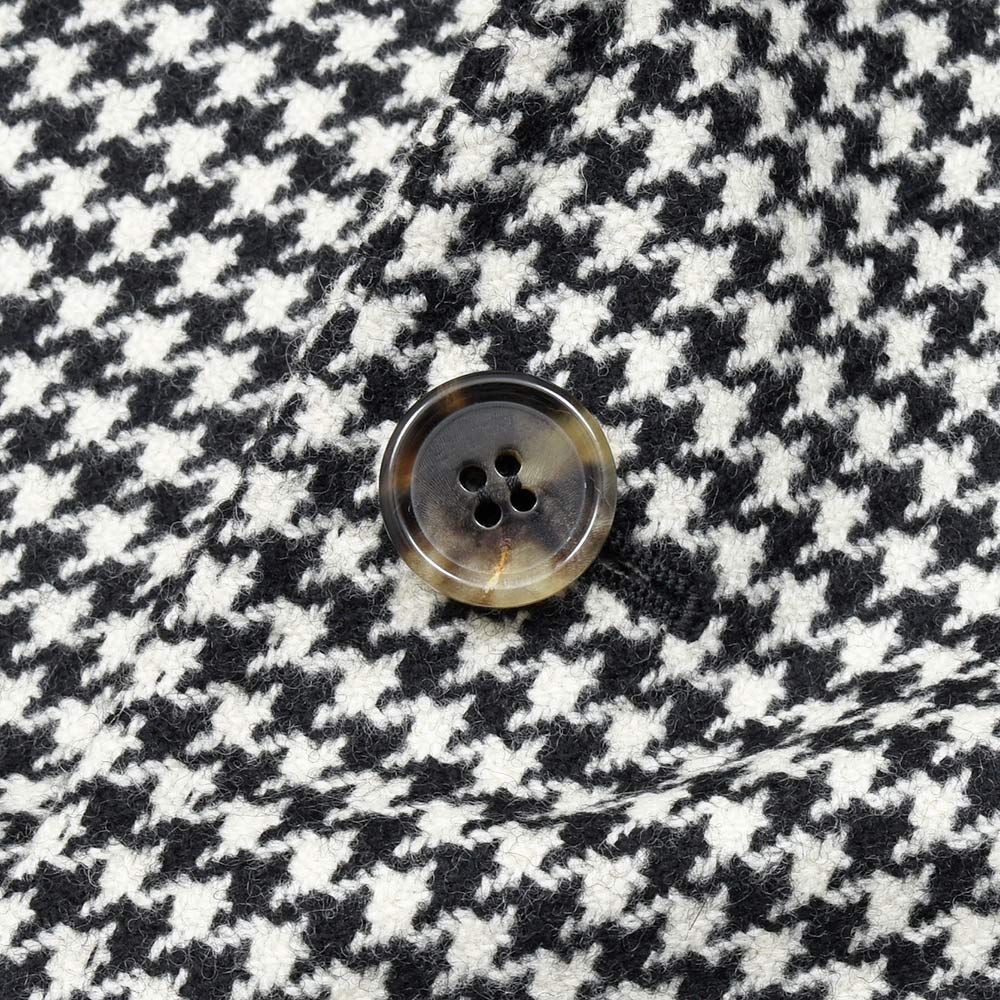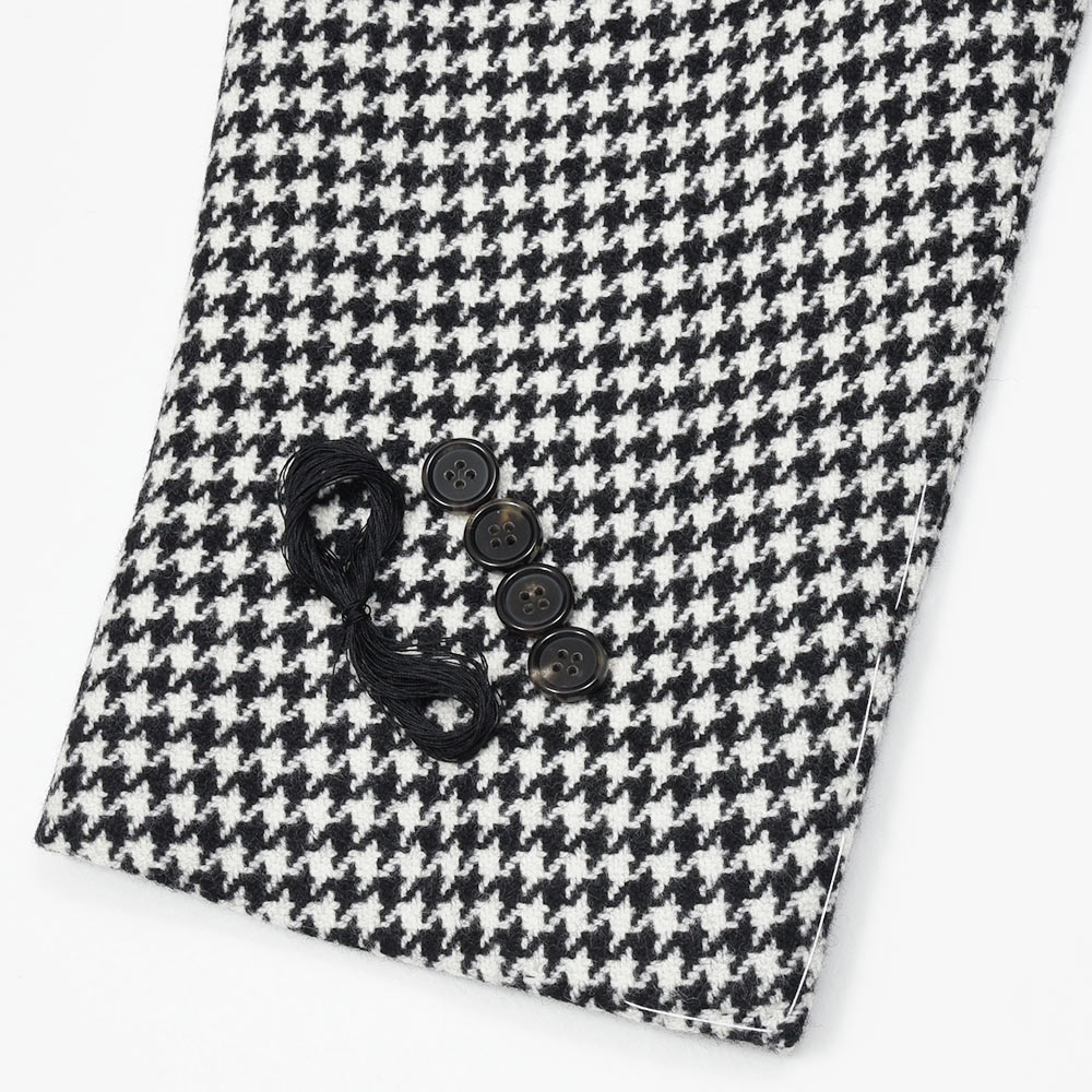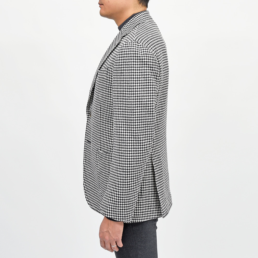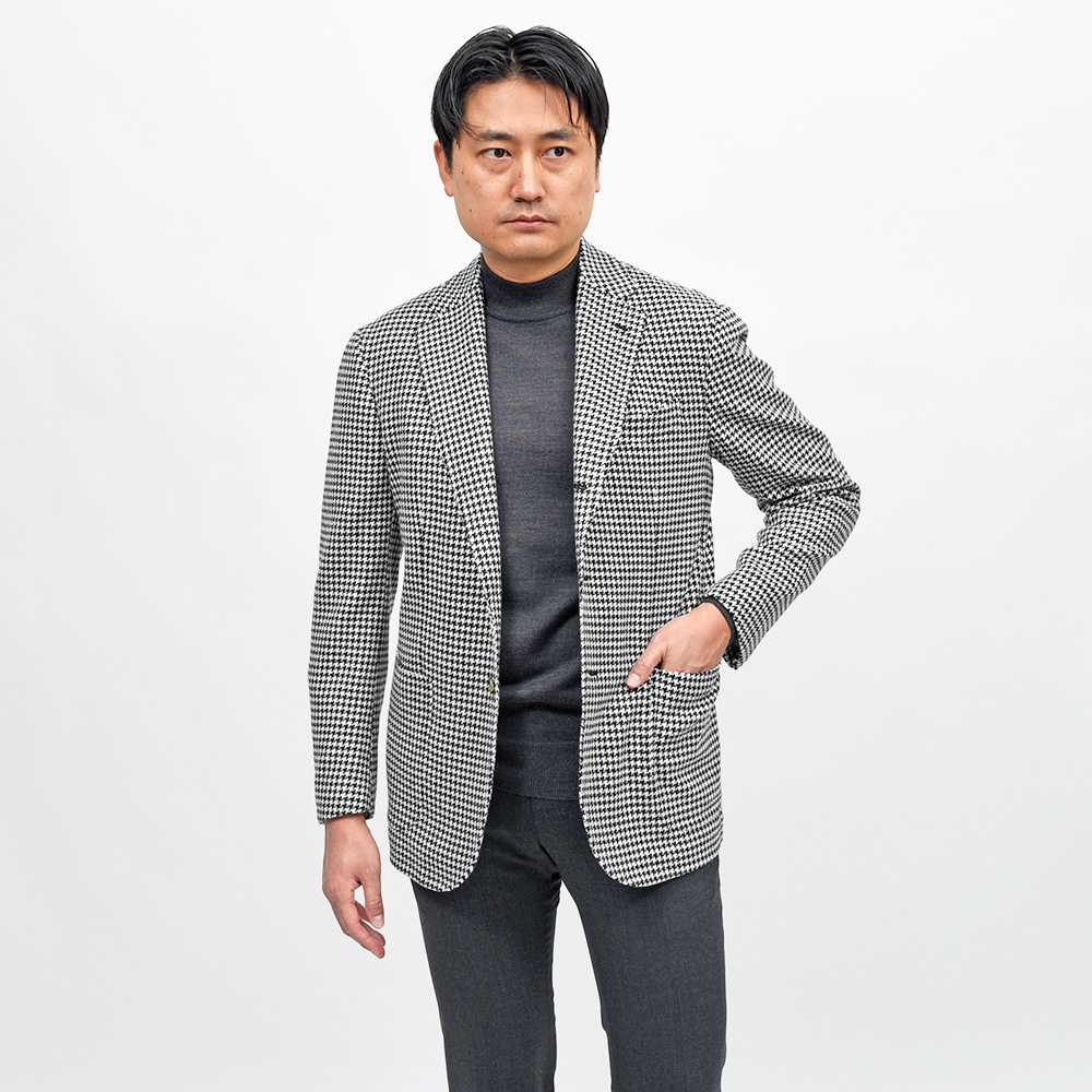 ツイード調の見た目ですが、目付け310gと秋冬素材ではやや軽いウエイトのハウンドトゥース。起毛感はありながらも目付けが軽いため、昨今の気候が加味された一着となっています。ブラック×ホワイトのハウンドトゥースは、何とも言えないモダンな色気を香らせています。