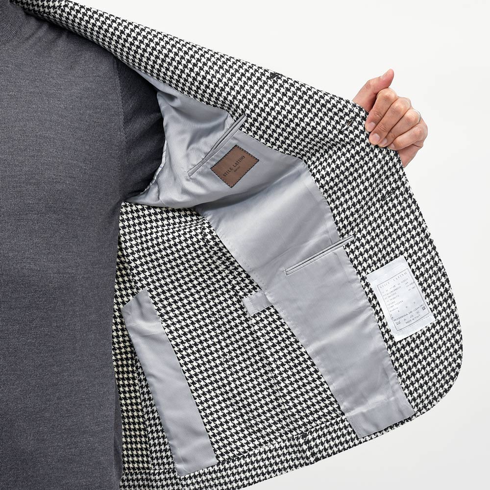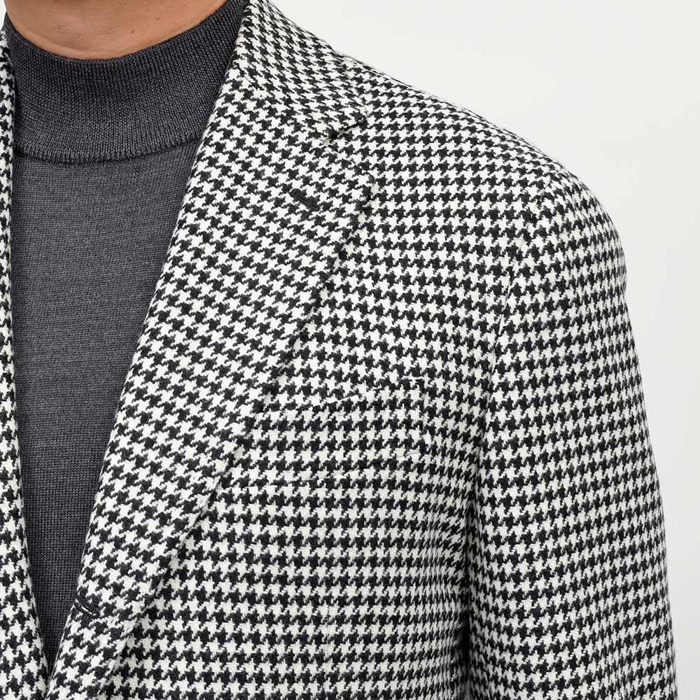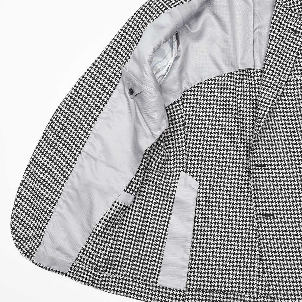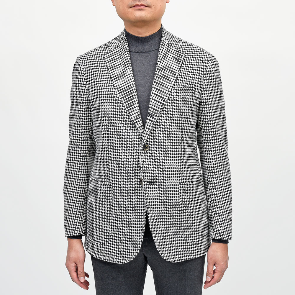 ツイード調の見た目ですが、目付け310gと秋冬素材ではやや軽いウエイトのハウンドトゥース。起毛感はありながらも目付けが軽いため、昨今の気候が加味された一着となっています。ブラック×ホワイトのハウンドトゥースは、何とも言えないモダンな色気を香らせています。