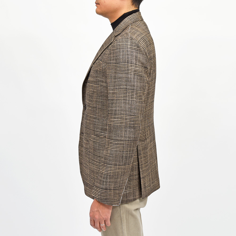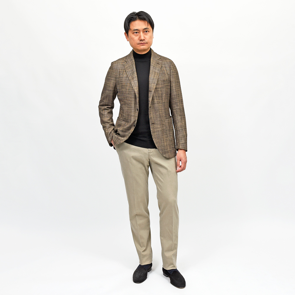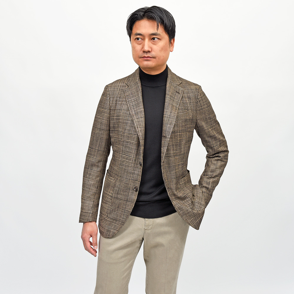 秋冬ではやや軽い目付け290gのグレンチェックジャケットは、ヴァージンウール×カシミヤの贅沢な素材使い。ヴァージンウールの滑らかな光沢感に、カシミヤのふんわりと柔らかなタッチがクラス感のある佇まいです。また、副資材をほとんど省いた段返り3つボタンシングルジャケットのニューモデル“GINZA”を採用。裏地も袖裏のみと非常に軽やかでありながらも、アンコンジャケットとは思えないエレガントな姿を作り上げてくれます。
