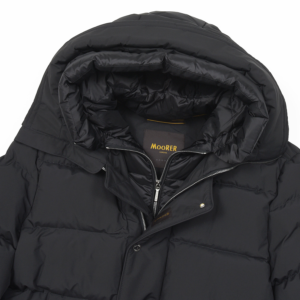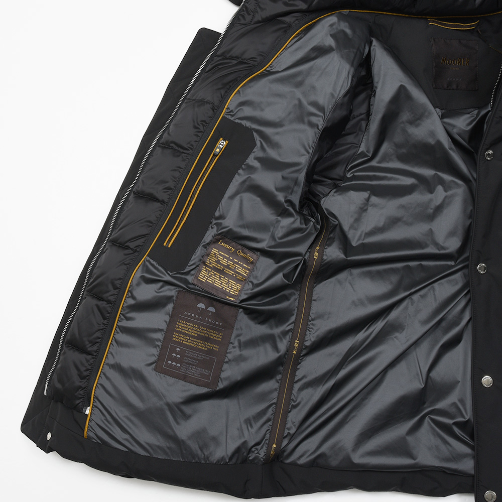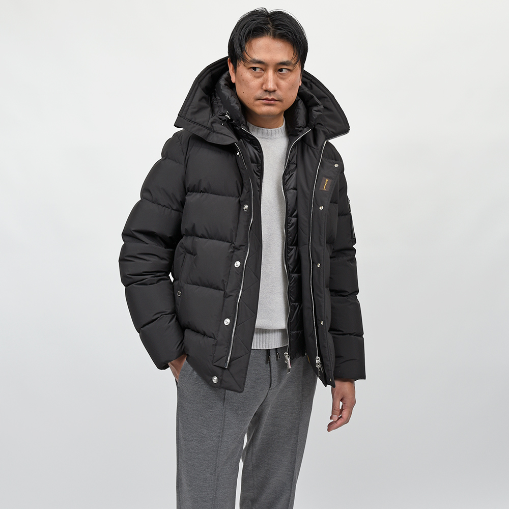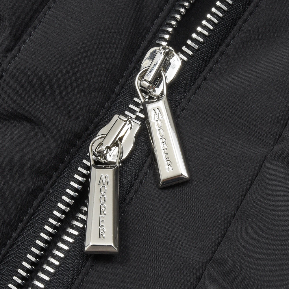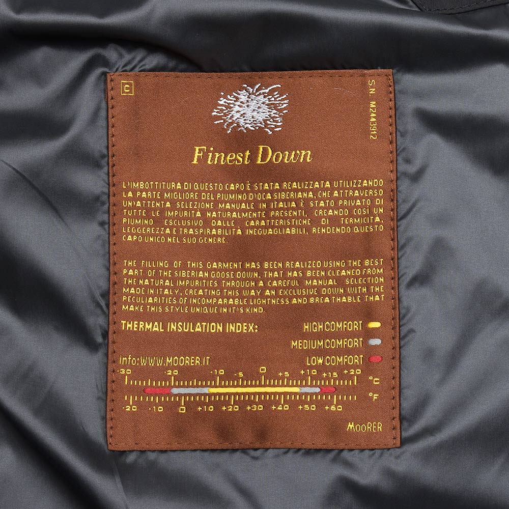 MooRERは最高のフィルパワーを誇るシベリア産の最高級ホワイトグースダウンを贅沢に使用。特注のファスナーに、裏地のナイロン素材の美しさ加えてパイピング処理を施した丁寧な仕上げ、またダウンにとって必要不可欠な防寒性に隙はなく、かといって着膨れしないシルエットは秀逸としか言いようがありません。
