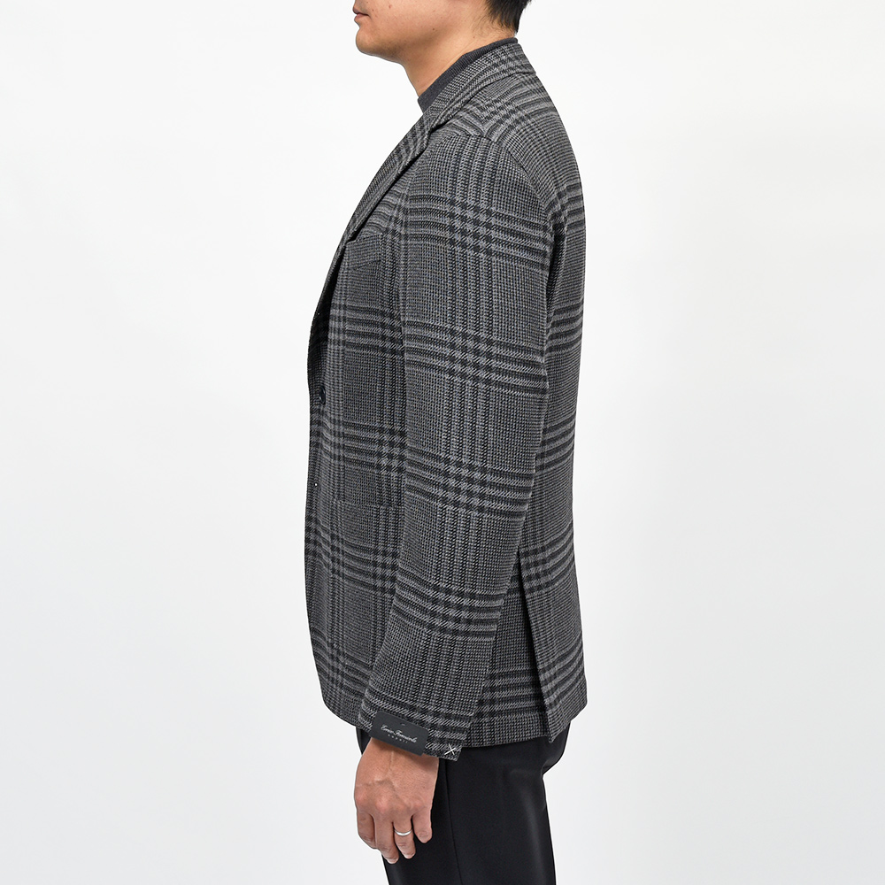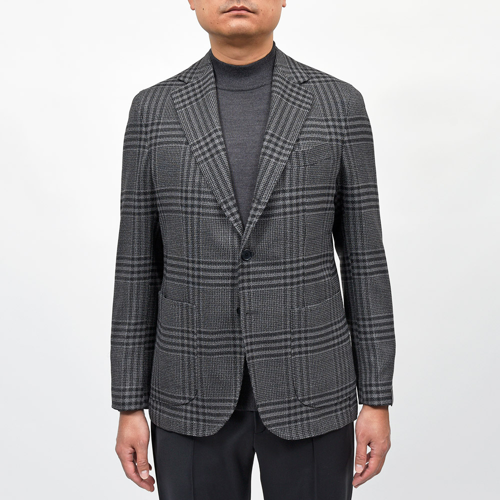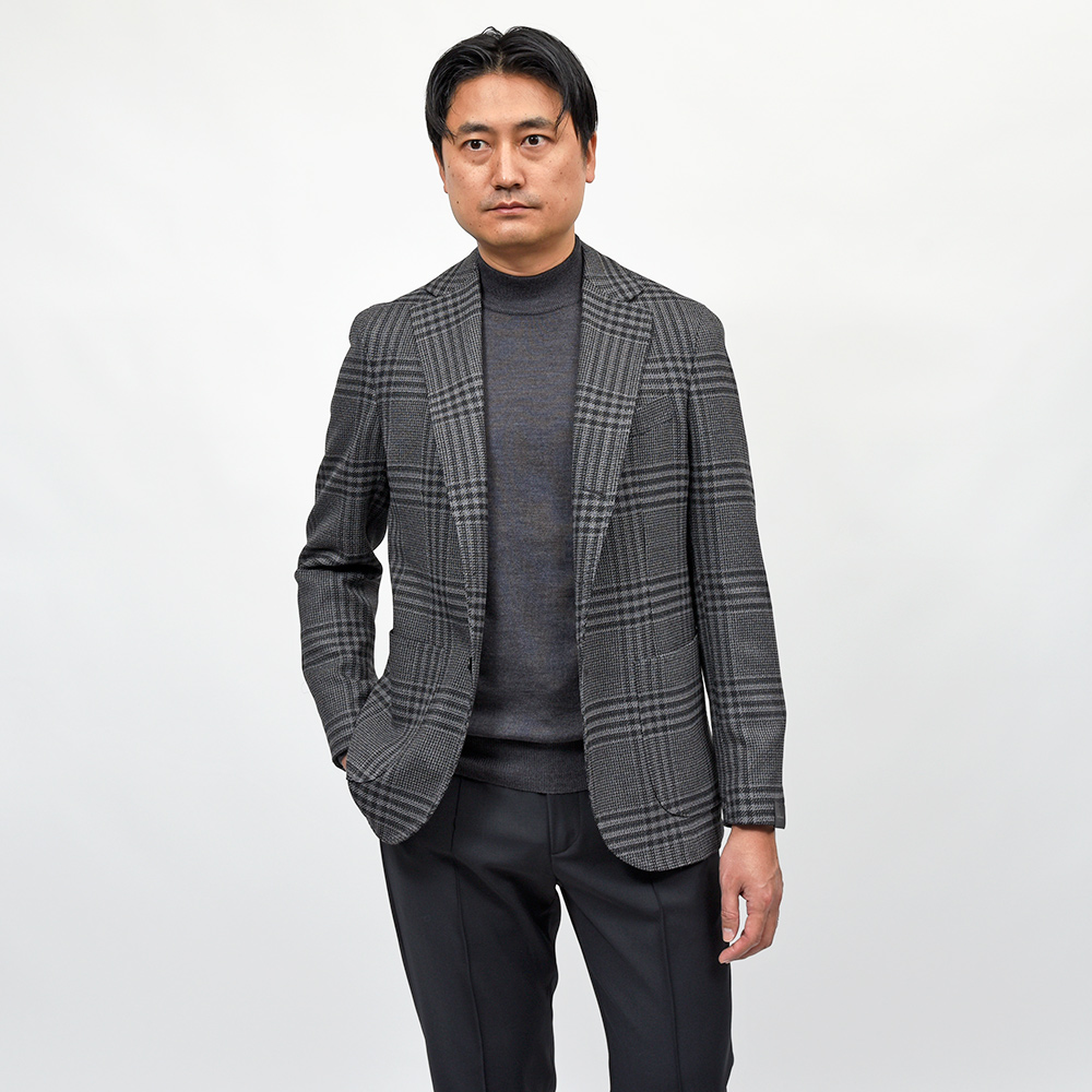 目付け395gのウール素材を使用したグレンチェックジャケット。少しドライなタッチのファブリックを使用しており、真夏以外の3シーズンで着用することができます。また、ほのかなストレッチ性に、グレー×ブラックのグレンチェックはシックな印象でモダンな佇まいを生んでいます。