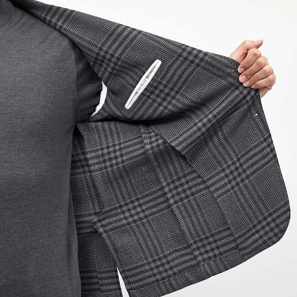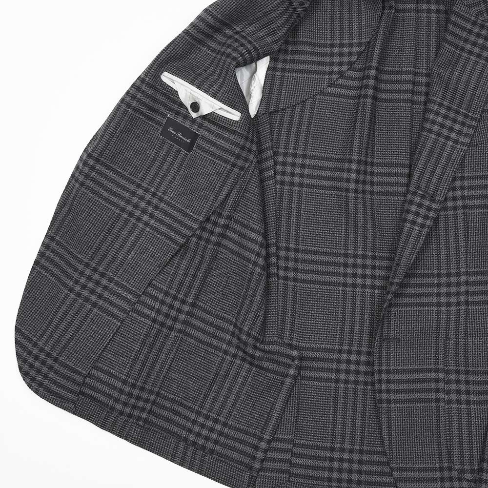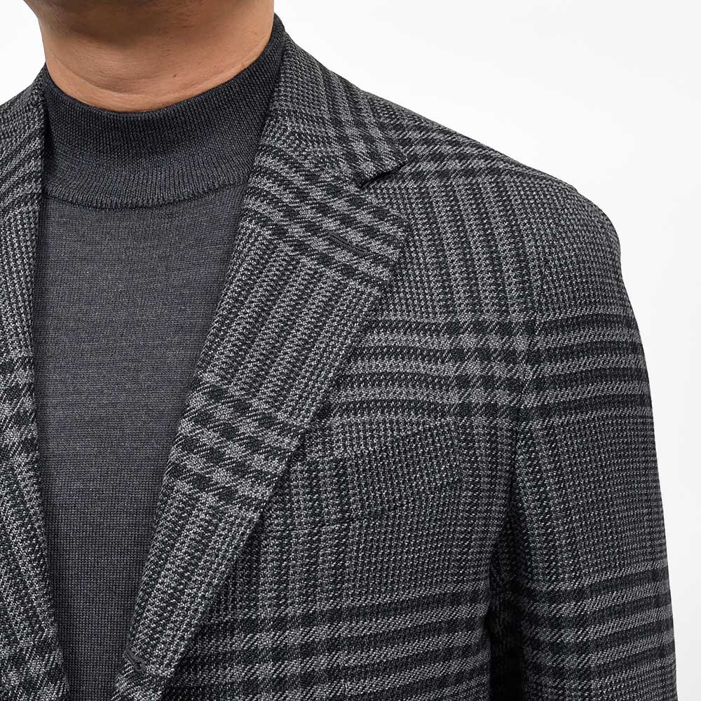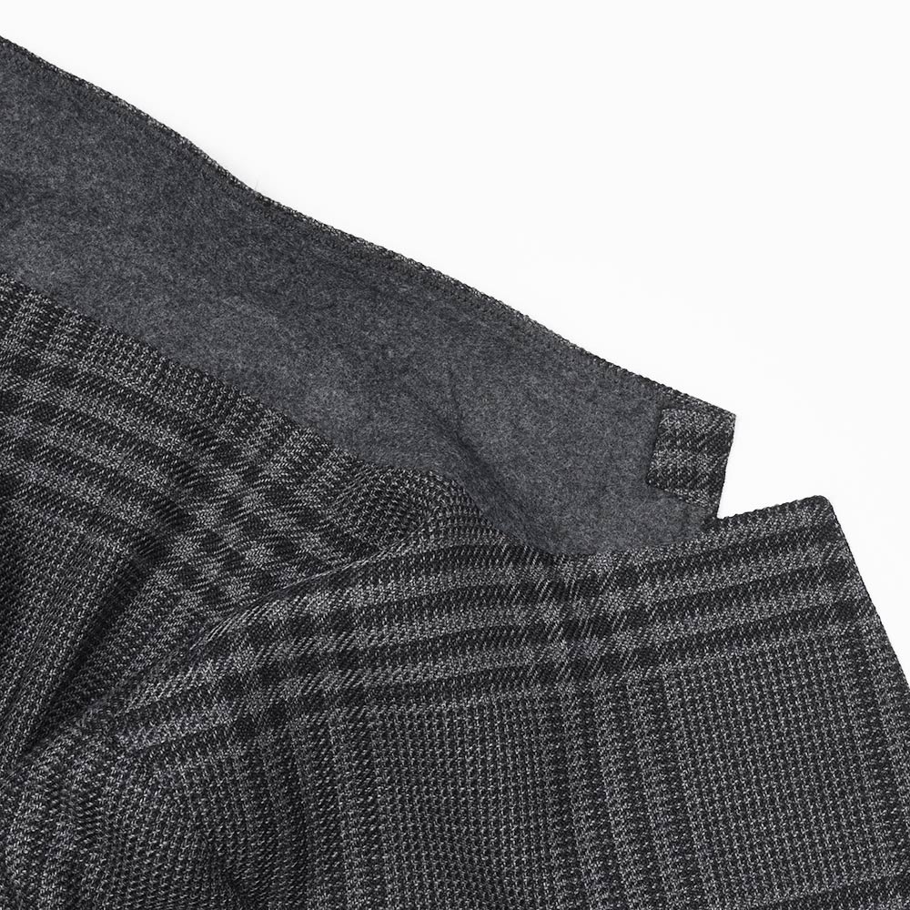 目付け395gのウール素材を使用したグレンチェックジャケット。少しドライなタッチのファブリックを使用しており、真夏以外の3シーズンで着用することができます。また、ほのかなストレッチ性に、グレー×ブラックのグレンチェックはシックな印象でモダンな佇まいを生んでいます。