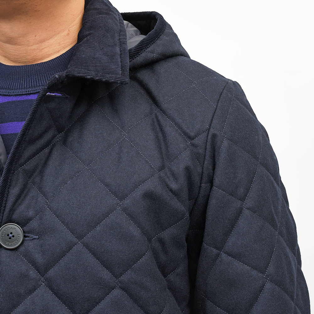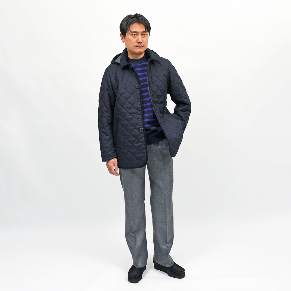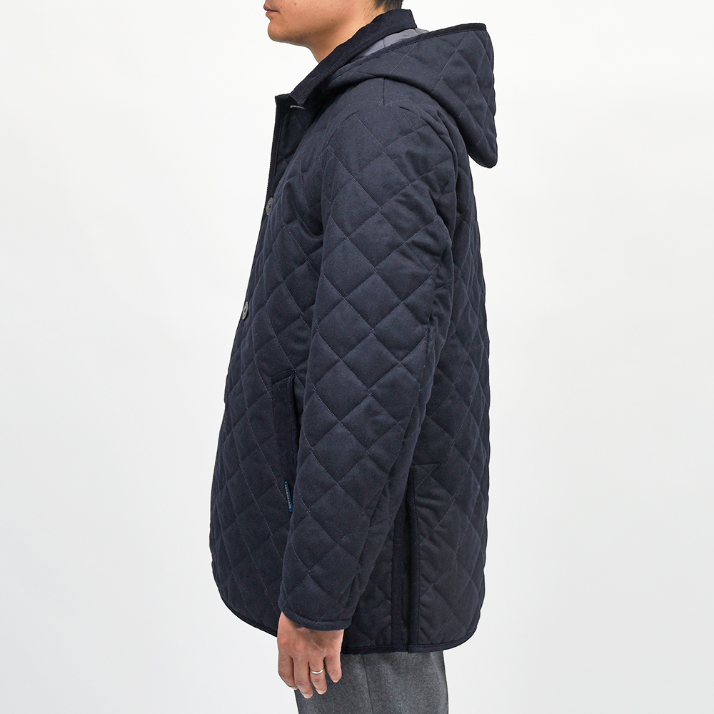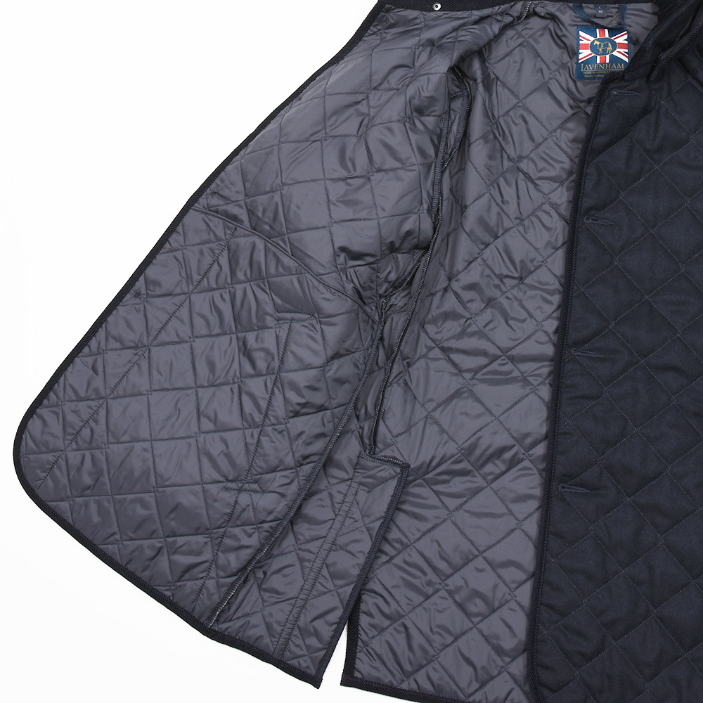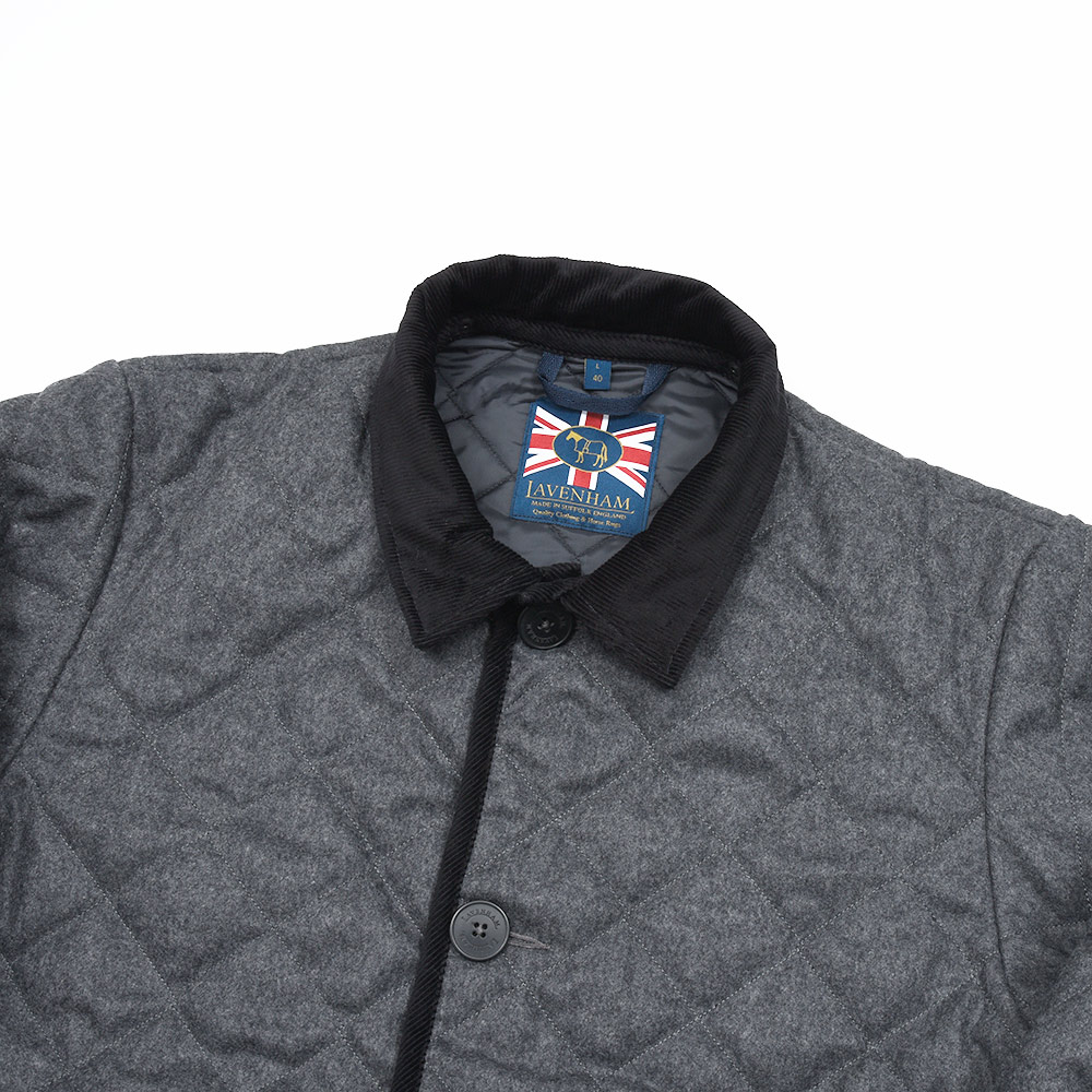 表地にポリエステルナイロンよりも保温性の高いウール素材を使用し、LAVENHAMの代名詞とも言える“2インチダイヤモンドキルティング”で仕上げた盤石の仕様に、軽量でありながら保温性に優れた中わた。耐久性の向上のために施されたオーガニックコットンのコーデュロイバインディングなど、現在でもすべての商品をサフォーク州サドバリーの自社工場で製造する品質管理の徹底ぶりによって、キルティングジャケットといえばLAVENHAMという確固たる地位を築いています。