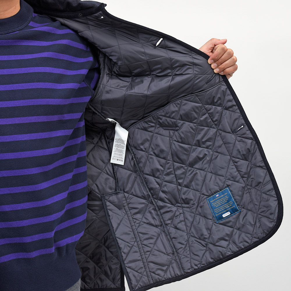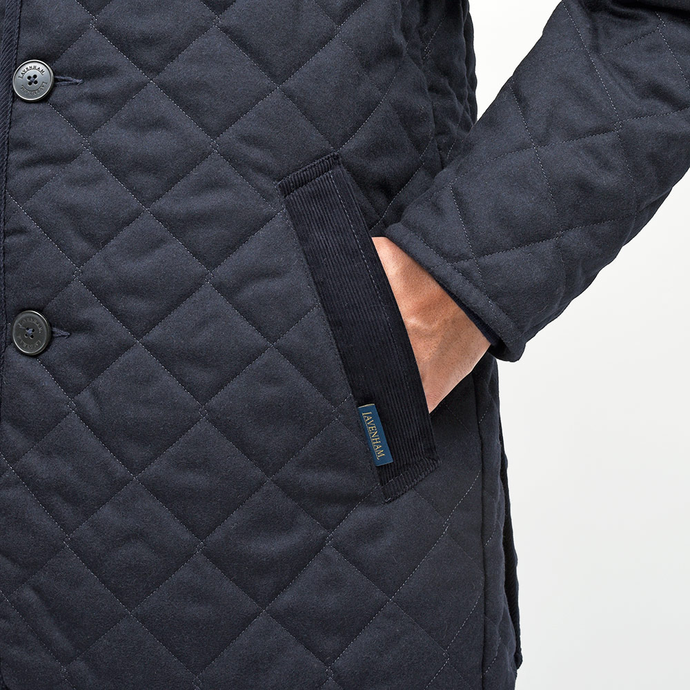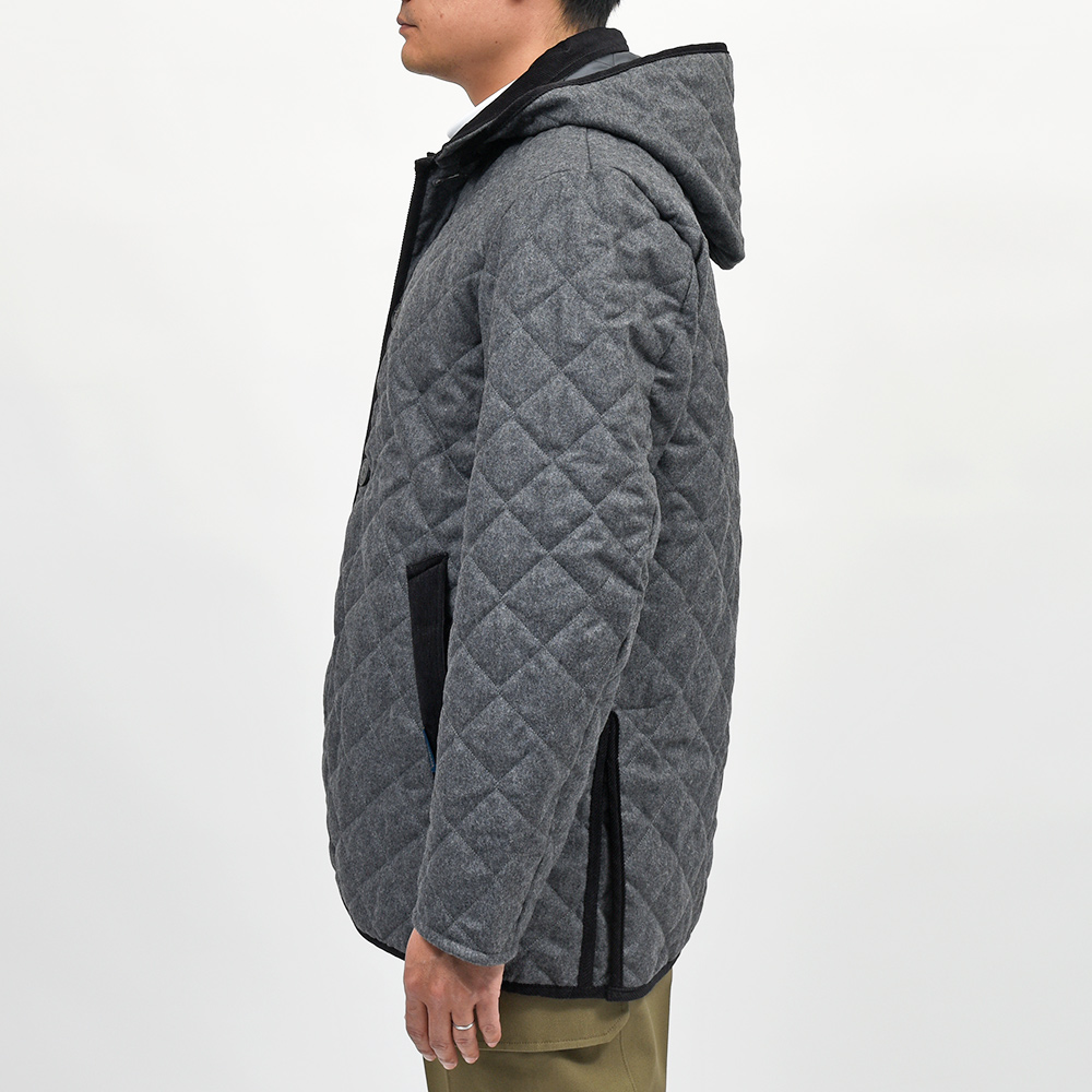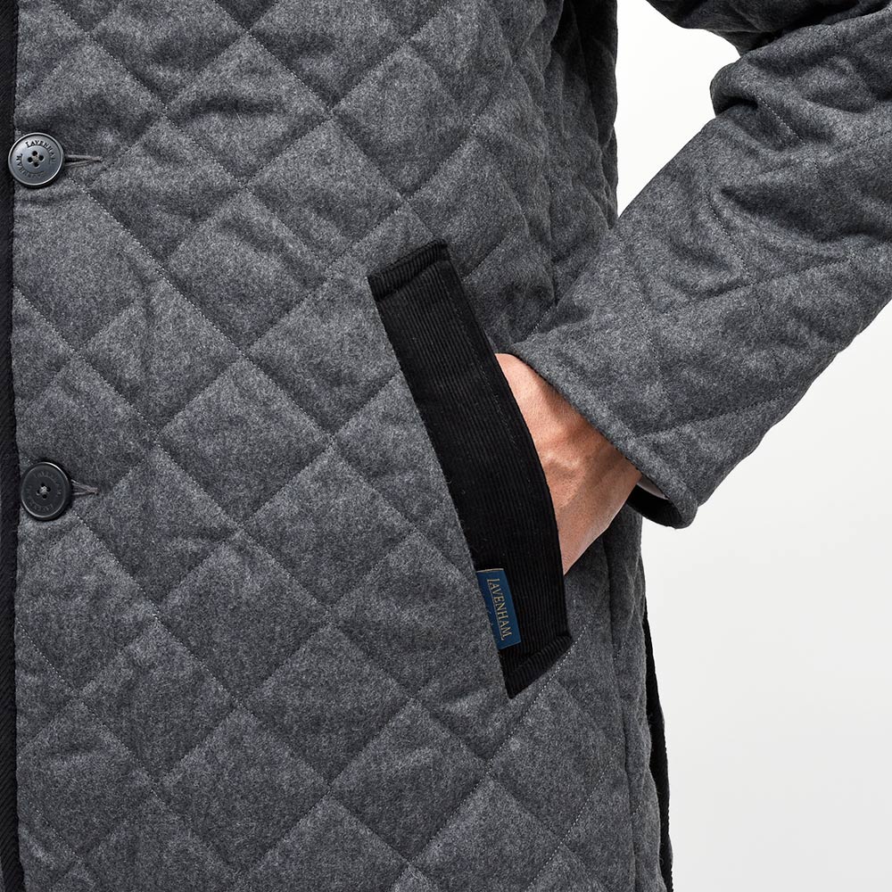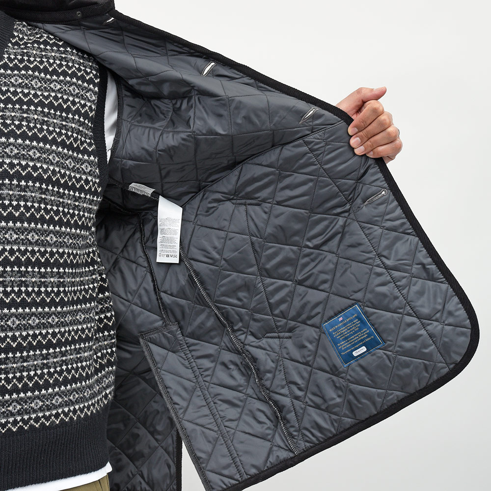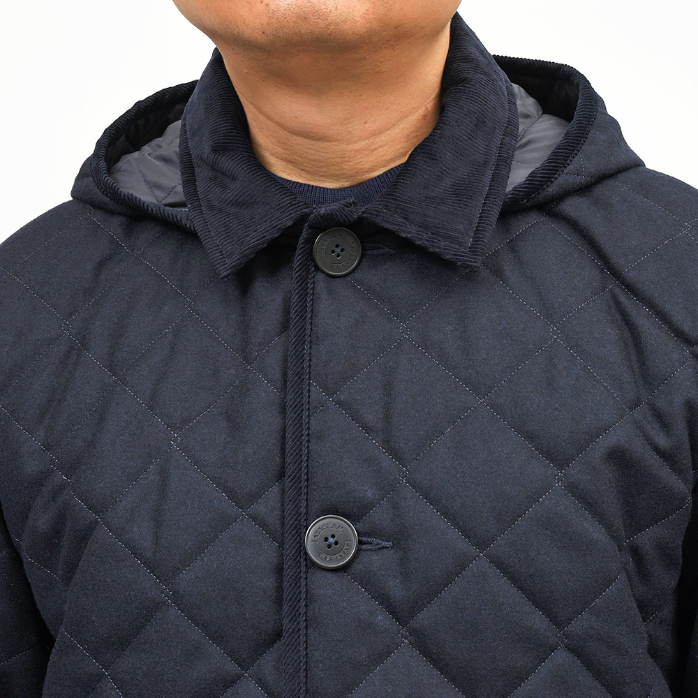 表地にポリエステルナイロンよりも保温性の高いウール素材を使用し、LAVENHAMの代名詞とも言える“2インチダイヤモンドキルティング”で仕上げた盤石の仕様に、軽量でありながら保温性に優れた中わた。耐久性の向上のために施されたオーガニックコットンのコーデュロイバインディングなど、現在でもすべての商品をサフォーク州サドバリーの自社工場で製造する品質管理の徹底ぶりによって、キルティングジャケットといえばLAVENHAMという確固たる地位を築いています。
