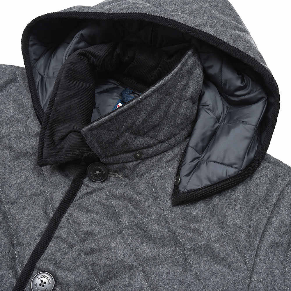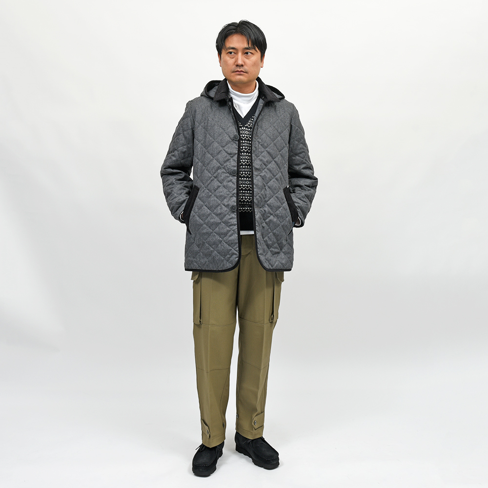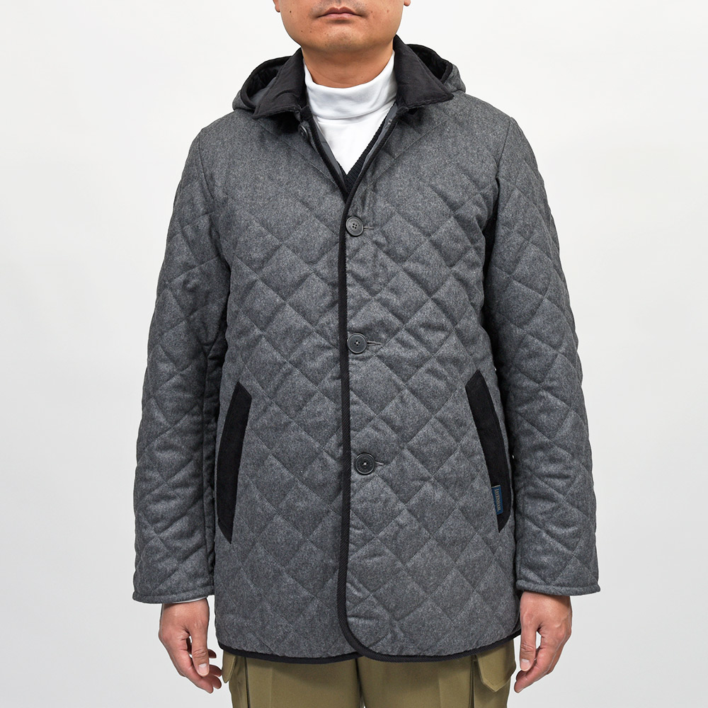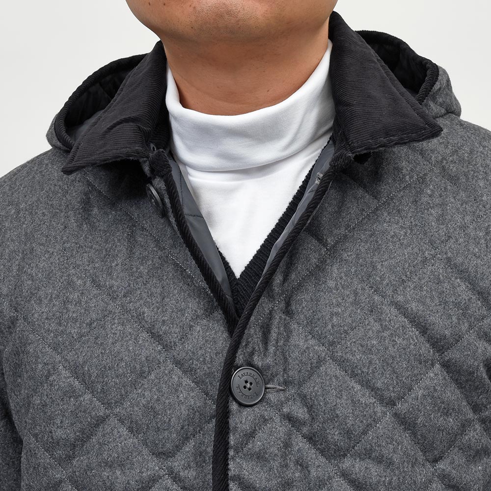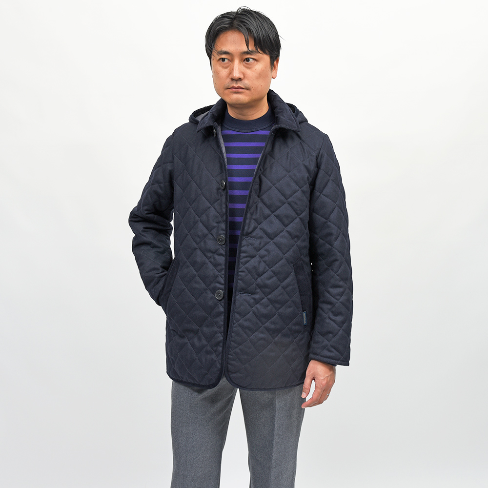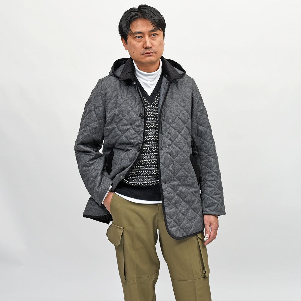 LAVENHAMの定番モデル“DENSTON(デンストン)”。リラックスしたシルエットに、取り外し可能なフードが備えられており、オンでもオフでも着回せる高い汎用性を持った、ジャケットとコートの中間のようなアウターになります。