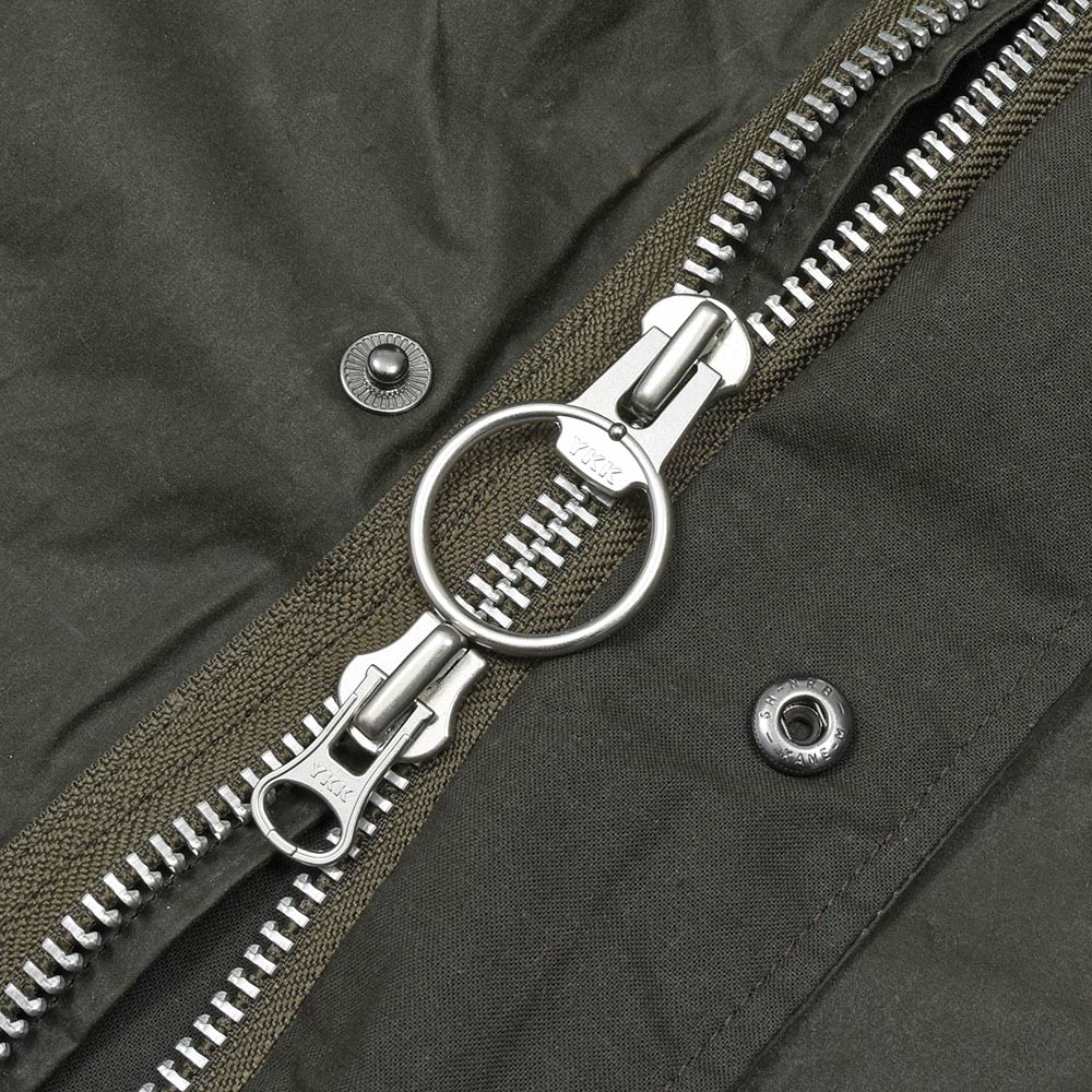 アメリカ軍のスノーパーカをベースにパターンを引き、M-65のディティールを取り入れたFIELD PARKA。フロントのダブルジップにリングの引き手や、衿に収納されたフードなどディティールを忠実に再現しつつも、ドロップショルダーにしっかりとゆとりのあるシルエットが今日的な空気感を作り上げています。また、袖口のアジャストボタンや、ウエストと裾のスピンドルによってシルエットに変化をつけることができます。