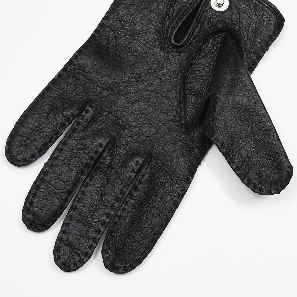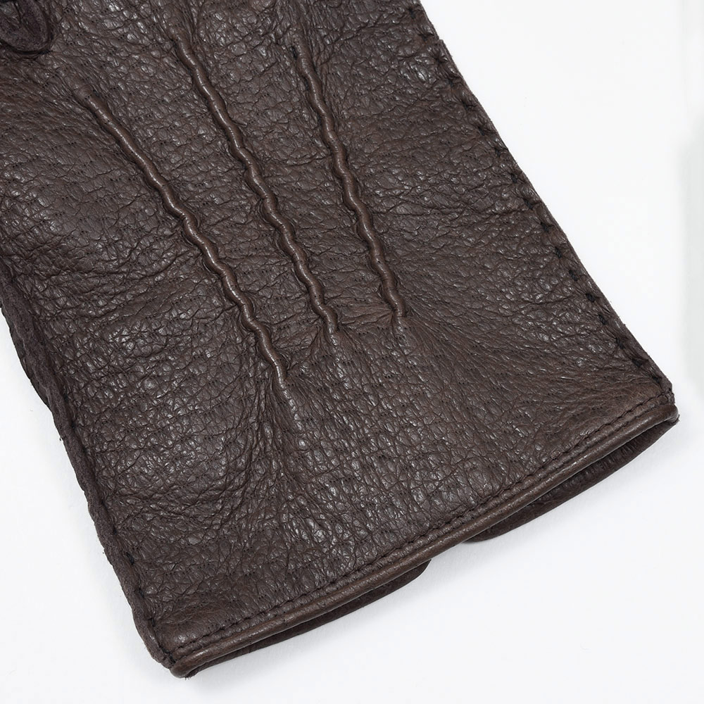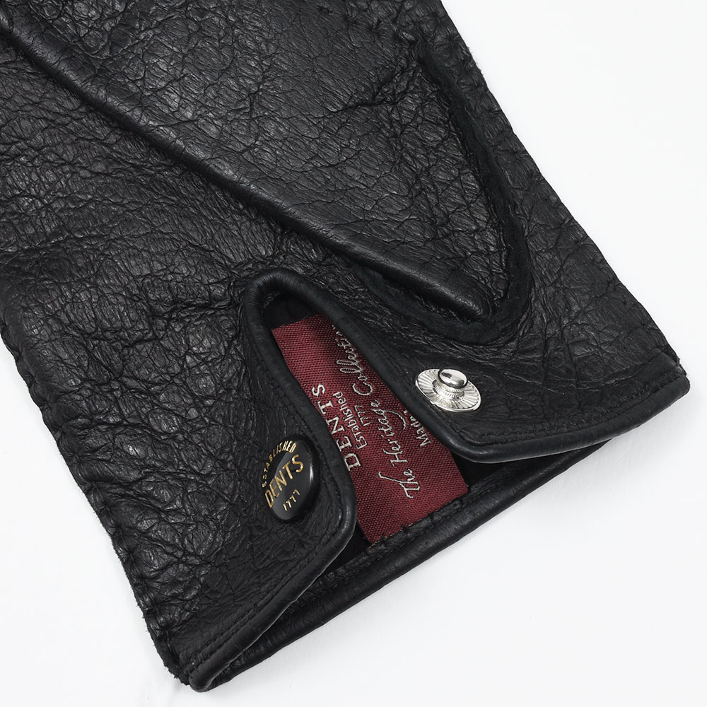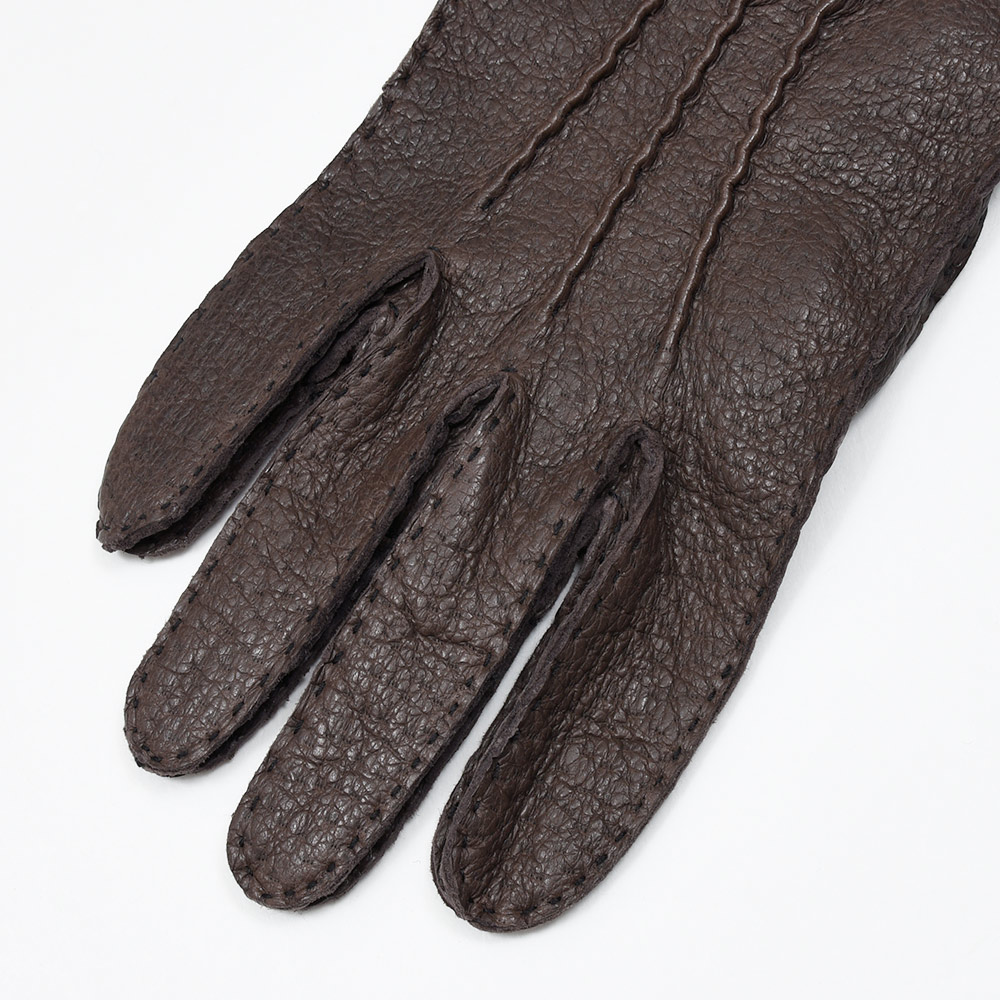 高級とされるペッカリーレザーを使用。ペッカリーレザーといえば”DENTSのグローブ”と言われるほどの代名詞となっています。ペッカリーレザーは軽くて丈夫、摩擦にも強く通気性も良い革と言われ、着用してみると伸縮性に優れ独特の柔らかさと風合いがあります。これは他の革では決して真似する事が出来ず、感覚の鋭い人間の手で使用するグローブに最も適した素材はペッカリーとゆう結論に至ります。 DENTSにのみ許されたフィット感は、マスターカッターと言われる熟練の職人による技術と経験によるところが大きく、DENTSのグローブが『第二の皮膚』と云われる所以がそこにあります。
