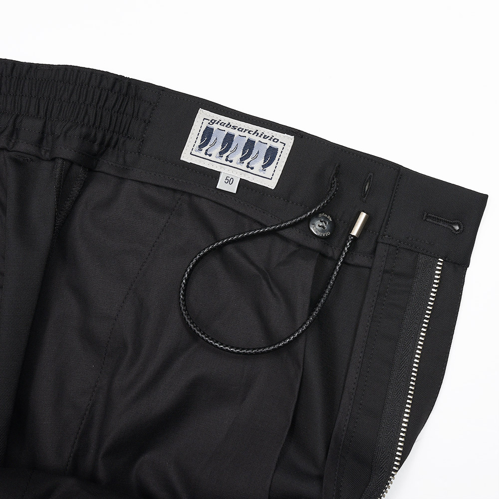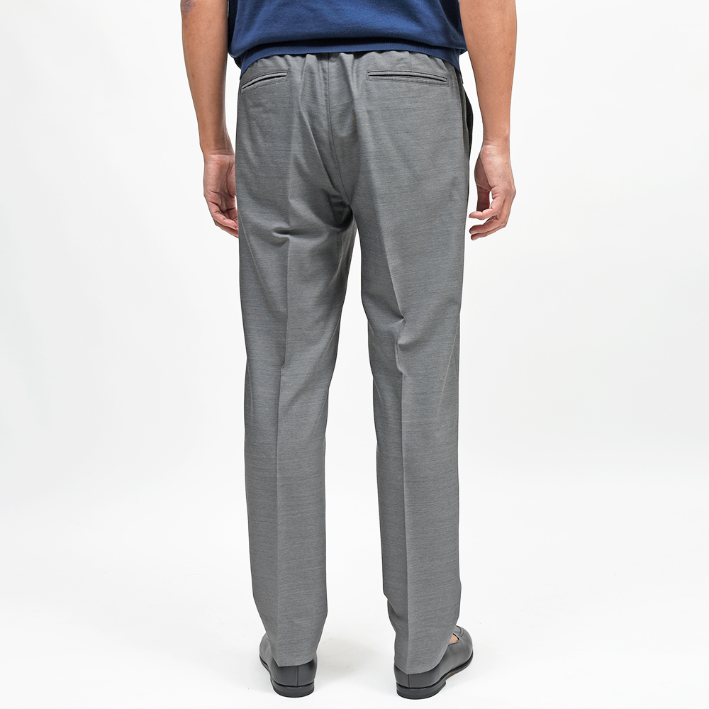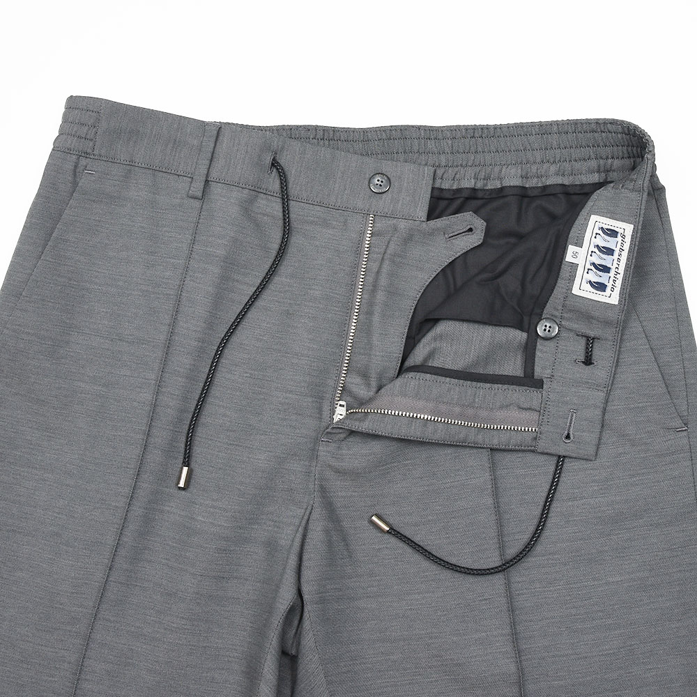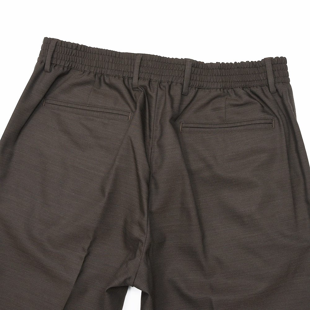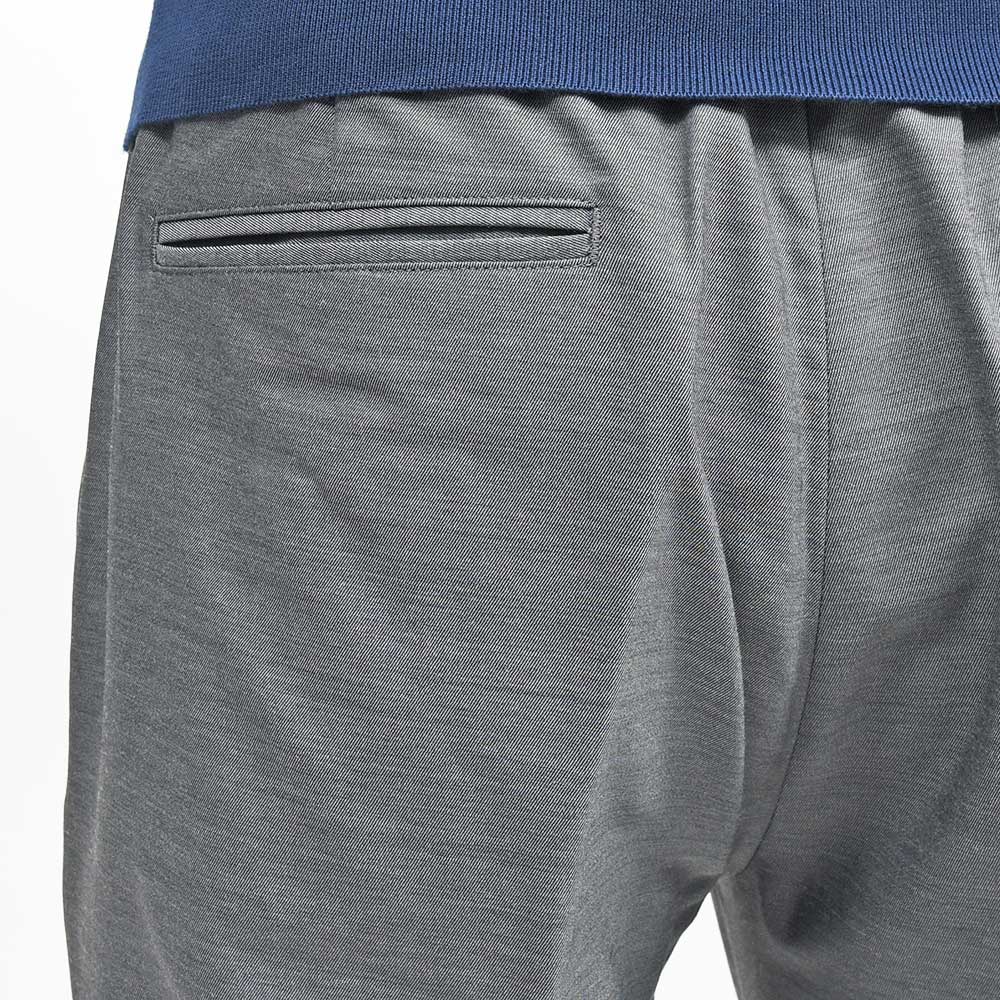 MASACCIO/3GはMASACCIOの特徴である永久クリースや、内側に隠せるドローコードなどのディティールを継承しつつも、現代的なフィッティングに再解釈したモデルになります。こちらの別注モデルでは、通常ウエストのサイドのみに施されたゴムを、後半身がシャーリング仕様となりより高い伸縮性を持たせています。