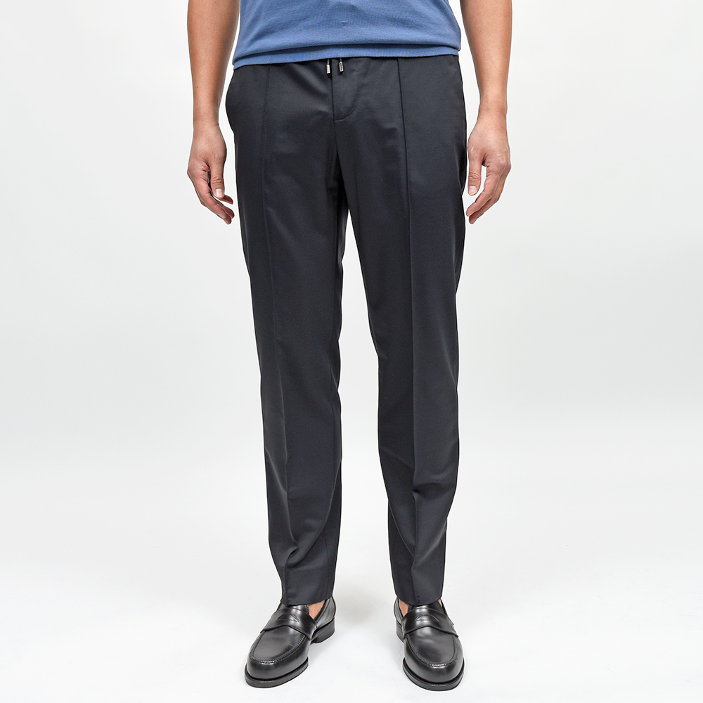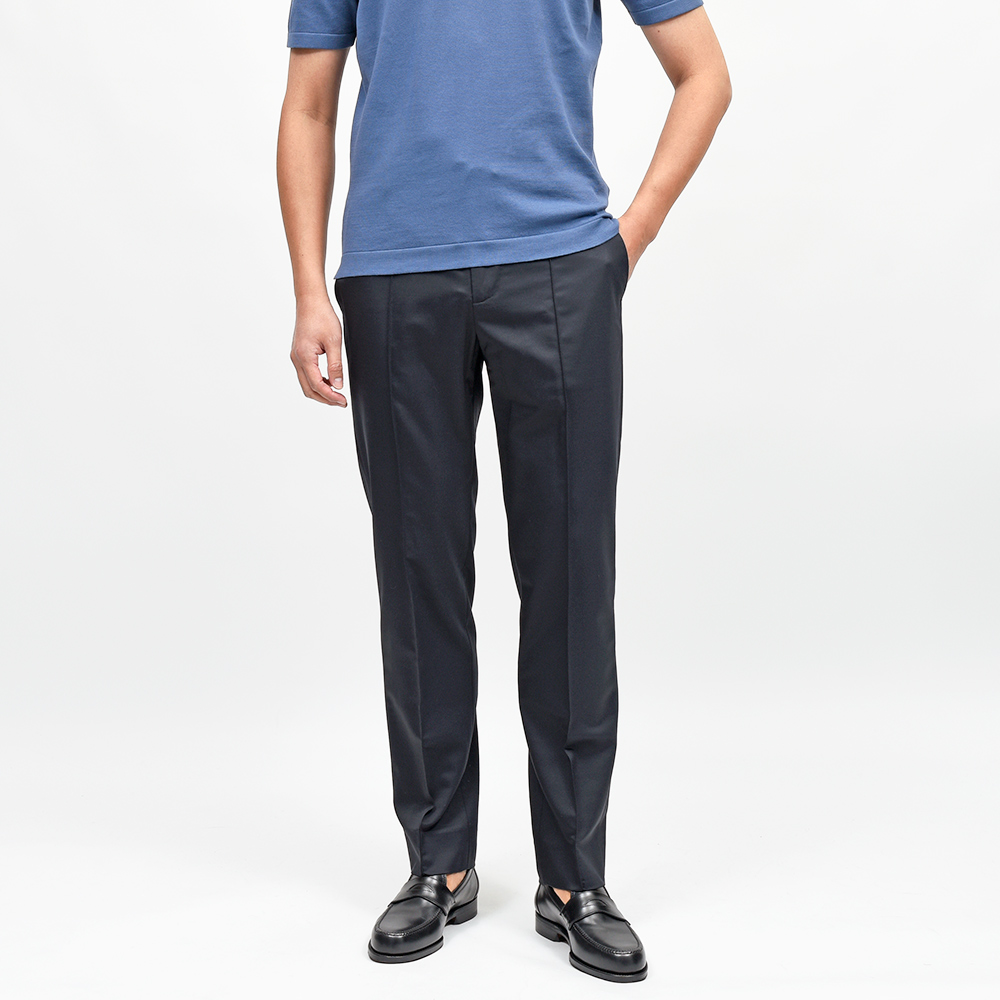 サイズ48がジャストサイズです。ヒップ・ワタリにゆとりがありますがノープリーツでスッキリとしています。裾にかけて程よくテーパードしていて細すぎない印象です。ナイロン・ウールのストレッチ素材が涼しげな一本です!