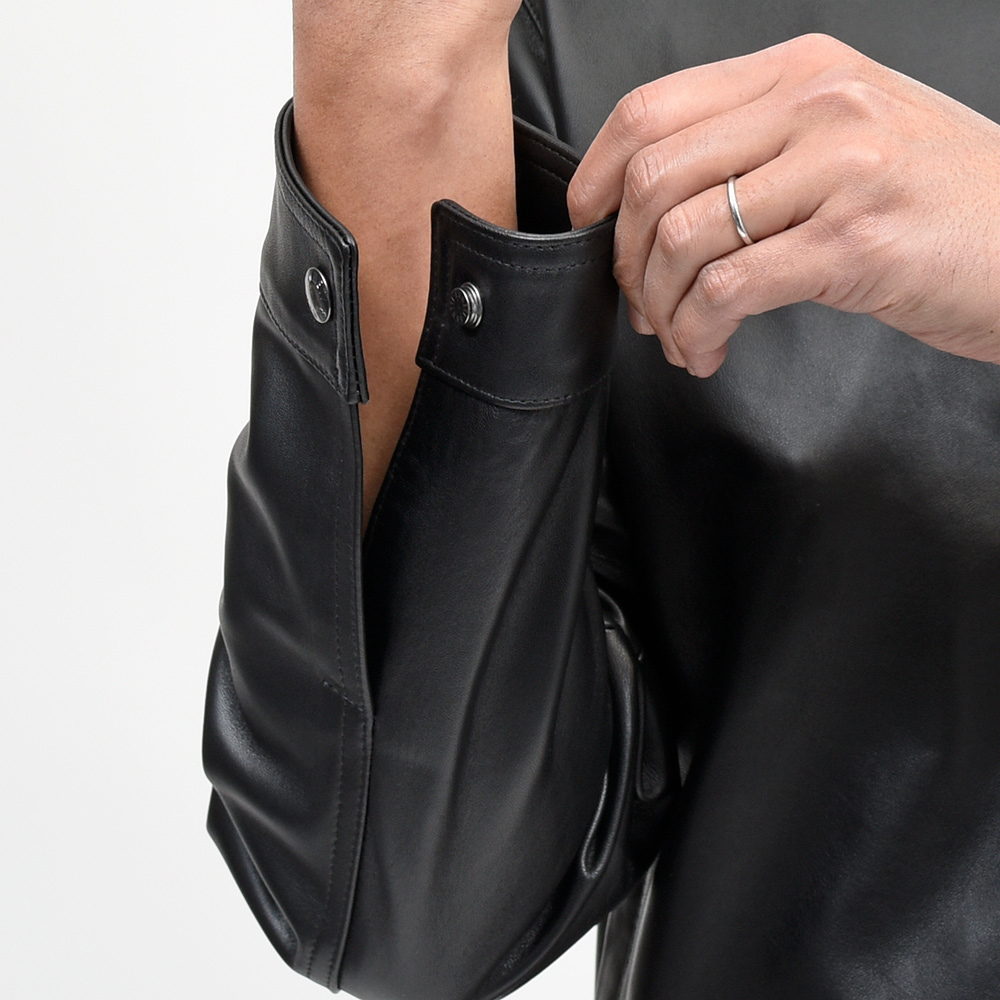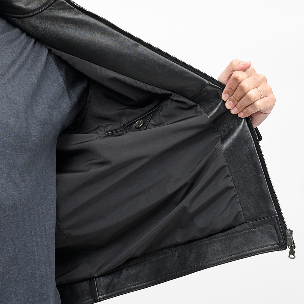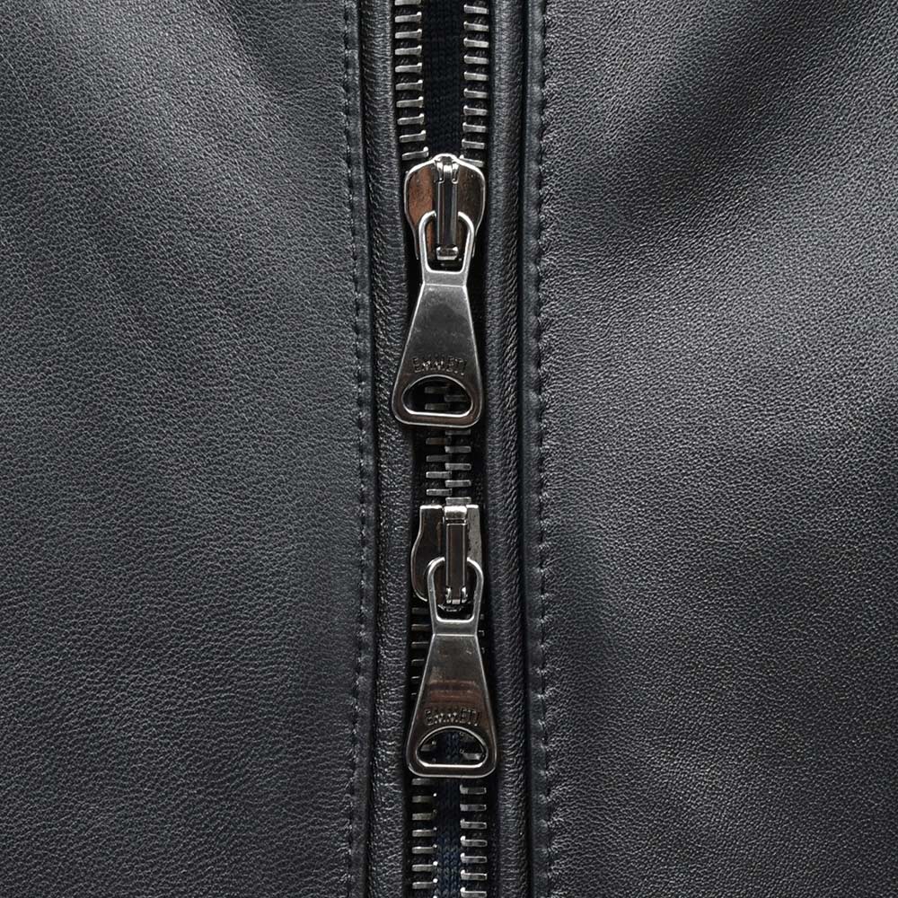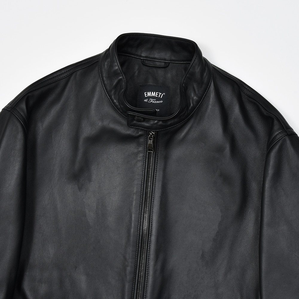 こちらは、上質なラムスキンナッパレザーを0.7mmの厚さに仕上げた、EMMETIの大定番“ナッパチェラータ”を使用。ビッグメゾンも採用するスペイン産のナッパレザーは、キメ細やかなで柔らかな着心地で、モチッとした質感にほんのりと光沢感を持つ、EMMETIと言えばなファブリックになります。
