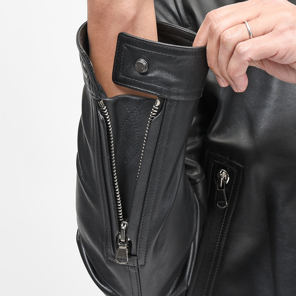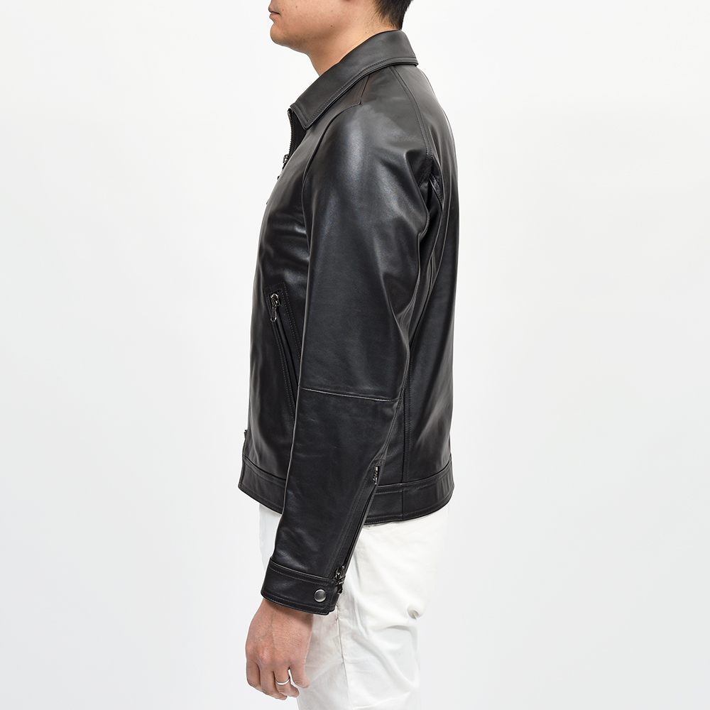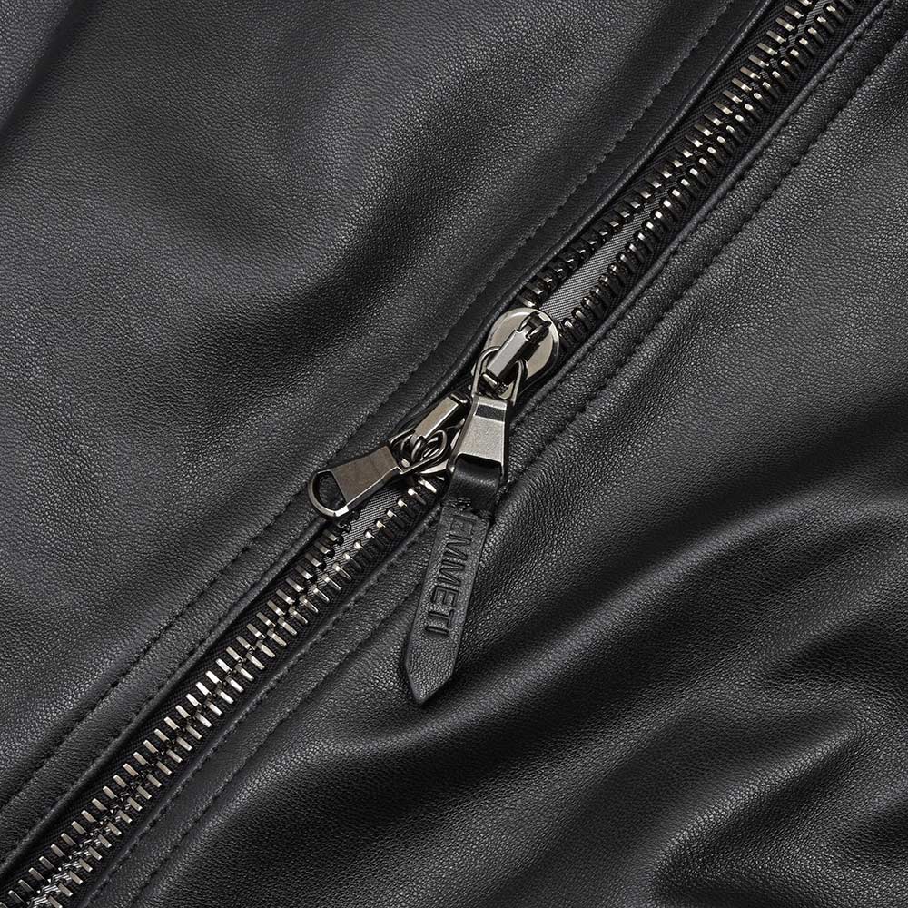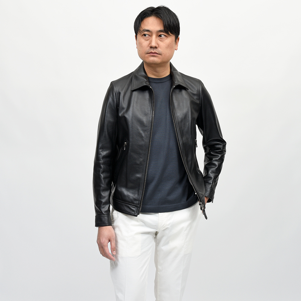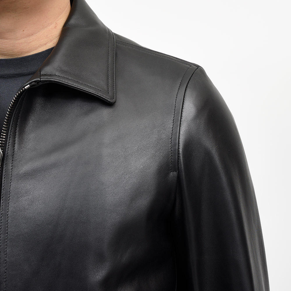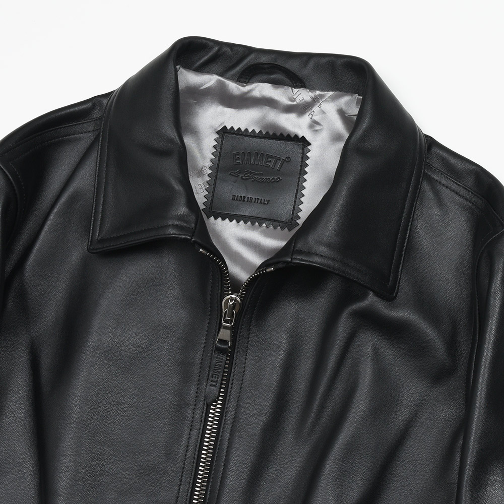 こちらは、上質なラムスキンナッパレザーを0.7mmの厚さに仕上げた、EMMETIの大定番“ナッパチェラータ”を使用。ビッグメゾンも採用するスペイン産のナッパレザーは、キメ細やかなで柔らかな着心地で、モチッとした質感にほんのりと光沢感を持つ、EMMETIと言えばなファブリックになります。ジップはシンプルなシルバージップを採用することで、普遍的なレザージャケットのとしての佇まいを生んでいます。