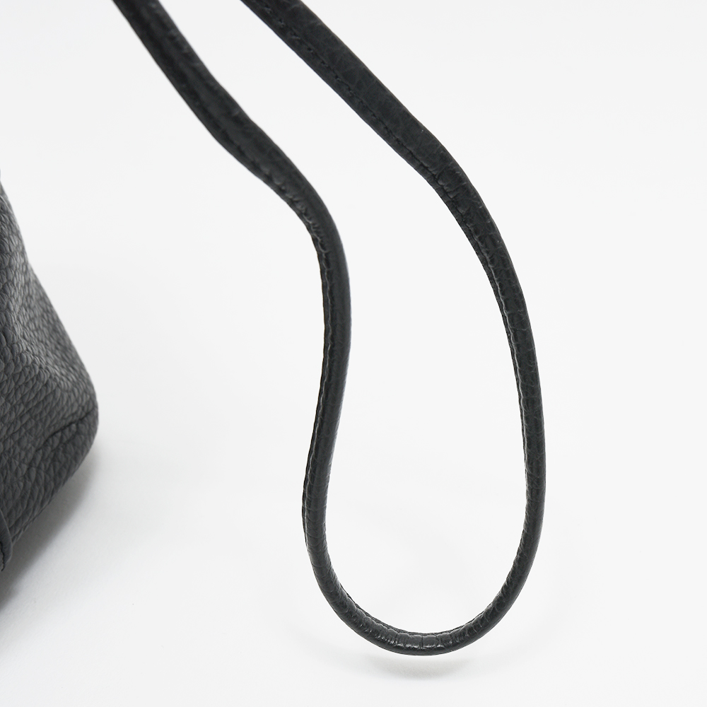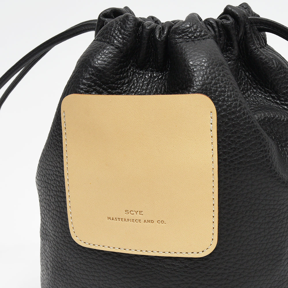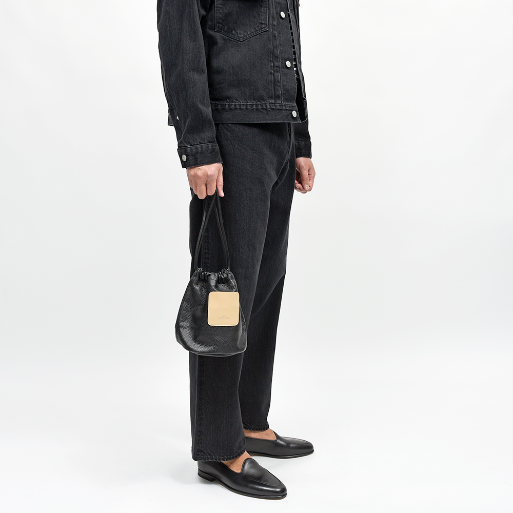 非常に柔らかなシュリンクレザーを使用した巾着型バッグ。ミニマルなデザインですが、上質な革の質感や、フロント部分にはちょっとしたポケットにもなっているブランドロゴが刻印されたレザーパーツがアクセントに。財布やスマートフォン、ハンカチなどの小物を入れても余裕のあるサイズ感は日常使いに打って付け。また、キズが付きにくいシュリンクレザーですので、デイリーユースで持ちやすいアイテムとなっています。