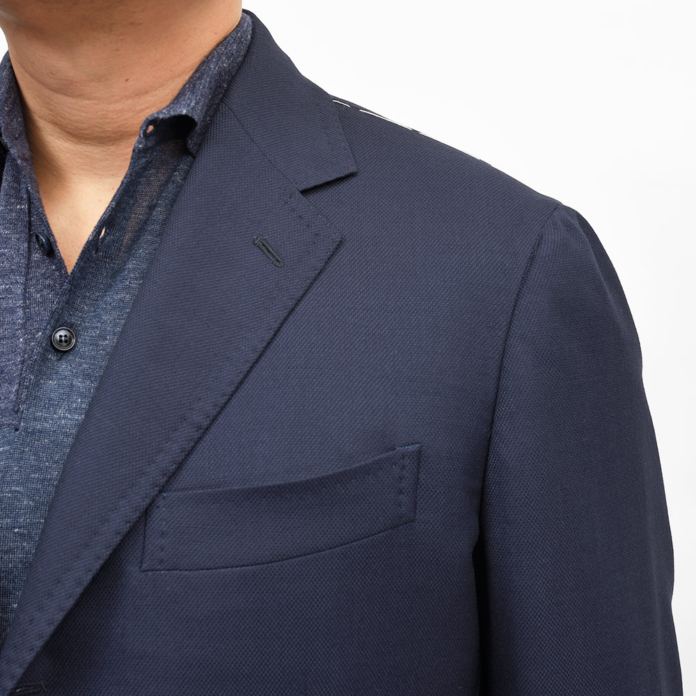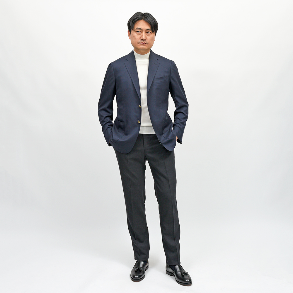 少し着丈の短いモダンなシルエットを誇るモデル“LEO”をベースに、ラペル幅が9cmに変更されましたモデル“VINCENZO”。自身の名前を付けるという、ヴィンチェンツォ氏の自信のほどが伺えるringで定番のモデルです。