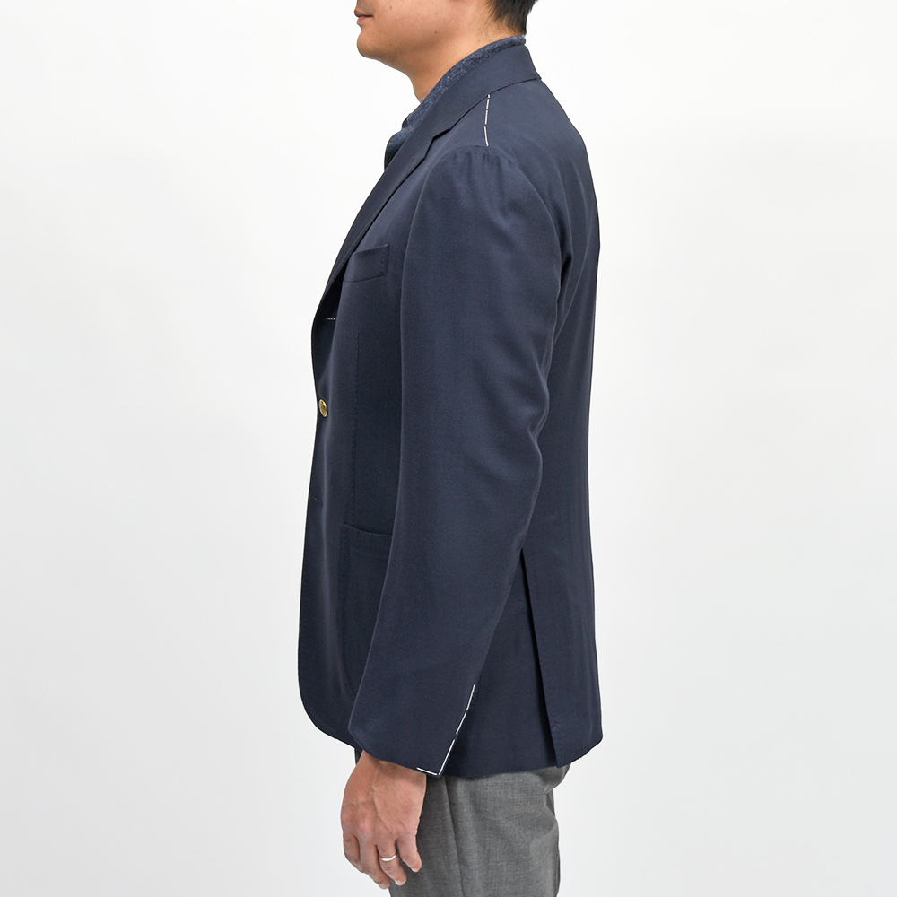 2パッチポケット、サイドベンツ、ラペル巾9cm、袖アンフィニッシュド(本切羽・開き見せなどの釦付け修理が必要)です。