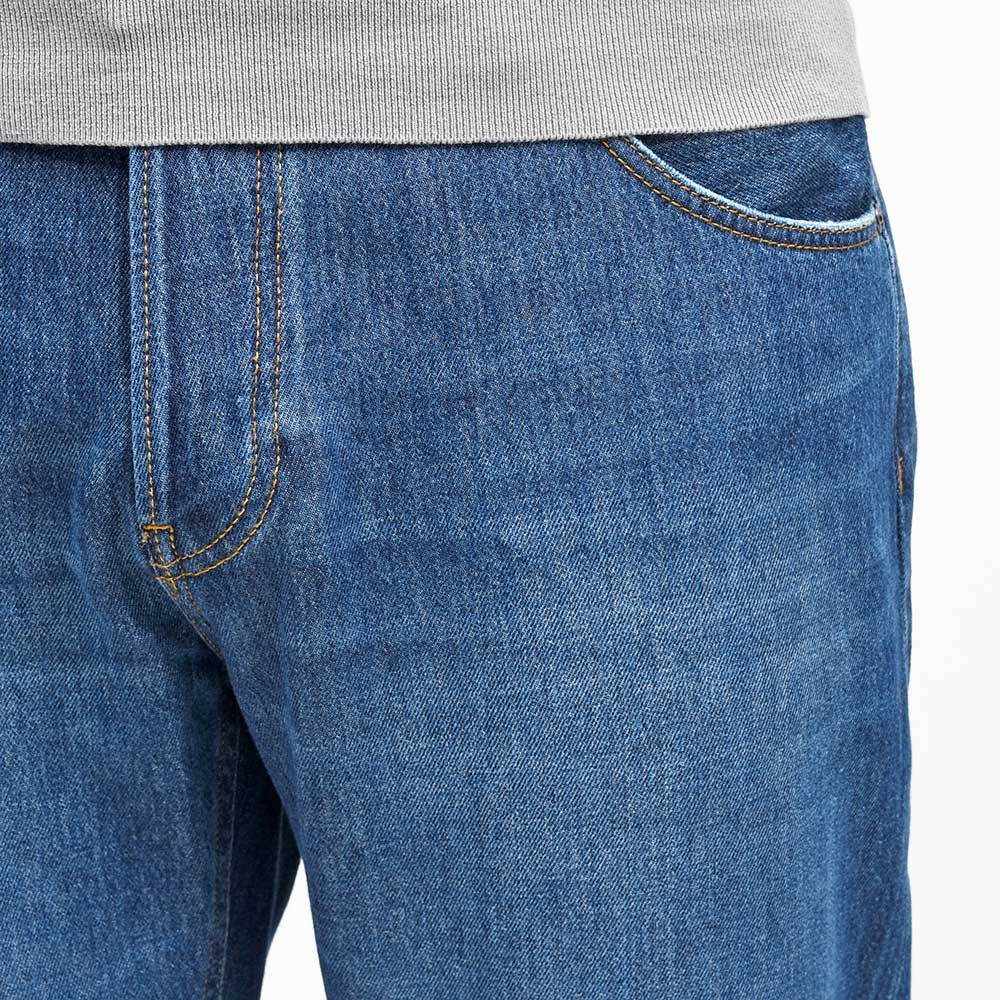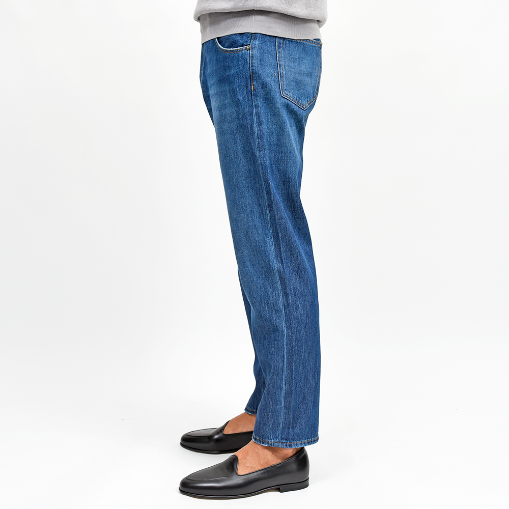 PT TORINO DENIMでは非常に稀なストレッチなしのコットン100%ファブリックを使用したこちらは、緩めのシルエットの入門編として人気を誇る定番モデルの“REBEL”。美しいトーンのインディゴブルーに、程よくウォッシュド加工を施した使い勝手の良い一本です。ガンメタリックのボタン&リベットに、ライトブラウンのステッチ使いは上品な佇まい。さらに高級感のあるスエードの革パッチが大人の色気を演出してくれます。