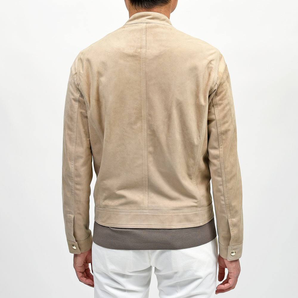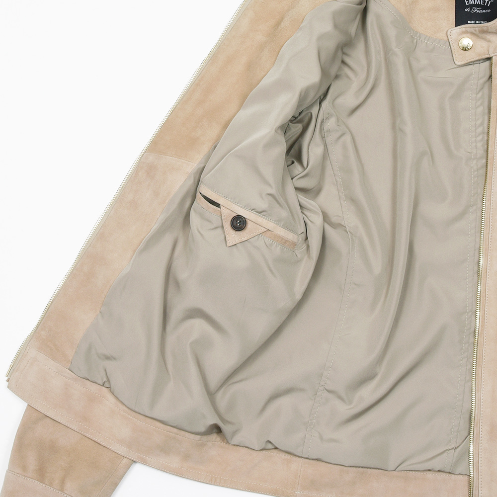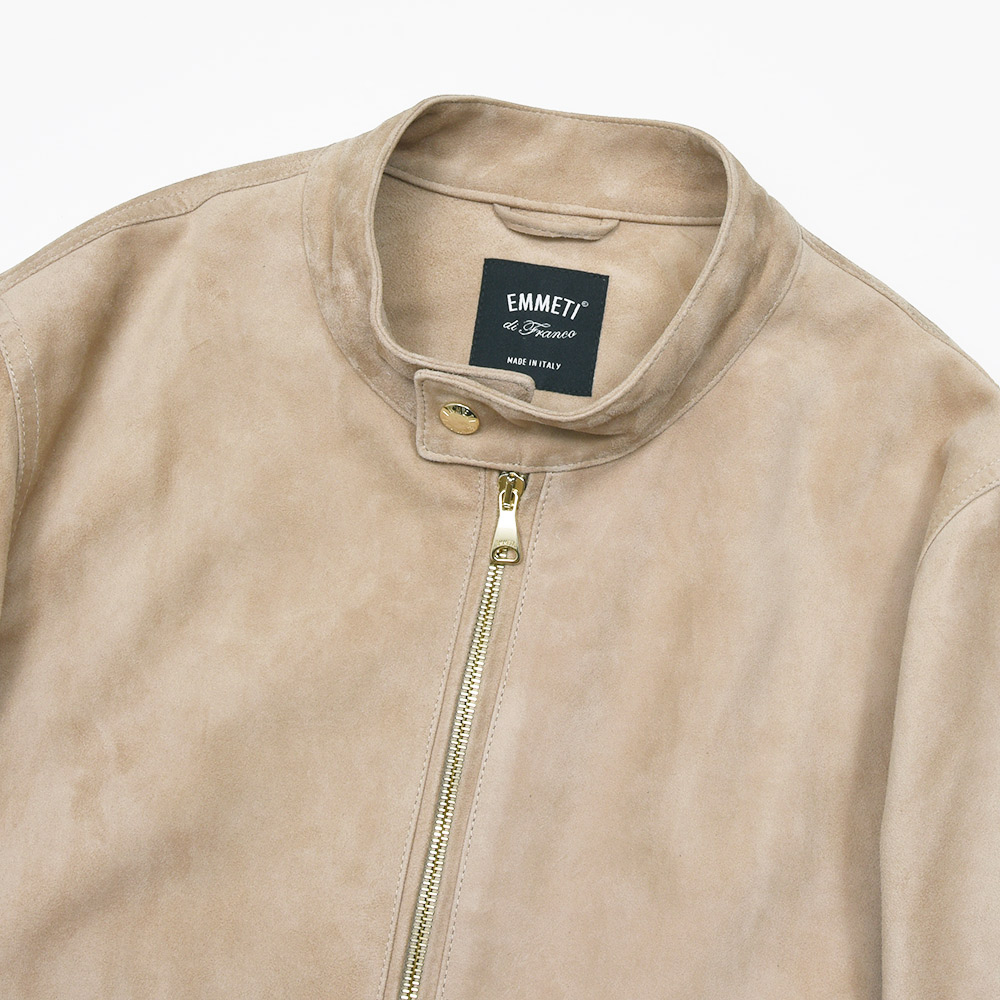 通常ラグジュアリーブランドで使用されているクオリティのレザーを、限りある着数分だけオーダーできる“SPレザー”シリーズ。こちらはEMMETI社で定番のゴートスエードよりも、一格高いクオリティのファブリックになります。滑らかで柔らかな質感に、非常にきめ細やかでしっとりとした滑りのあるタッチ。スエードのJURIをすでにお持ちの方には勿論、一着目からでも高い満足感を得ることのできるスペシャルな一品となっています。