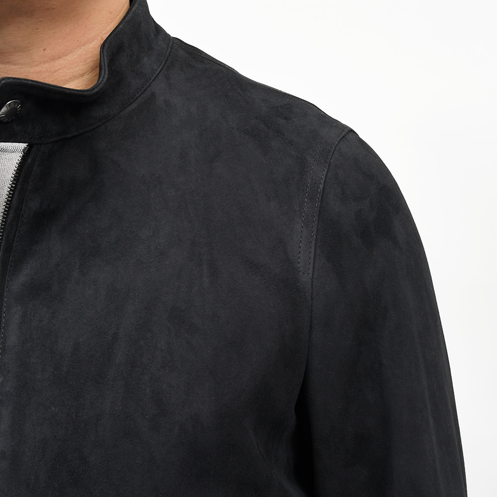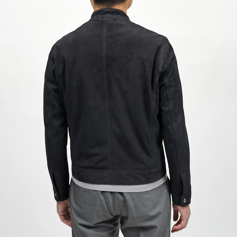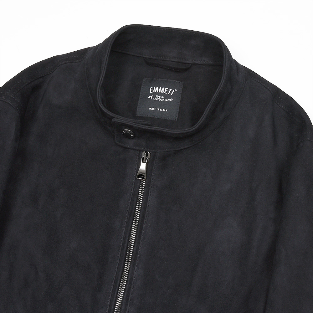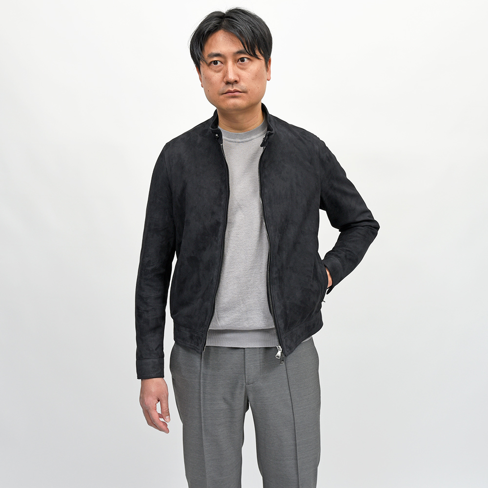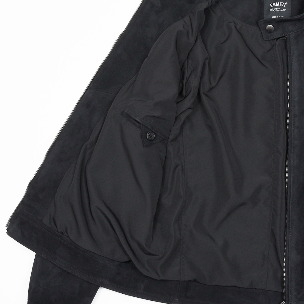 通常ラグジュアリーブランドで使用されているクオリティのレザーを、限りある着数分だけオーダーできる“SPレザー”シリーズ。こちらはEMMETI社で定番のゴートスエードよりも、少しだけ薄手なラムスエードを使用しています。滑らかで柔らかな質感に、非常にきめ細やかでしっとりとした滑りのあるタッチ。スエードのJURIをすでにお持ちの方には勿論、一着目からでも高い満足感を得ることのできるスペシャルな一品となっています。