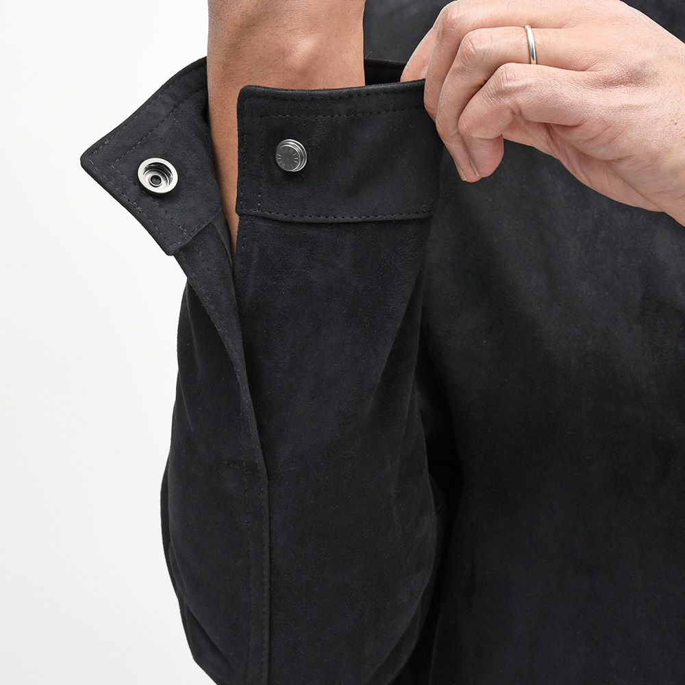 モダンなブラックカラーのライダースですが、ラムスエードの極上な質感が程よくシックで大人な佇まいを作り上げてくれます。