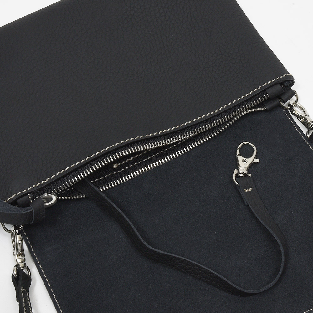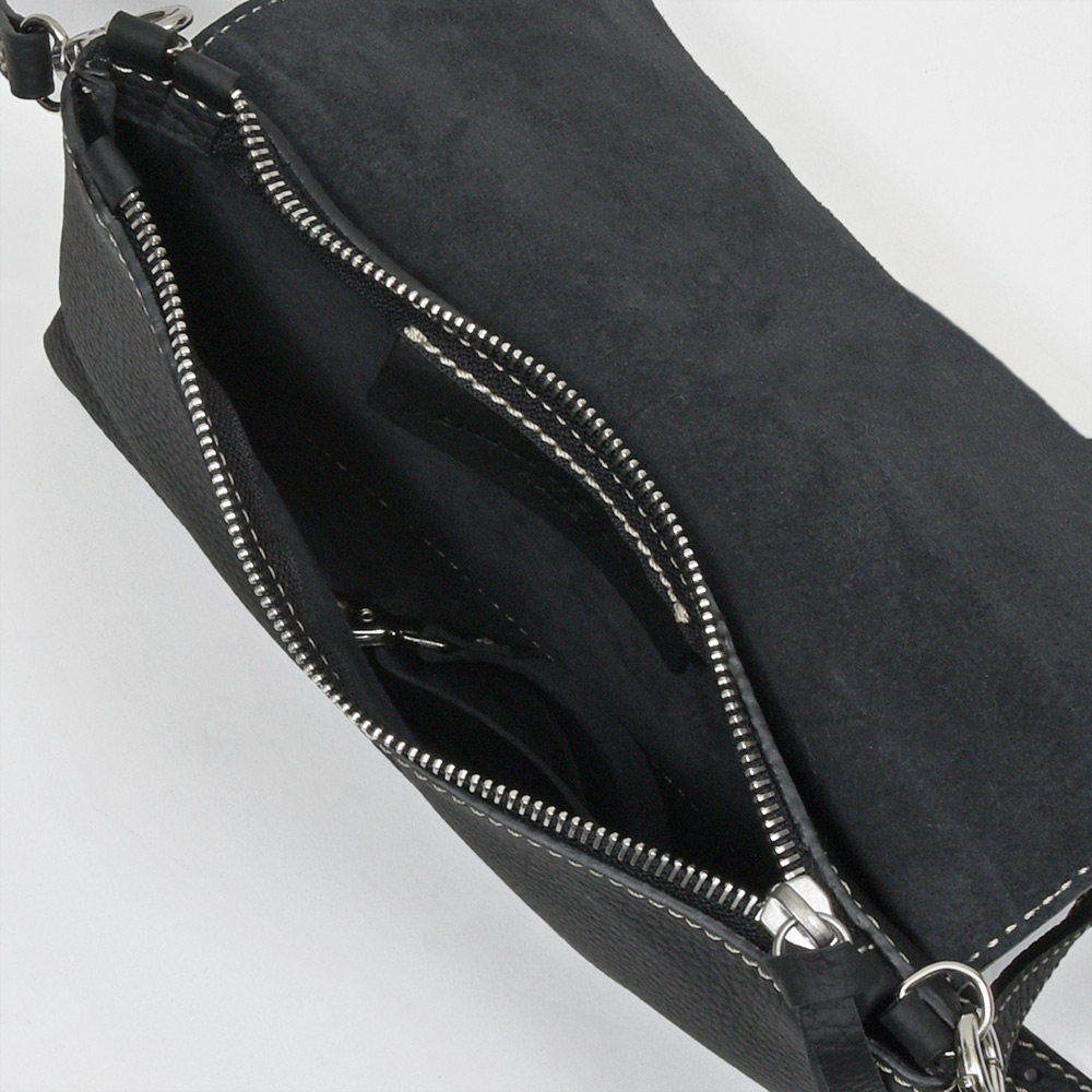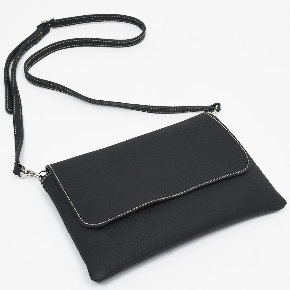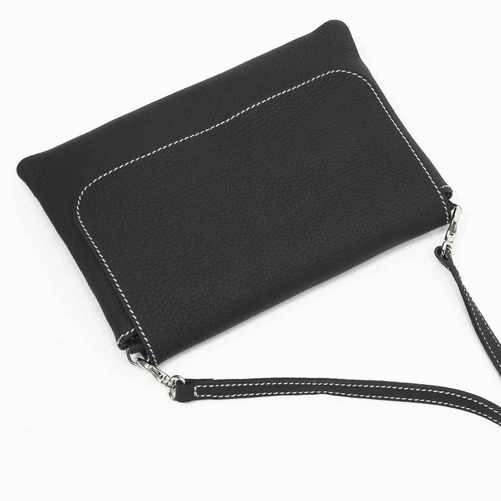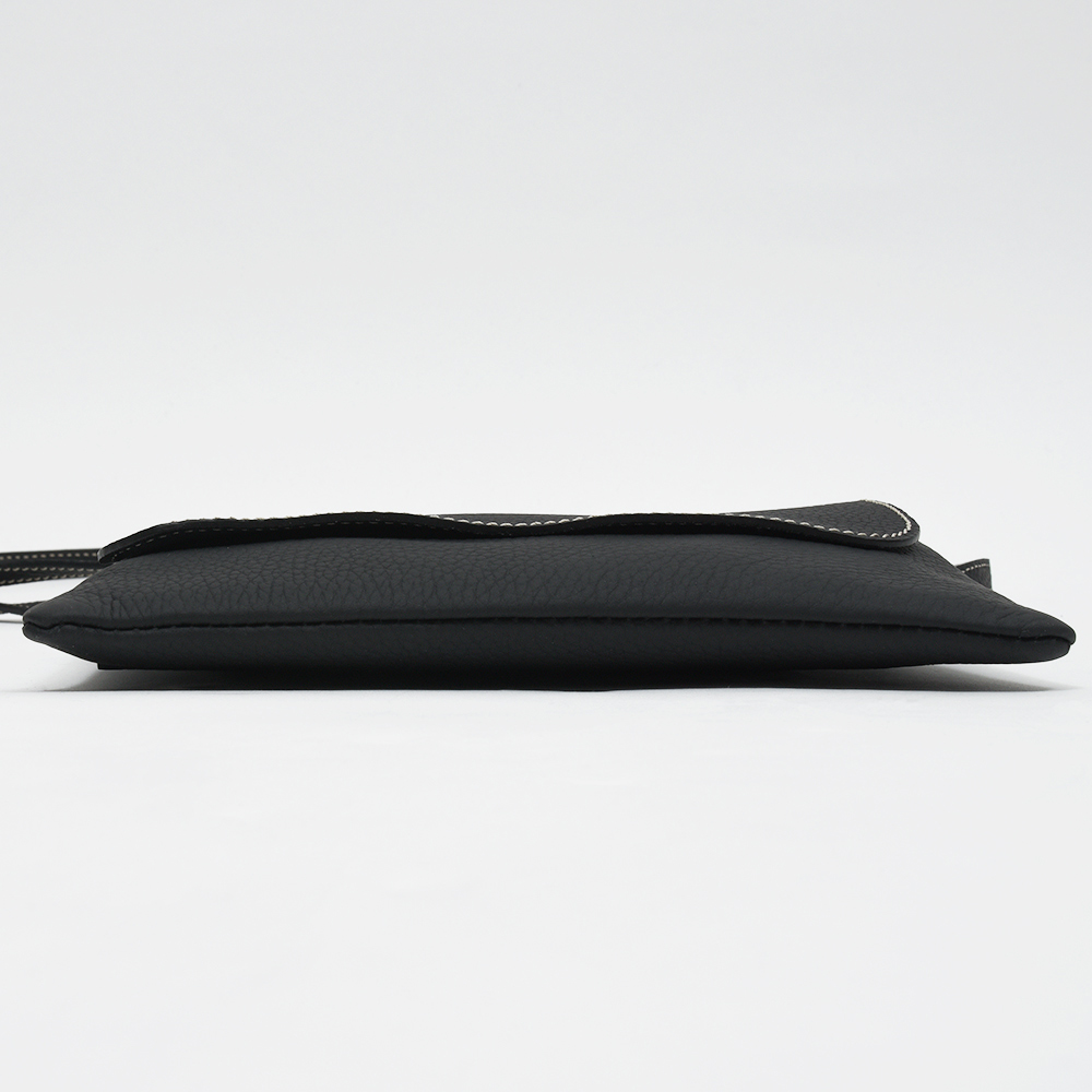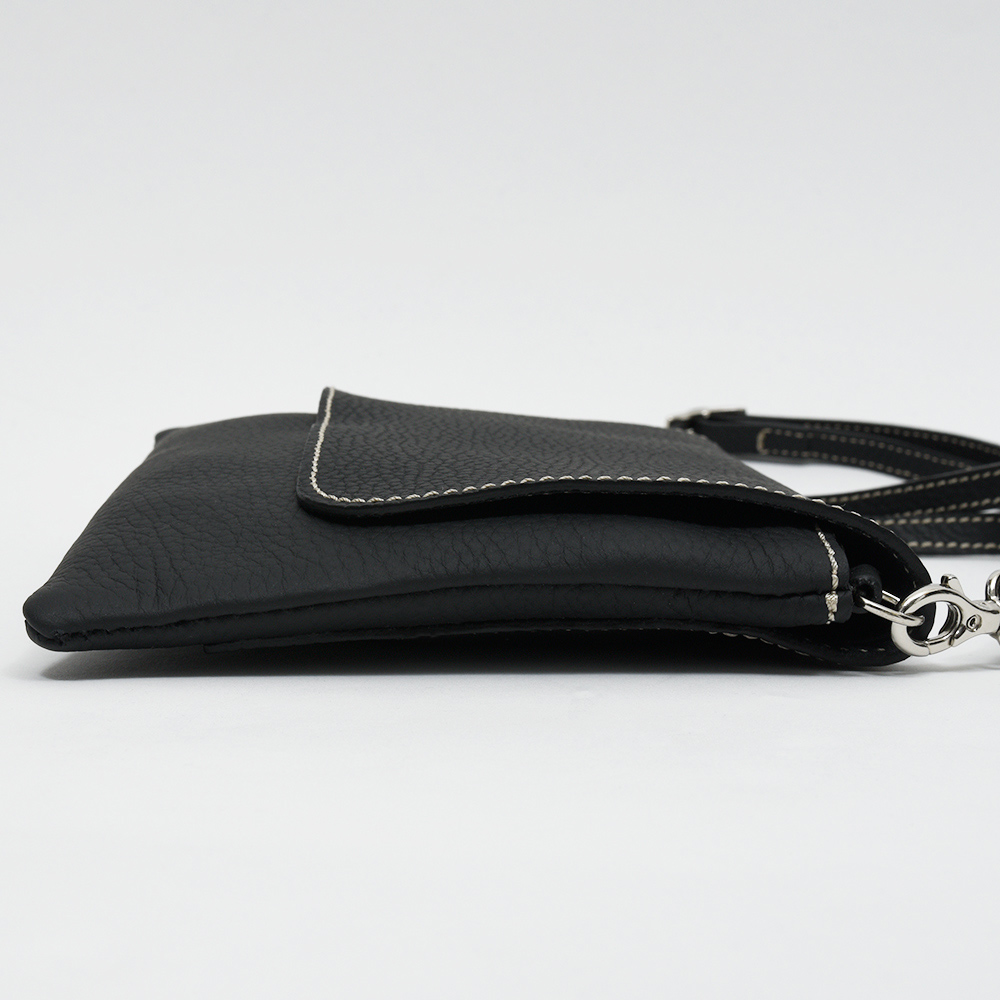 マチ幅の少ないサコッシュ型のショルダーバッグ“Colette S”。ちょっとした外出や、サブのバッグとして活躍するサイズ感ですが、スリットとジップ式の2つの収納箇所が設けられているため、収納物を分けて整理することができます。ショルダーストラップは取り外すことができるため、クラッチバッグやバッグインバッグとしても活躍してくれます。通常はジップ式のポケットにカードスロットがついていますが、こちらはカードスロットを無くした仕様でオーダーしています。