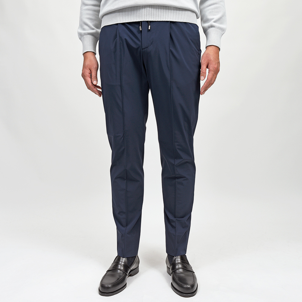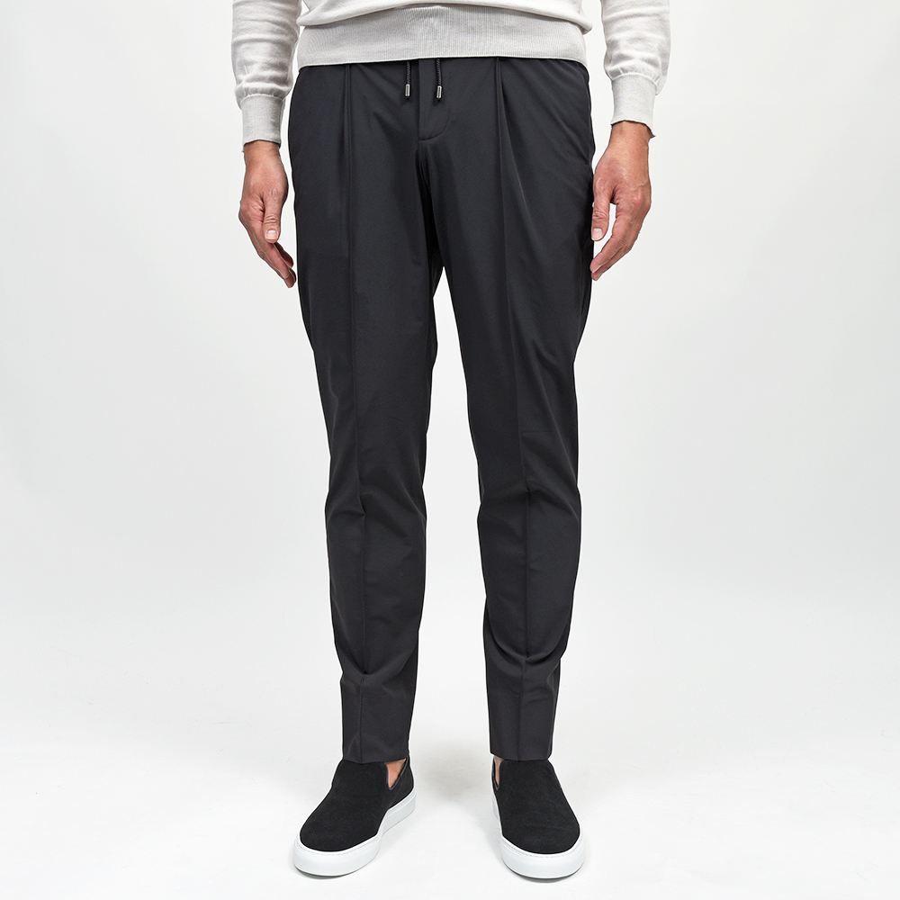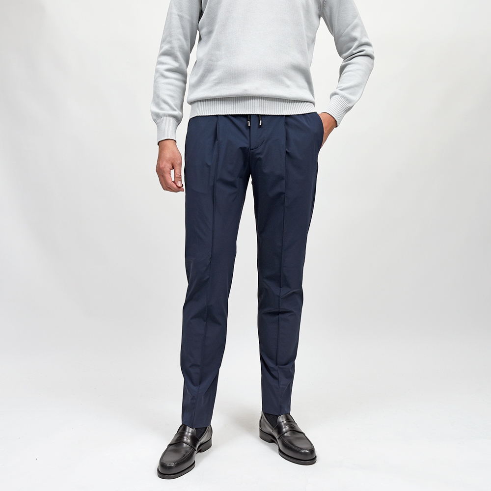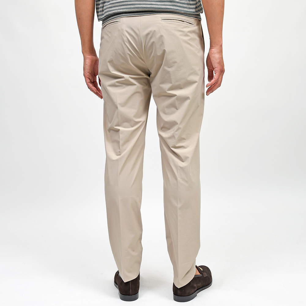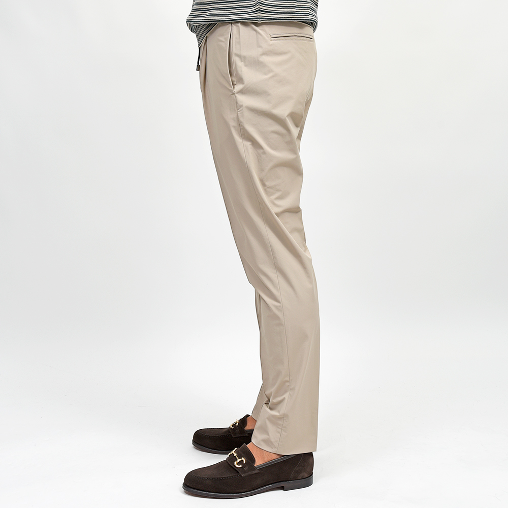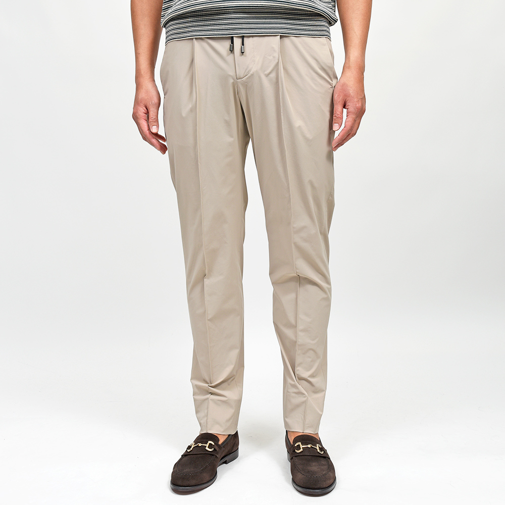 MASACCIOはフロントクリースをステッチで抑えることで、美しいラインがいつまでも続く永遠を約束された特別な一本です。ウエストのサイドにはゴムが入っており、ウエストは4cmほど伸縮してくれるリラックスした穿き心地。ドローコードは内側に隠すことができるため、ベルトを巻くとビジネスにも対応する、リラック顔にもドレス顔にも変化の効く万能なアイテムです。